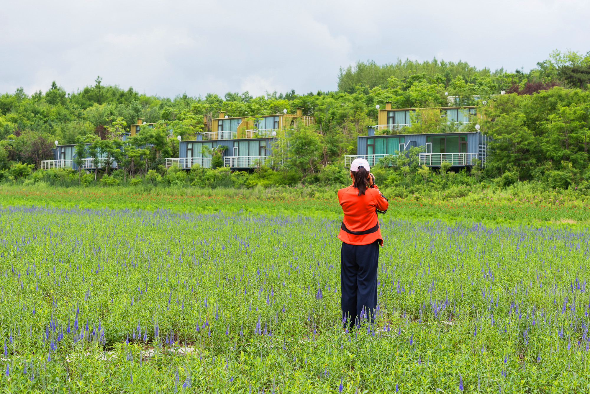 关于住宿游玩,可以到缘山湖度假村,这里地处山坳中,四面的青山绿树。一座座集装箱式的精品民宿隐藏其中,有日式榻榻米,标准的双人间。依山而建的小屋,推开窗户眼前就是一片紫色的花海。小伙伴戏称这不是在双阳,这简直就是世外桃源。寂静的只有鸟鸣虫叫,眼前有的只是一笼笼的田地,一丛丛的绿色。除了蓝天白云,剩下的就是花中飞舞的蝴蝶,林中的蛐蛐声。