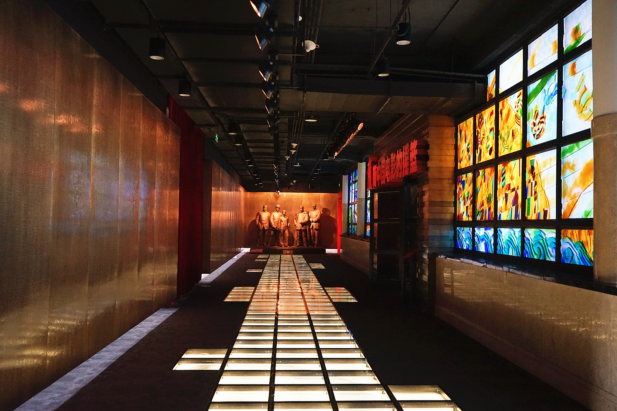 通往博物馆的入口处,这里要仔细的看脚下。这是1937年“满映”建厂时日本人镶嵌的两条马赛克青龙图案,青龙中间是“满映”的建筑平面图,五彩斑斓的琉璃墙壁尽头是五位创始人的雕像。