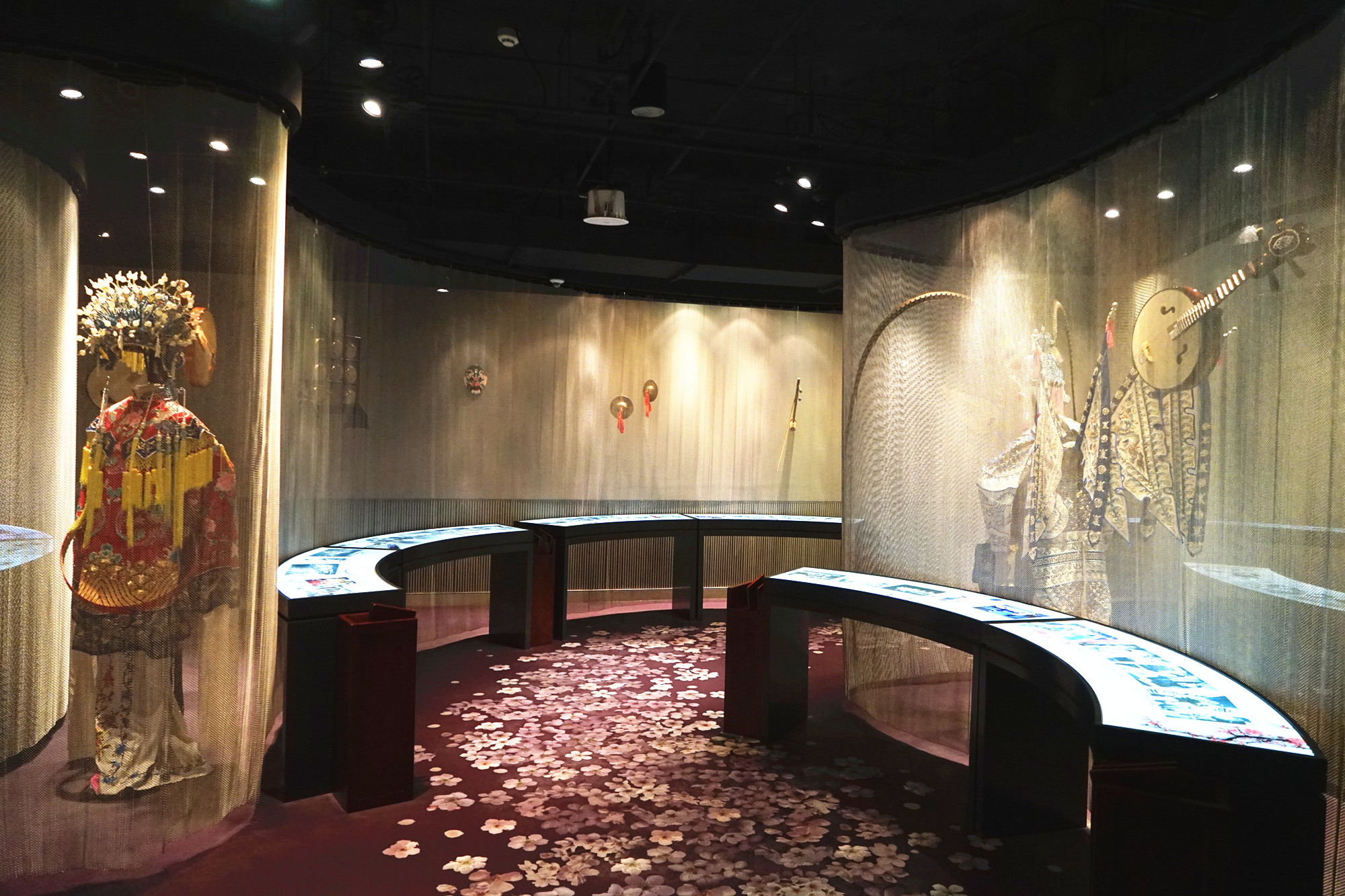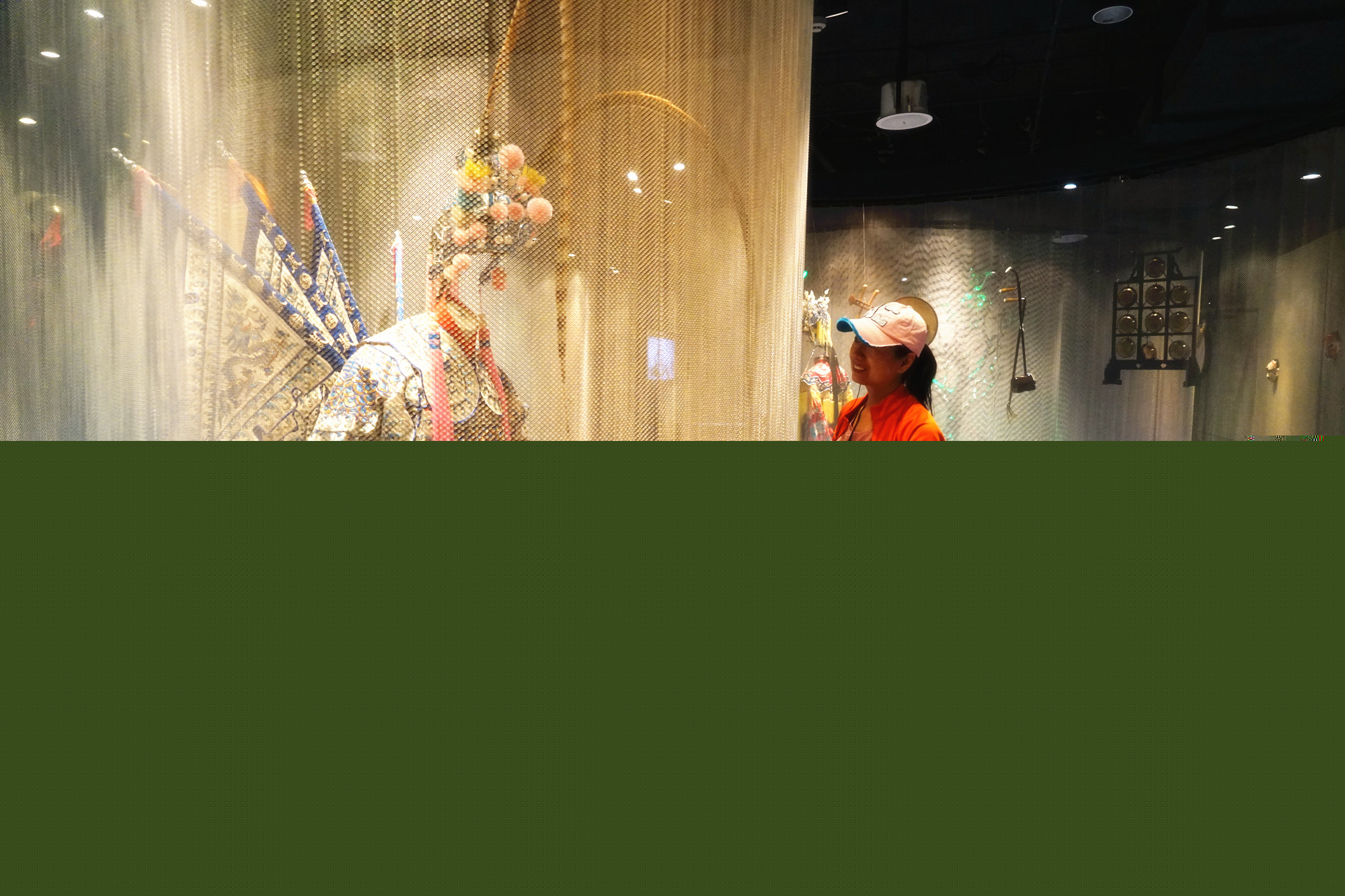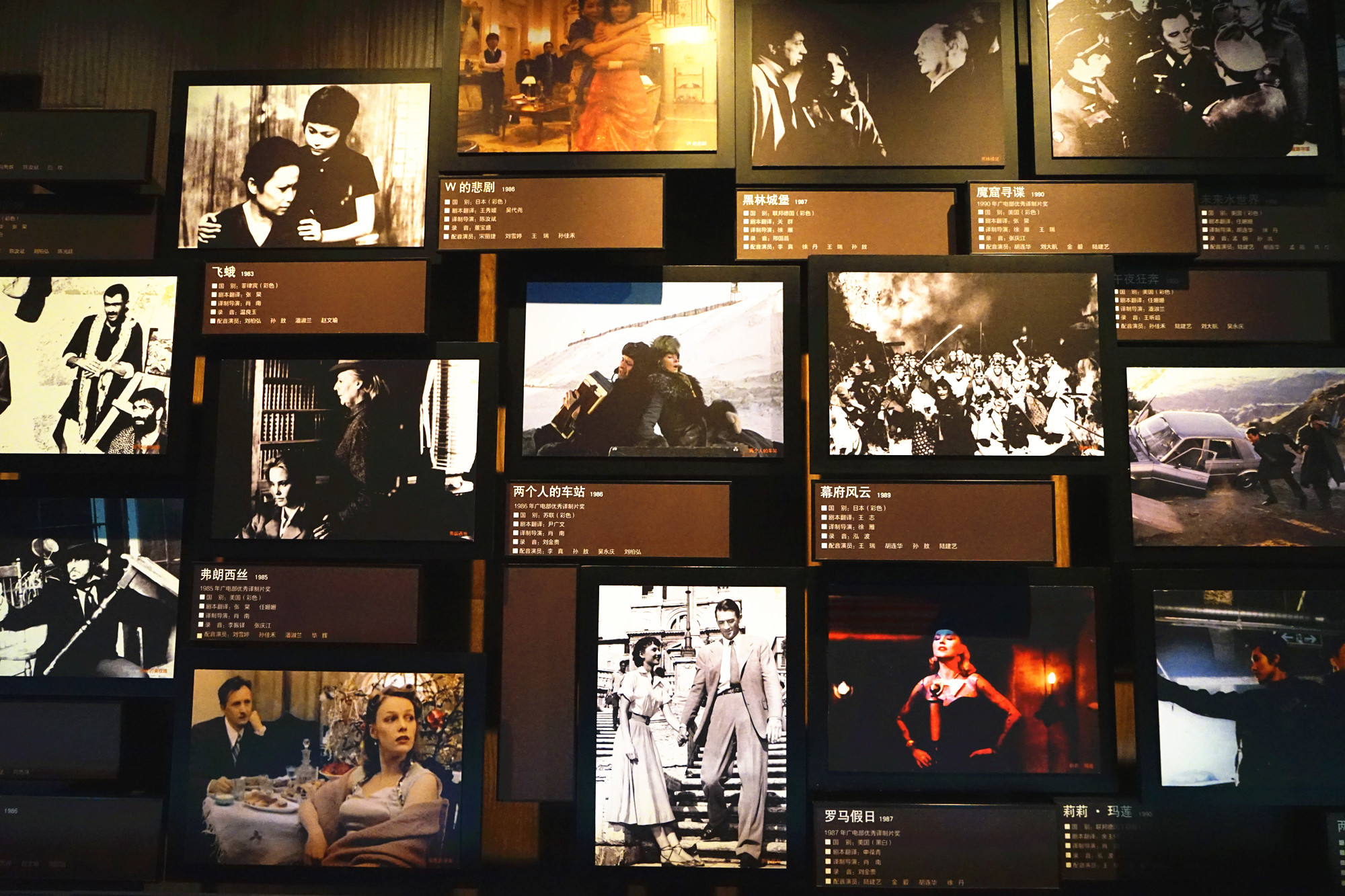 我很喜欢这里的戏曲片展区,唯美的再现国粹京剧服装,朦胧的珠帘与地上的朵朵梅花相映成趣。让人想在这里拍照,没忍住还是留了一张影。这里展示的是长影拍过的京剧,昆曲、汉剧、秦腔和影响较广的评剧、豫剧等。