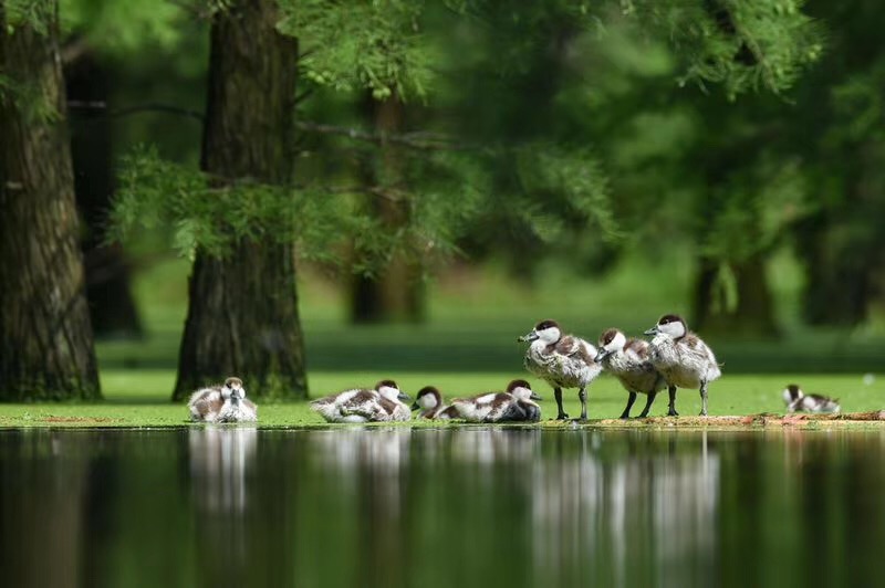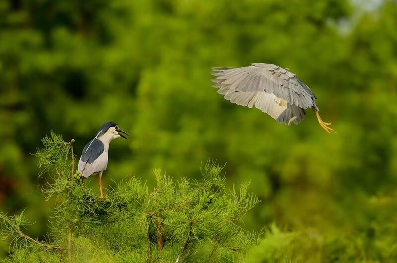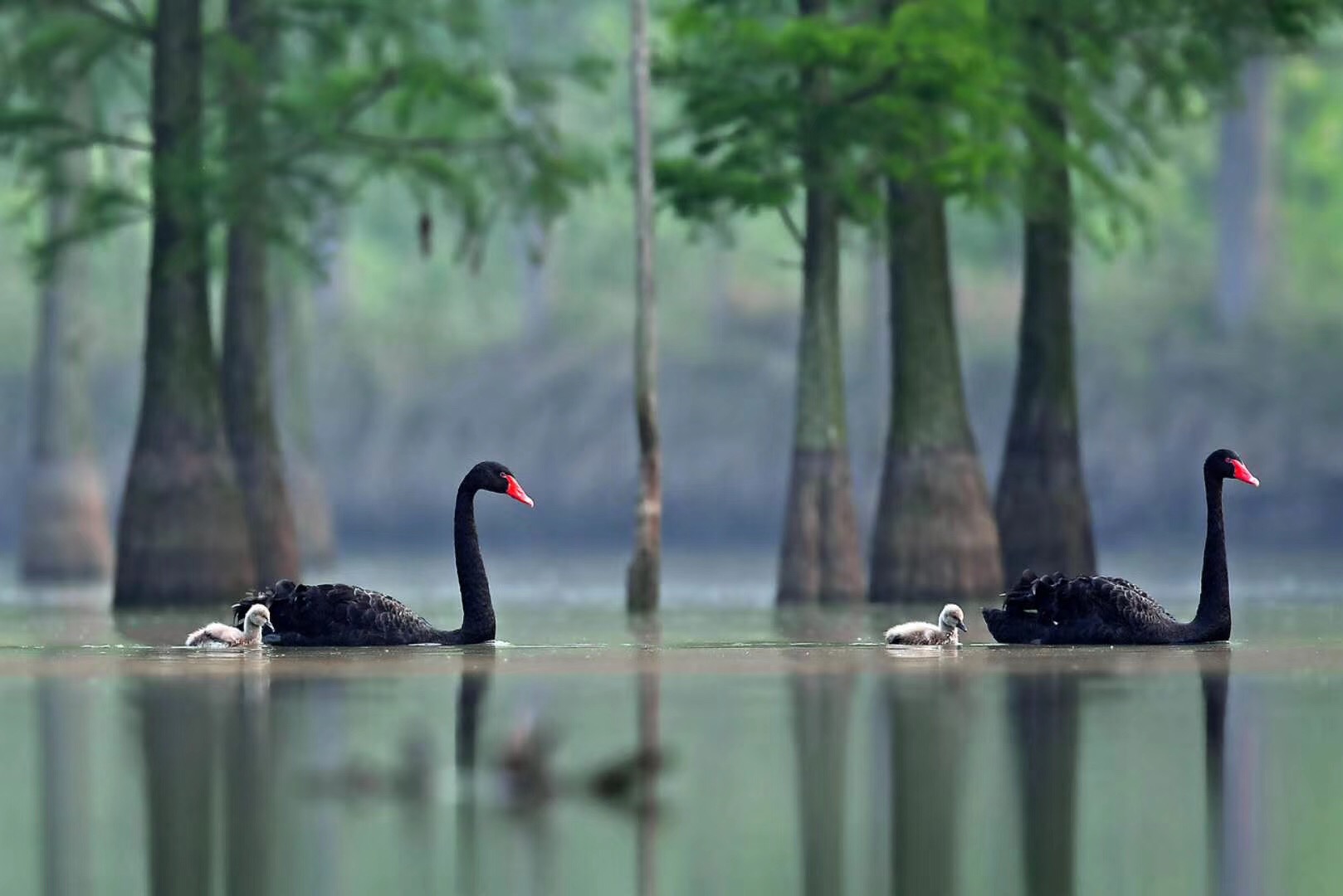 这是华东地区最大的池杉树林,有100多种野生鸟类,近10万只鸟儿在这里安家,繁衍生息。夏日的池杉林翠绿清幽,沁人心脾。乘着船儿穿梭于参天的池杉林中,欣赏着近在咫尺的各种鸟儿,犹如进入鸟的天堂。跟随者黑天鹅妈妈一起游玩的小天鹅,楚楚动人,惹人怜爱。不知名的鸟儿会在高高的树顶安家抚育自己的下一代,所以千万不要惊扰它们的安逸生活,只要远远的观望就可以。