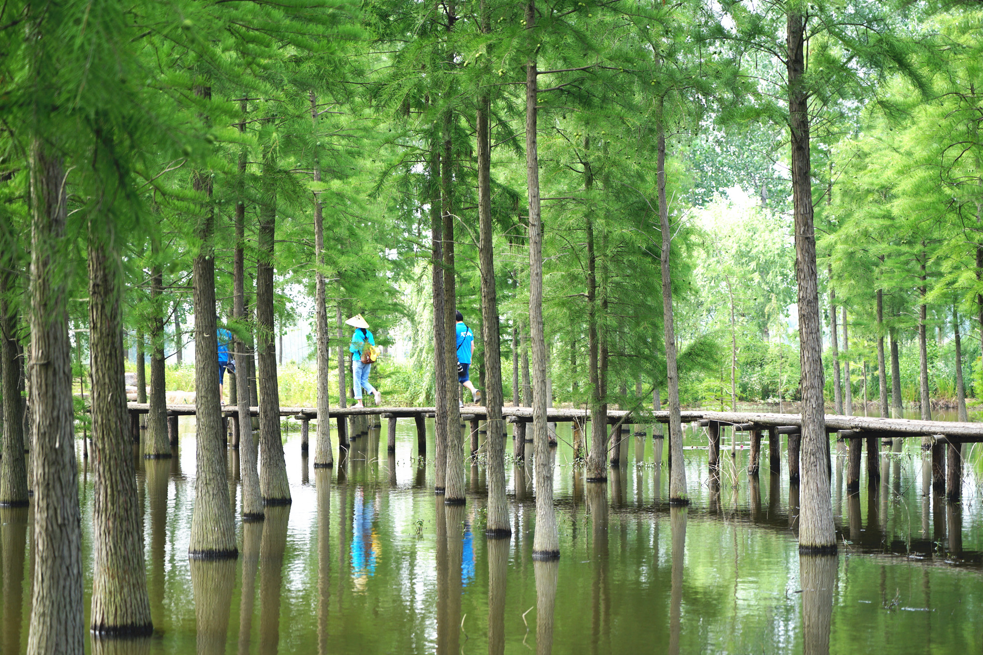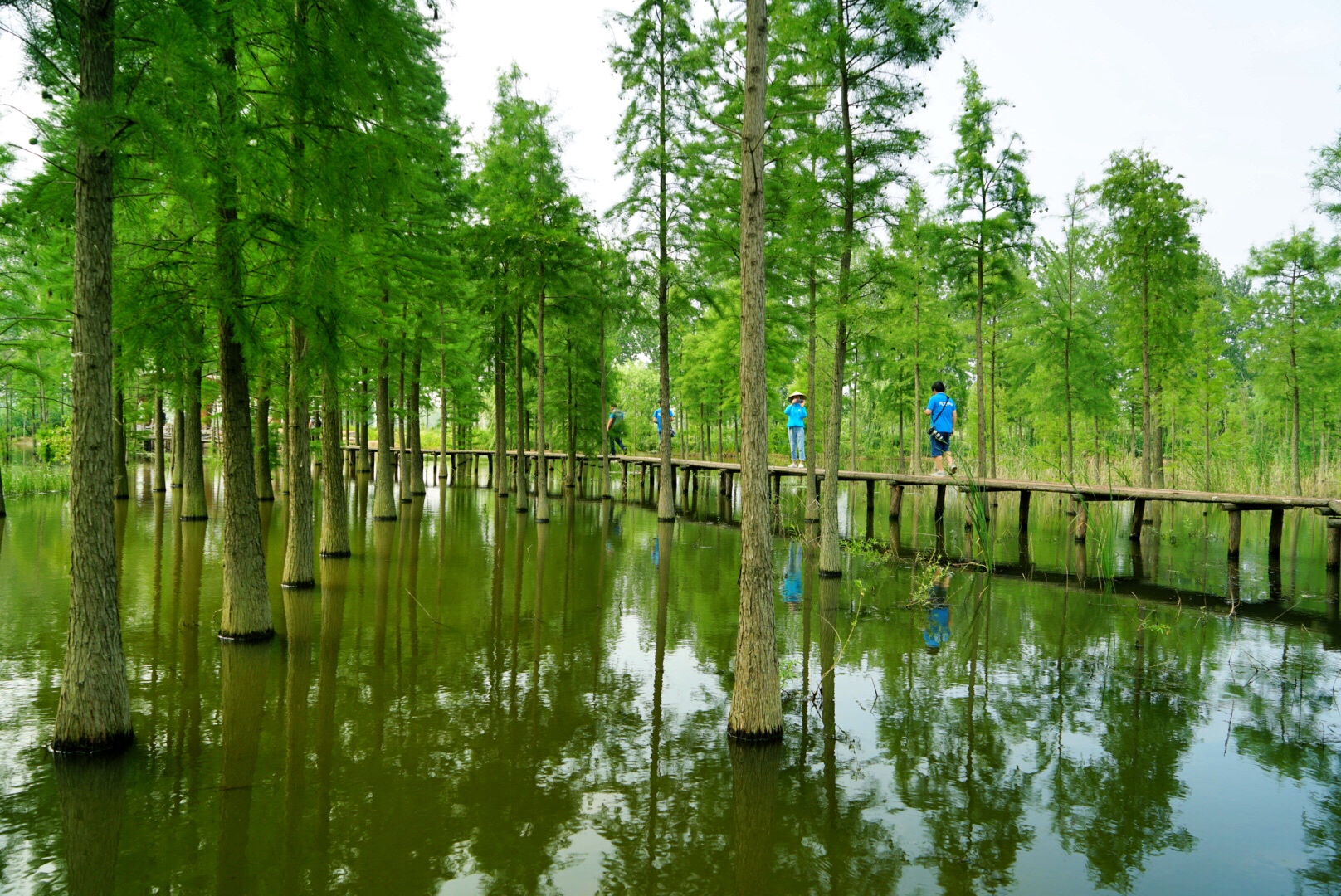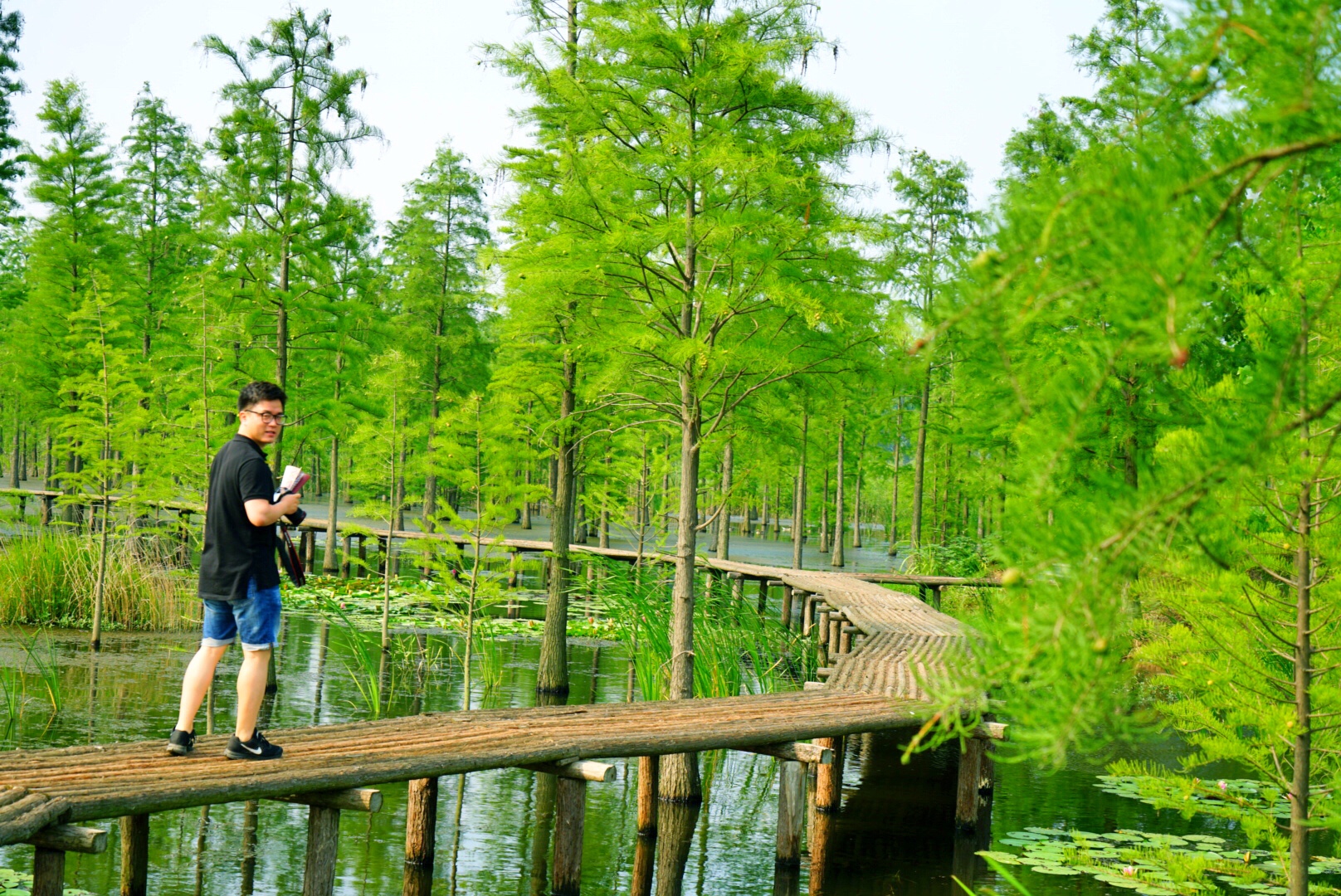 穿过荷塘再上岸,走个几分钟的路,就来到了小池杉林。为什么叫小池杉林,因为要退耕还湿,更好的保护里面最大的池山林,这些不大的池杉树都是后期补种的,有约两万棵。因池杉树生长于水中,其移植补种的难度相对较大,成活率低。所以贯穿整个小池杉林的木栈道,全部采用的就是未能存活的池杉树干,故名“池杉栈道”。漫步池杉栈道,置身静谧林中深处,蓝天白云下尽情的呼吸这纯净的空气。欣赏水中倒影婆娑,一恍惚就分不清真假。聆听林中鸟儿欢叫,是享受自然、放松身心的绝佳场所,所以在这里一定要多拍几张美照哦!