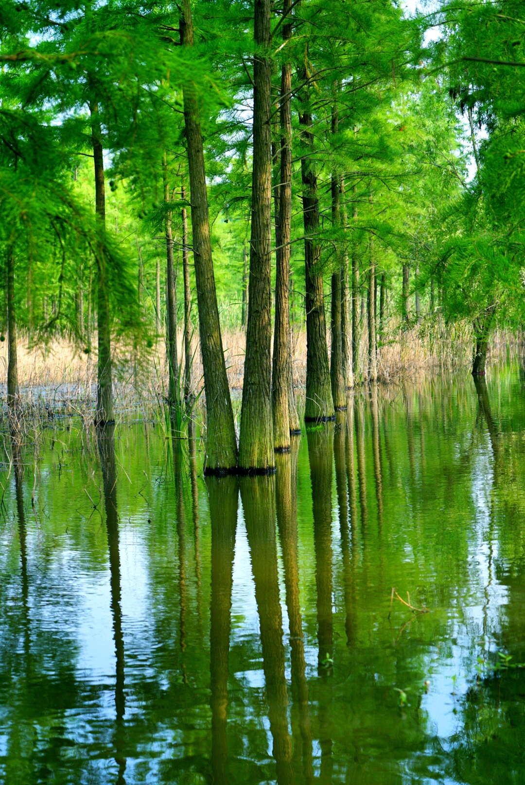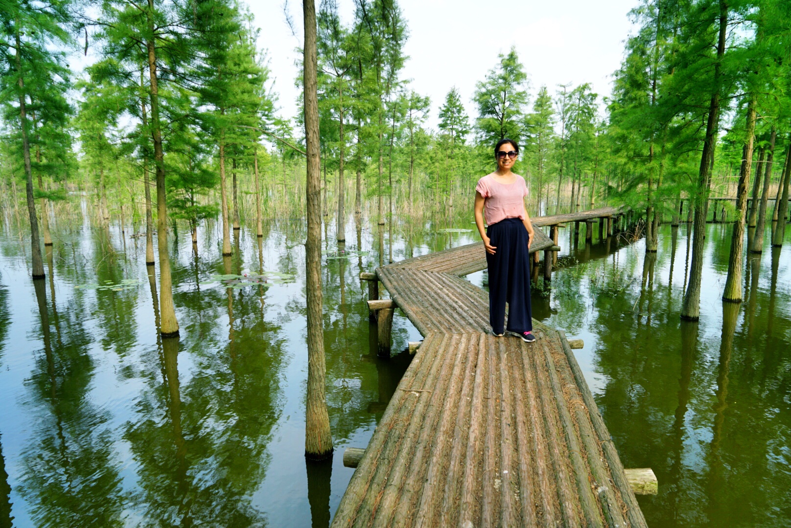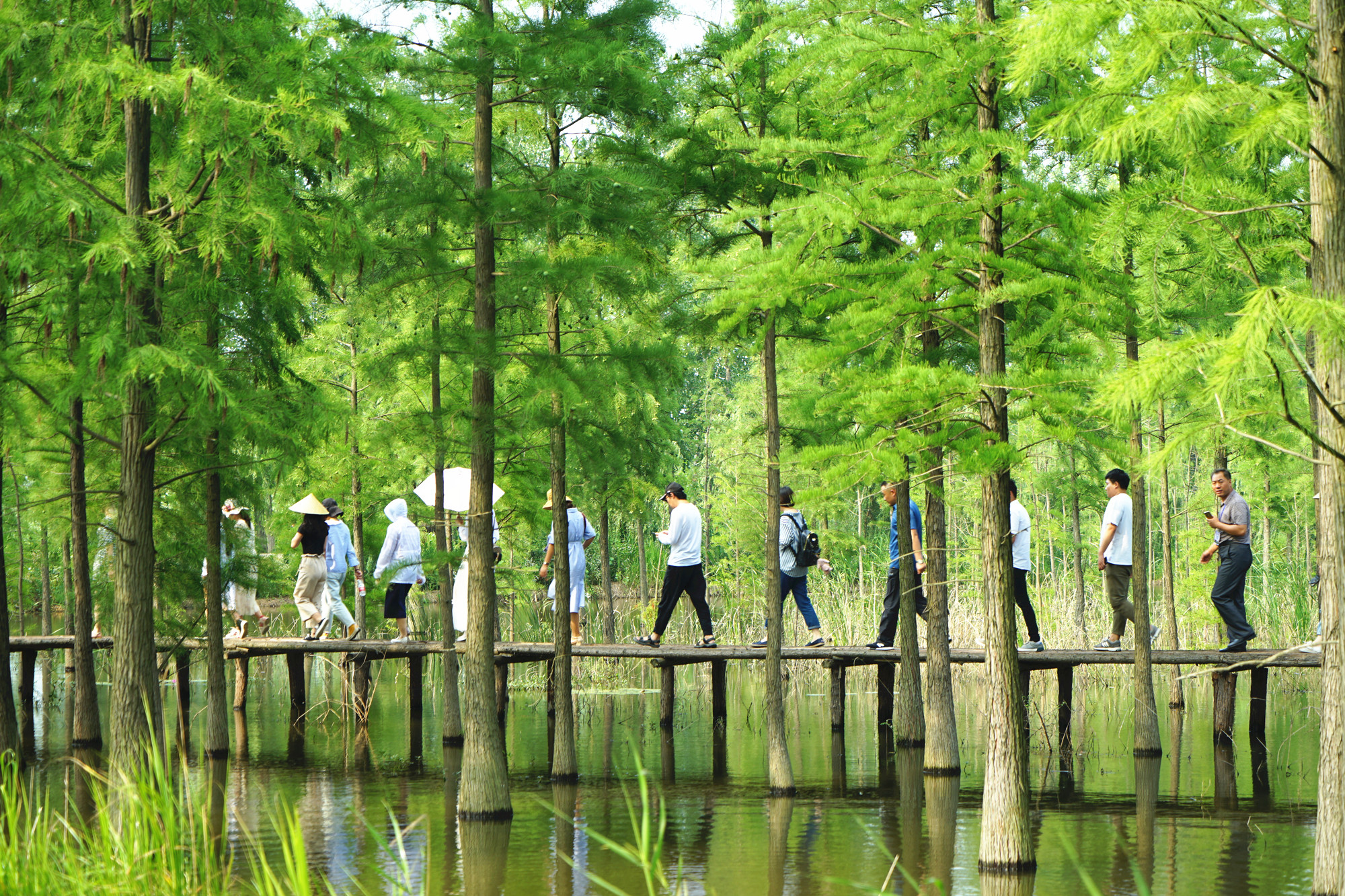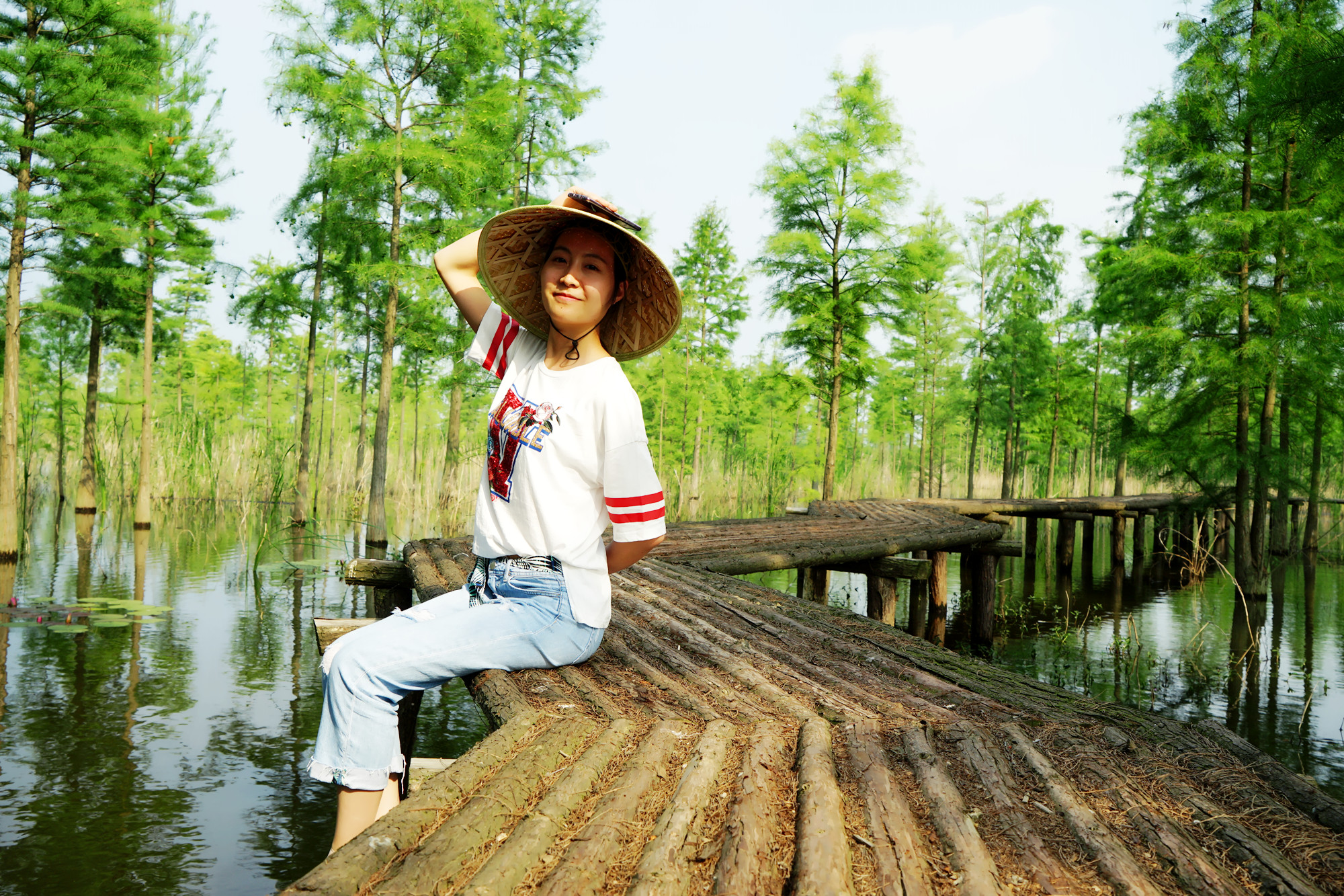 穿过荷塘再上岸,走个几分钟的路,就来到了小池杉林。为什么叫小池杉林,因为要退耕还湿,更好的保护里面最大的池山林,这些不大的池杉树都是后期补种的,有约两万棵。因池杉树生长于水中,其移植补种的难度相对较大,成活率低。所以贯穿整个小池杉林的木栈道,全部采用的就是未能存活的池杉树干,故名“池杉栈道”。漫步池杉栈道,置身静谧林中深处,蓝天白云下尽情的呼吸这纯净的空气。欣赏水中倒影婆娑,一恍惚就分不清真假。聆听林中鸟儿欢叫,是享受自然、放松身心的绝佳场所,所以在这里一定要多拍几张美照哦!