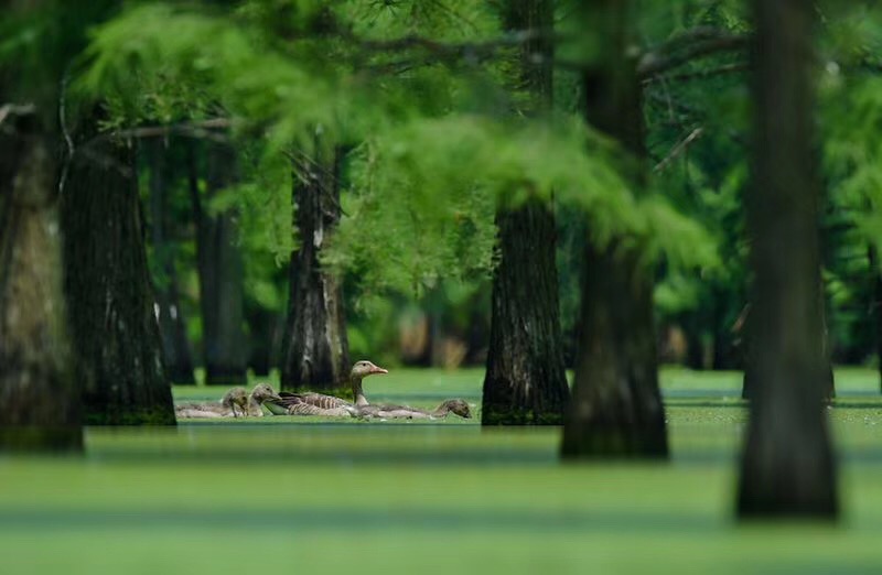 这里就是池杉湖国家湿地公园,位于安徽来安与江苏六合交界处。这里能有如此多的鸟儿,如此美的湿地生态环境,离不开人们对它的保护,维护。经过近40年的生长和13年的精心修复,池杉湖湿地中的池杉总数达到五万多棵、具有独特观赏价值的“水上森林”湿地景观,并成为长江下游沿江地区鸟类重要的集中栖居地。