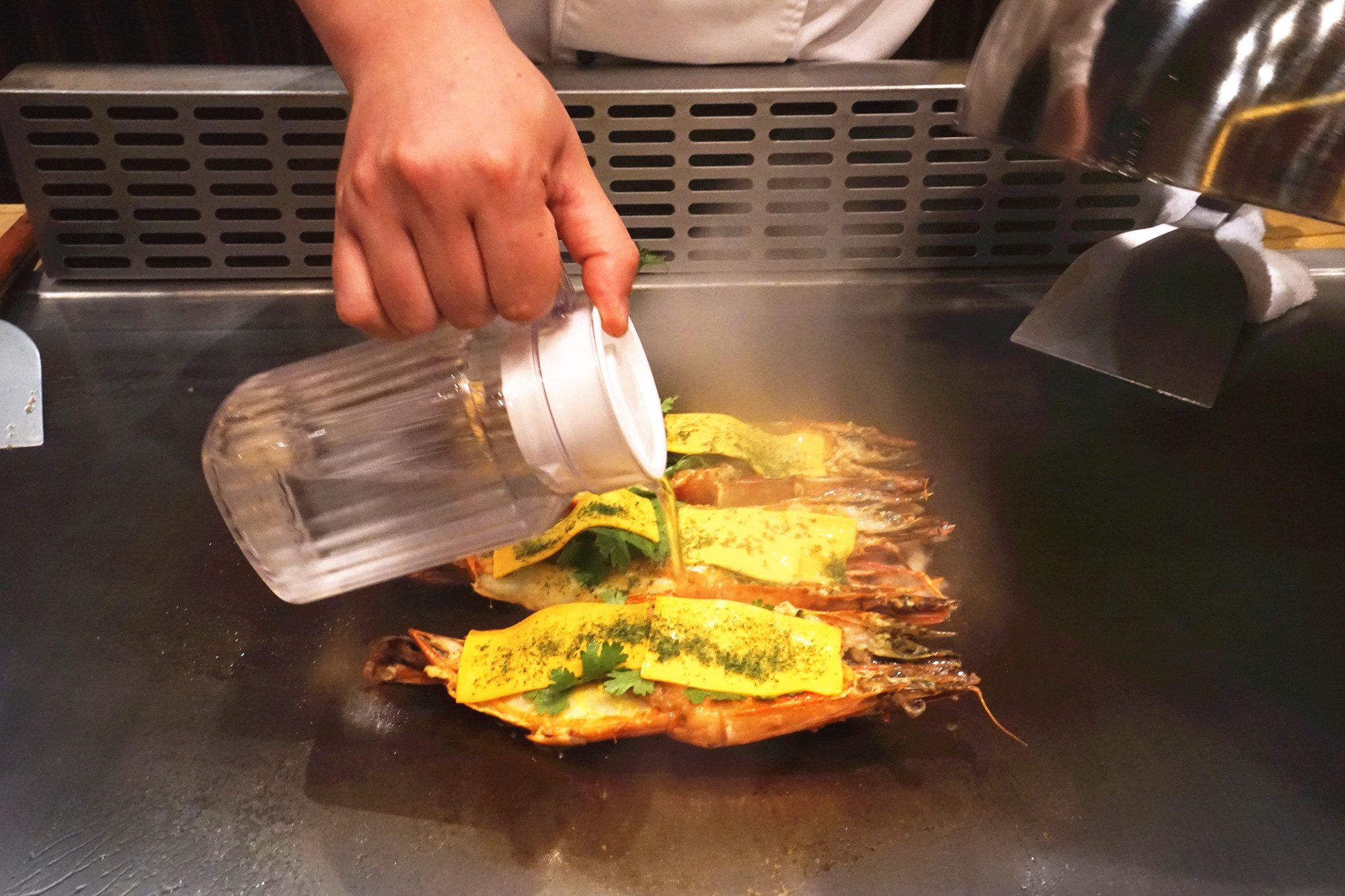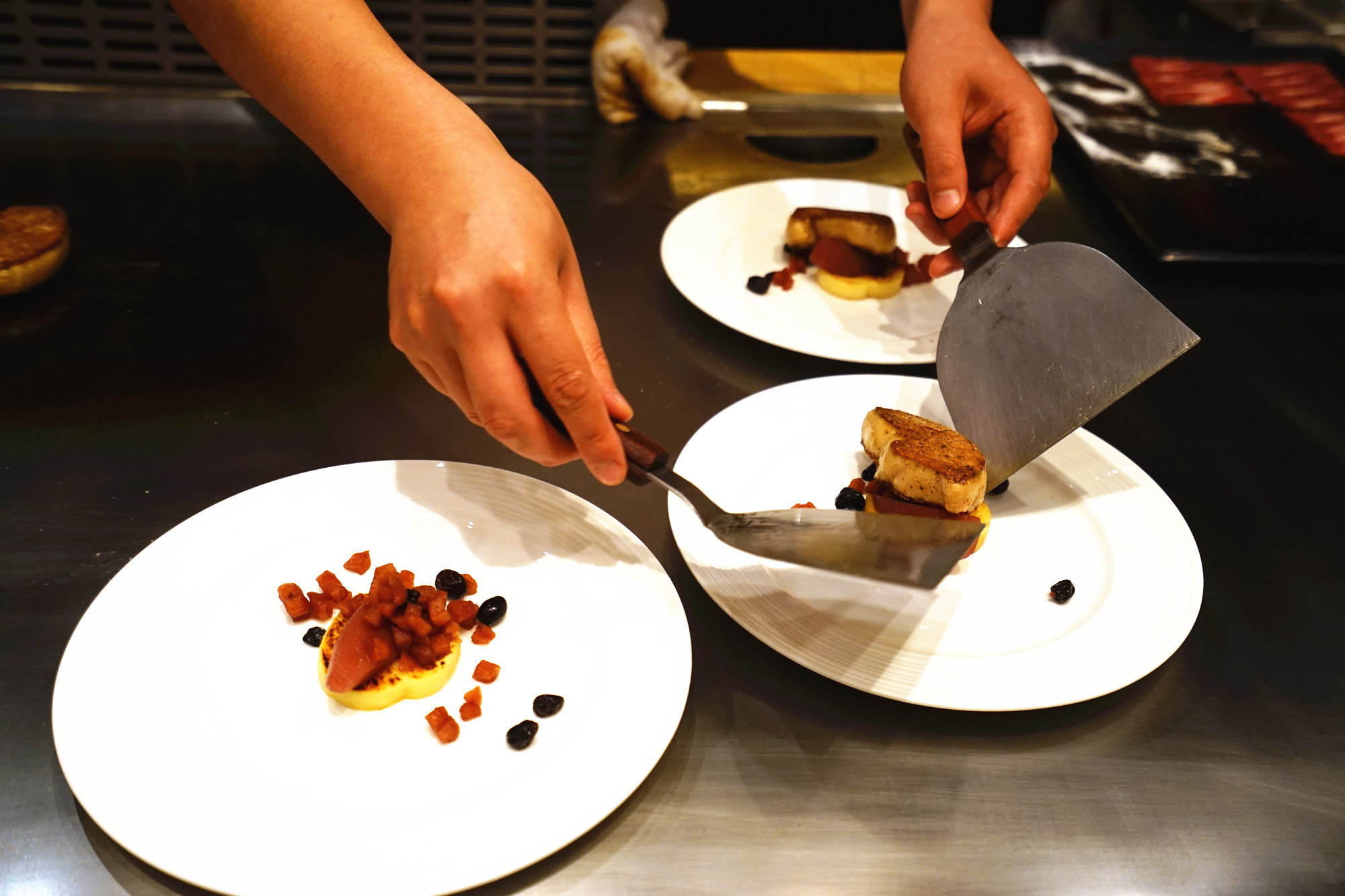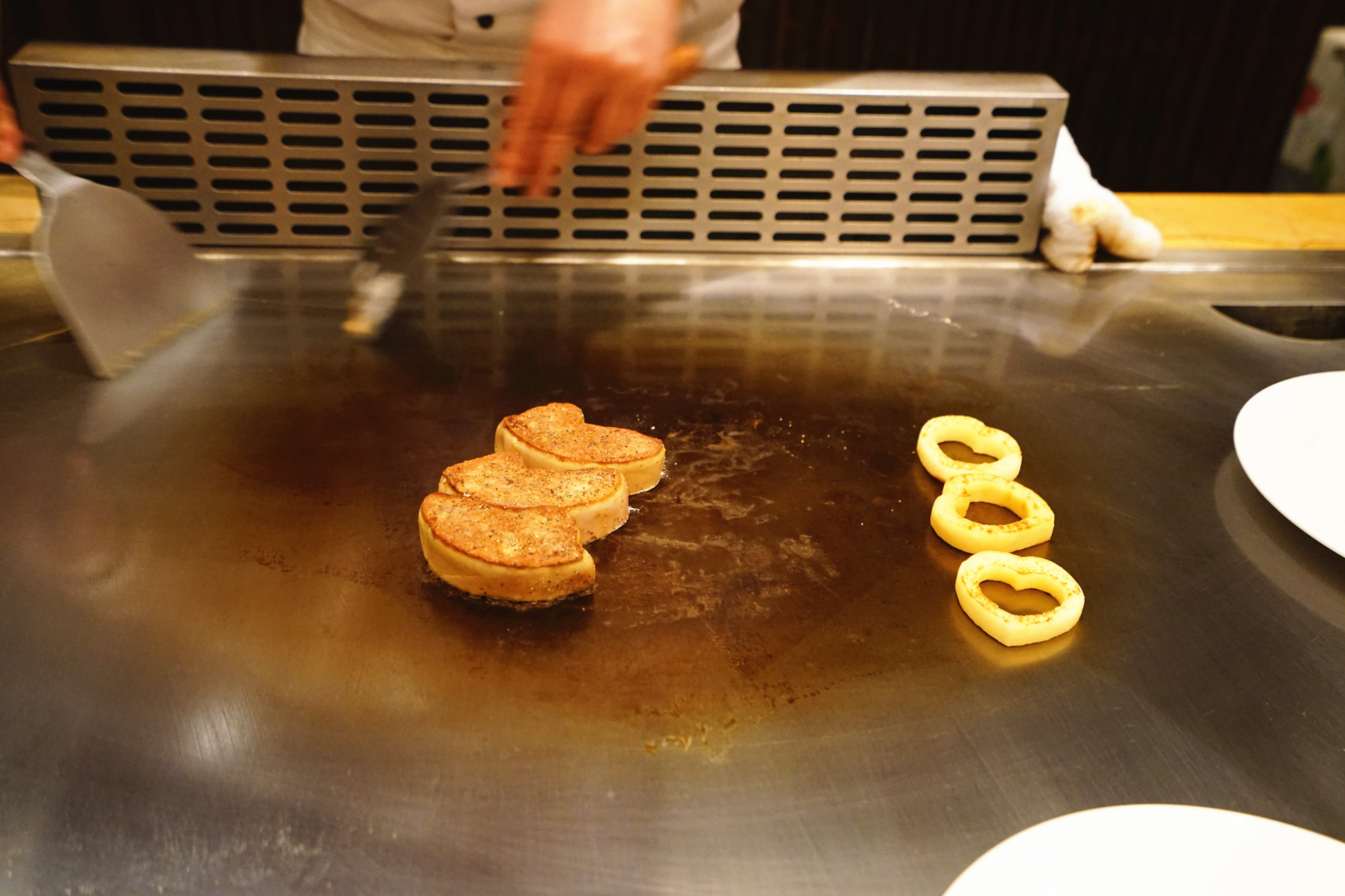 为啥说这里的铁板烧好吃,首先是这个鹅肝,吃过才知道这是我吃过最鲜嫩,最可口的鹅肝,外焦里嫩,一点都不老,感觉咬一口在嘴里就会化掉。尤其是配上这黑鱼子酱,红酒雪梨,简直是美赞。这是大厨曾经获过金奖的一道菜,很庆幸自己有口福吃到。本来想和大厨合个影,结果这位大厨太过低调,都不让拍照,我还是没忍住偷偷拍了一张。