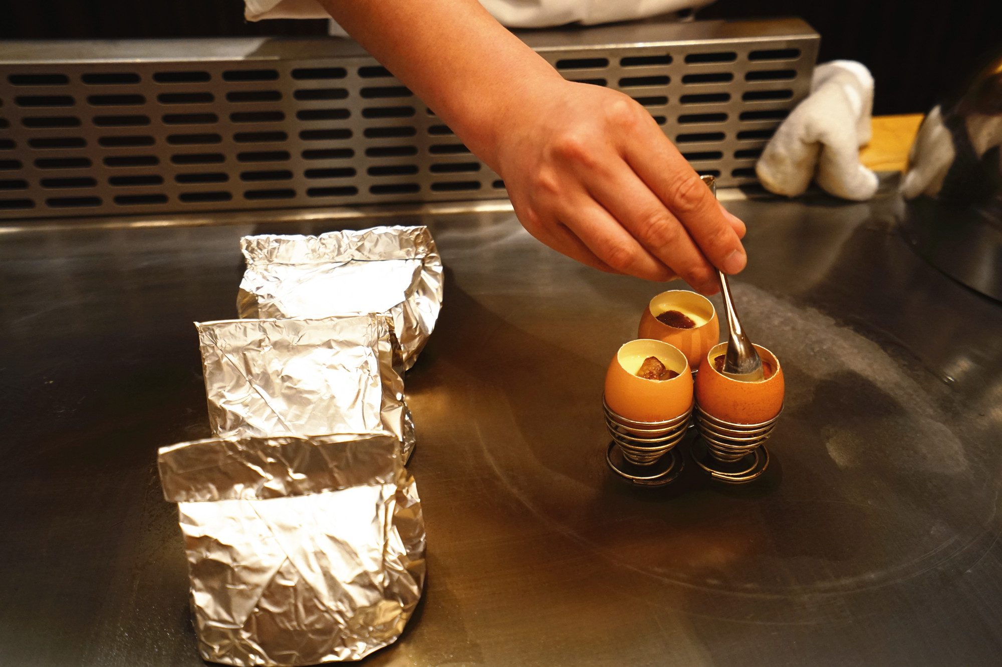 黑鱼籽鹅肝蒸蛋,嫩滑爽口,感觉吃了一个不过瘾,没好意思再要第二个,鸡蛋是生的直接在铁板上蒸熟,厉害。
