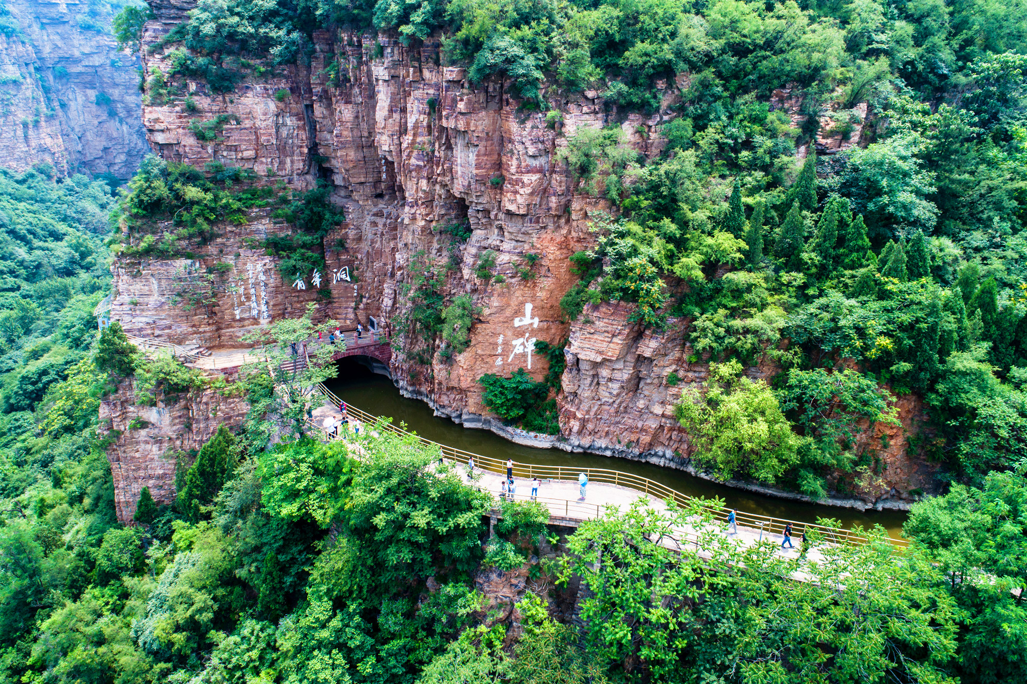 十万开山者在太行山悬崖峭壁上修筑了长达1500公里的“人工天河”红旗渠。如果把这些挖砌的土石垒筑成高2米、宽3米的石墙,其长度可纵贯中国大地,将广州与哈尔滨连接起来。一渠绕群山,精神动天下。红旗渠,像一条蓝色飘带缠绕在“北雄风光最胜处”的太行山上,把中华民族的一面精神之旗插在太行之巅,其工程之艰巨、美学价值之高,堪称人间奇迹。这里是红色教育的神圣殿堂、山水交融的旅游胜地
