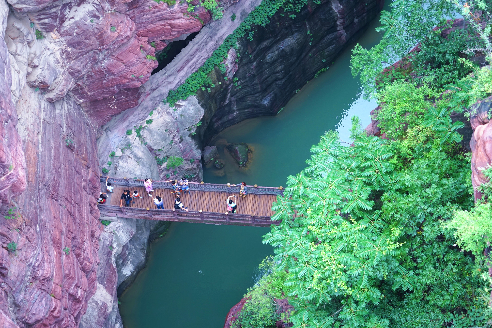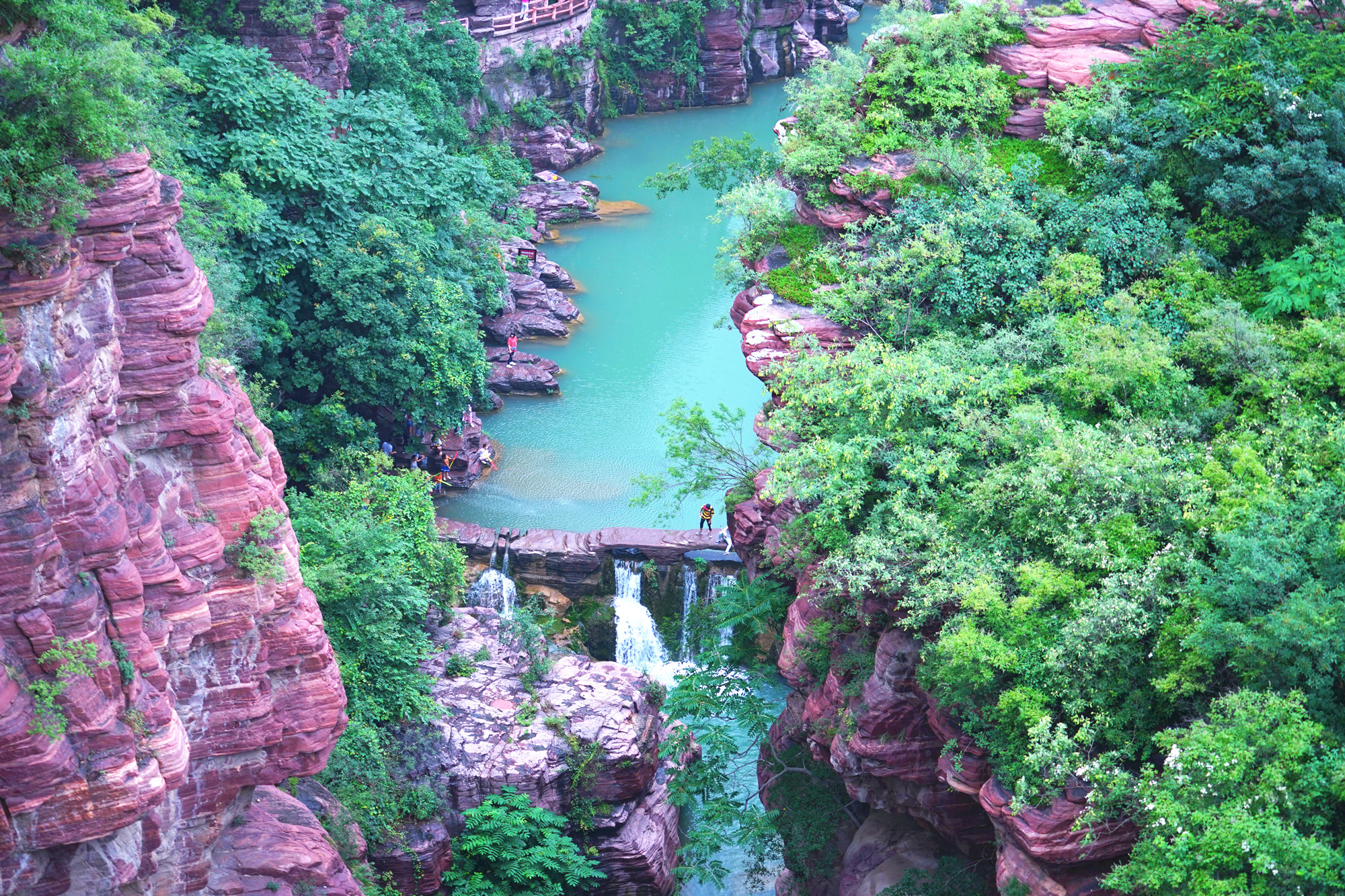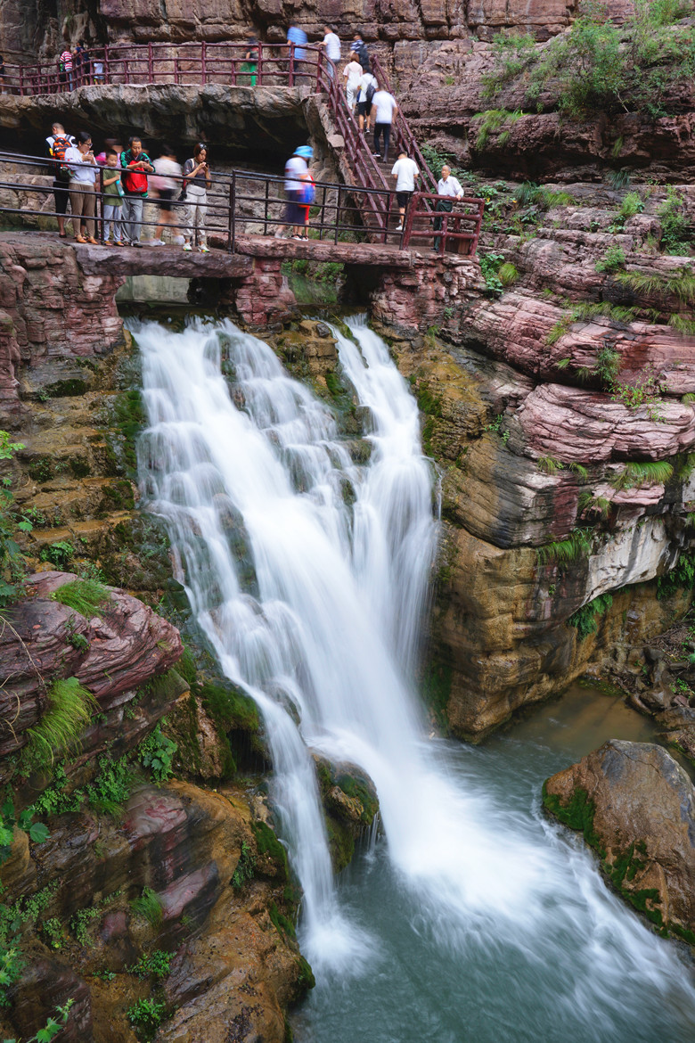 遥望这壮美的峡谷奇观,美景自上而下变化多端,上看犹如一条玉带坠入河谷之中,下看河道变宽,两边是耸立陡峭的红色岩石,地域也猛的宽了好几倍,水流声哗哗作响,滋养着周围的生灵。红石峡是云台山最出彩的地方,抚摸这绝壁的红岩,就像是和它一起经历了亿万年的时光。此时,才明白为什么会有那么多人来此拔草。