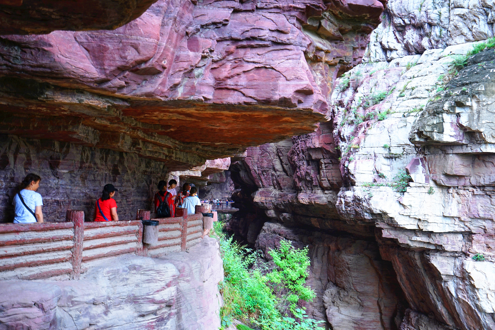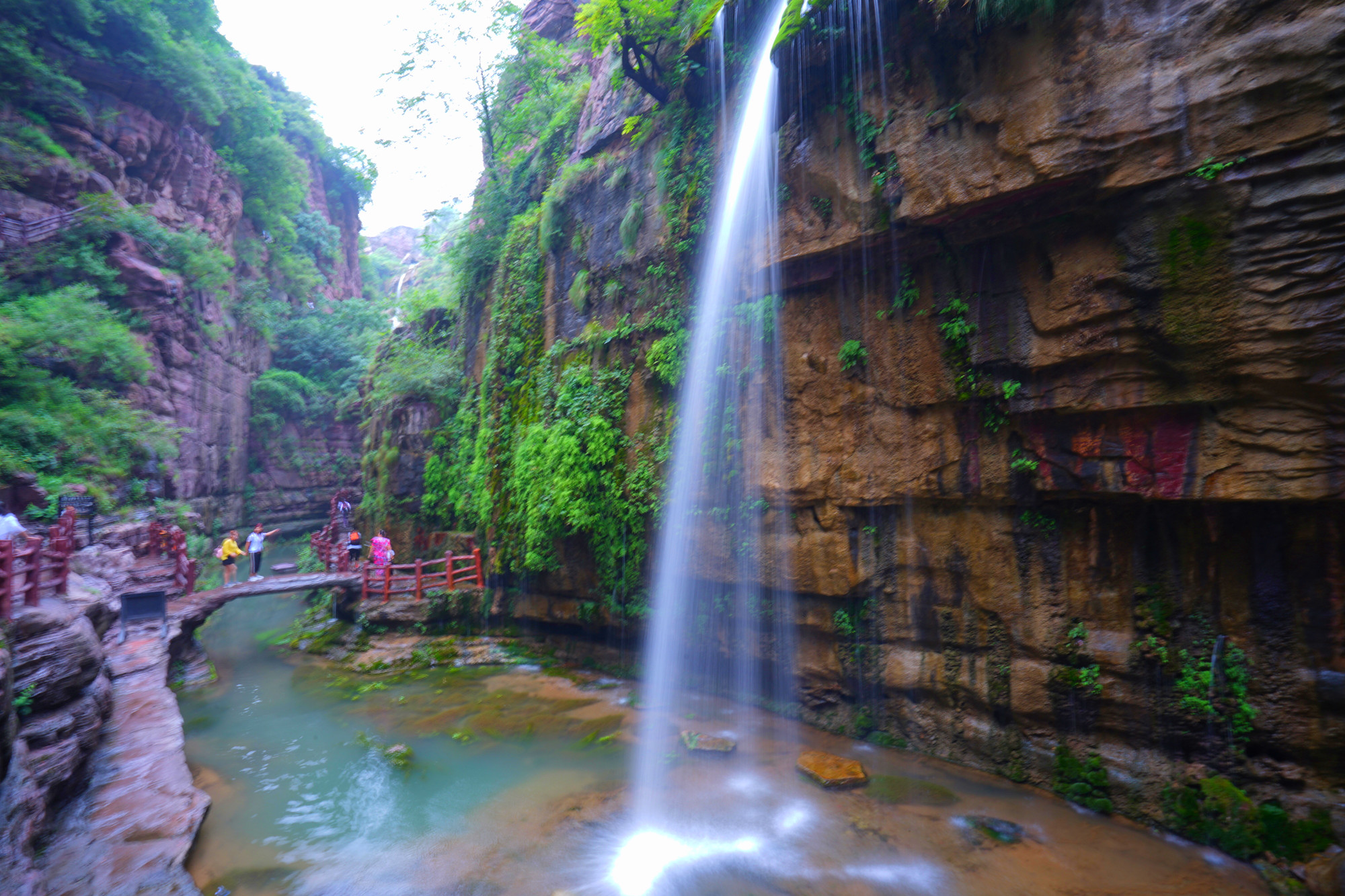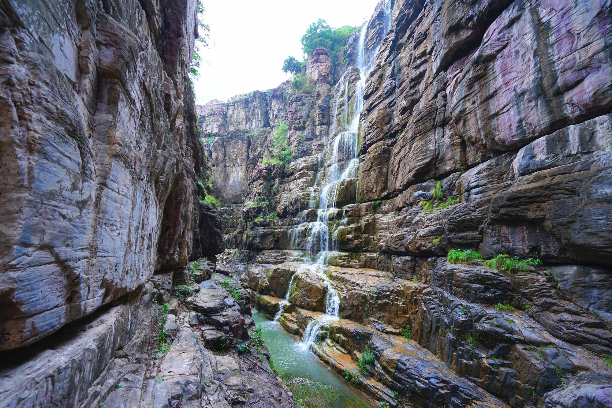 爬山是要往高处走,而红石峡却是要往山下走,峡谷的岩石一层一层的就像老树的年轮,可能这层状貌就是岩石的年龄吧?岩石不断地被水浸泡,使得这里的红石红的特滋润,世界万物离不开水,红岩石也不例外。走在峡谷中,只能贴着山崖走,走几步就会有瀑布从天而降,给你一份惊喜。这里以前就是一片海洋,地壳在不断的上升之后就形成了云台山现在的美景,泉、溪、瀑,随处可见。