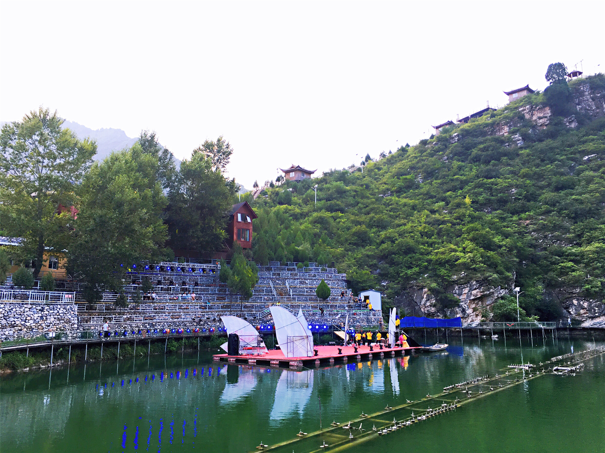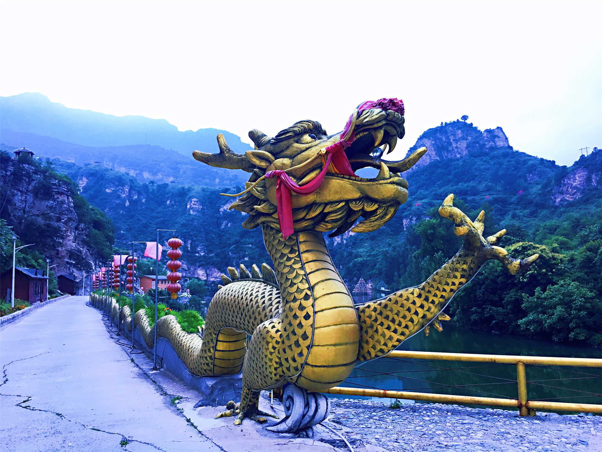 金水湖景区的大门在道路左边,一眼就能看见。景区门票45元/人,自驾的车可以直接开进景区内的停车场。入口处有一条亚洲第一龙,围绕在湖边,全程有261米。龙头前面好像是一个祭祀台,应该是祭祀祈求雨水用的。龙头对着码头,可以坐快艇或者脚踏船。群山环抱的湖面,阳光照射下犹如披上了一件璀璨金色的外衣故得名金水湖。