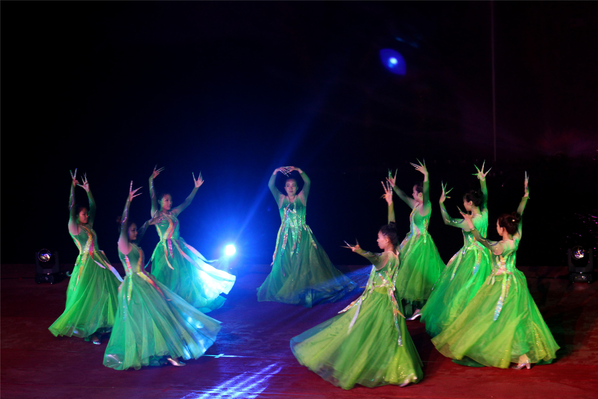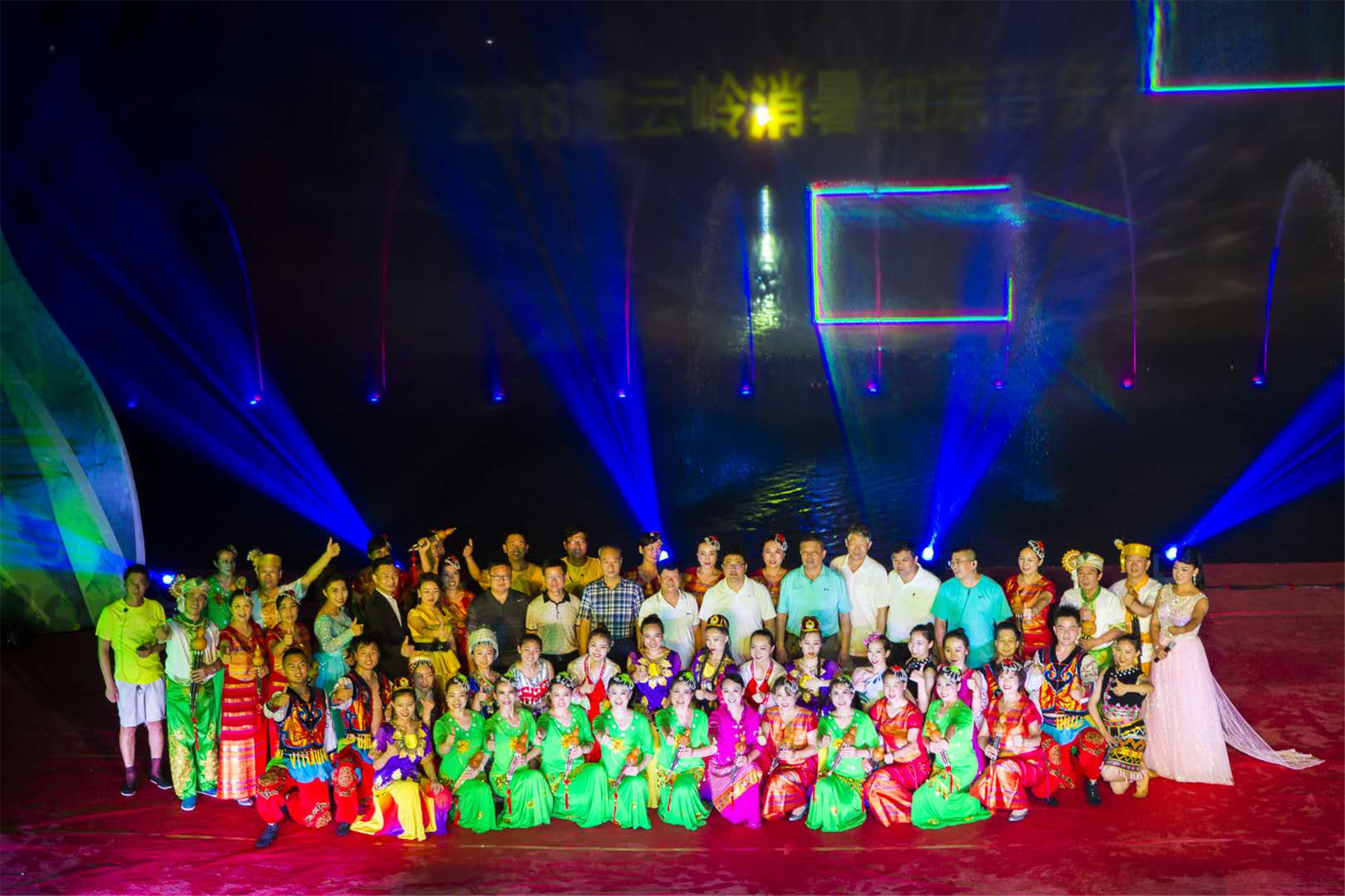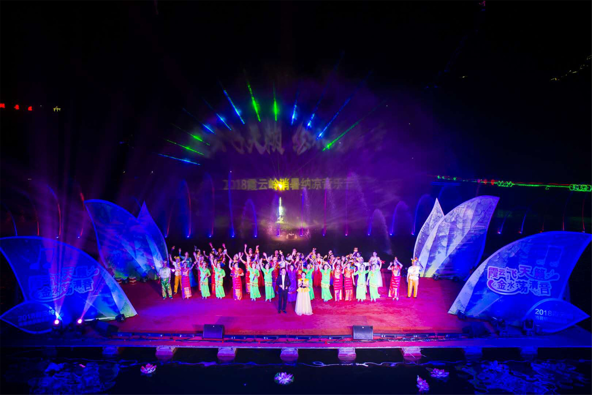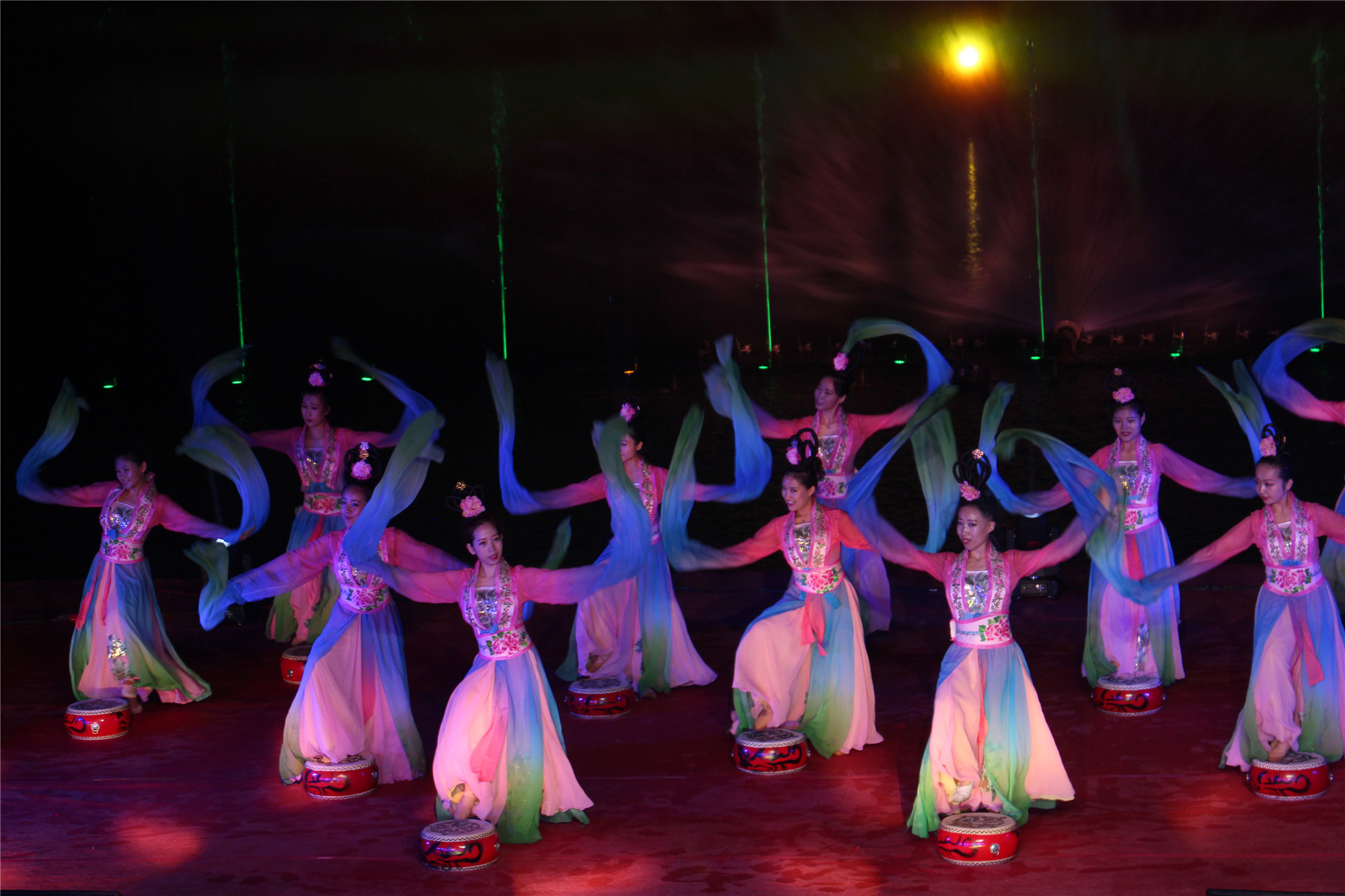 晚上有水上音乐喷泉激光水幕表演,舞台搭在湖水上,舞台的后面就是用湖水打出来的水幕,观众在湖边的岸上看表演。演员在表演的同时,水幕上也会变化出各种酷炫的激光背景。