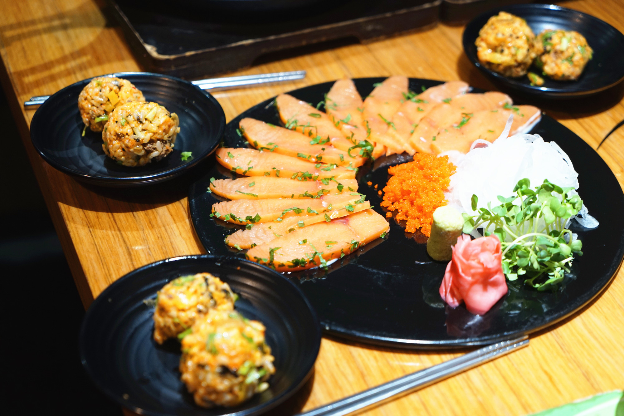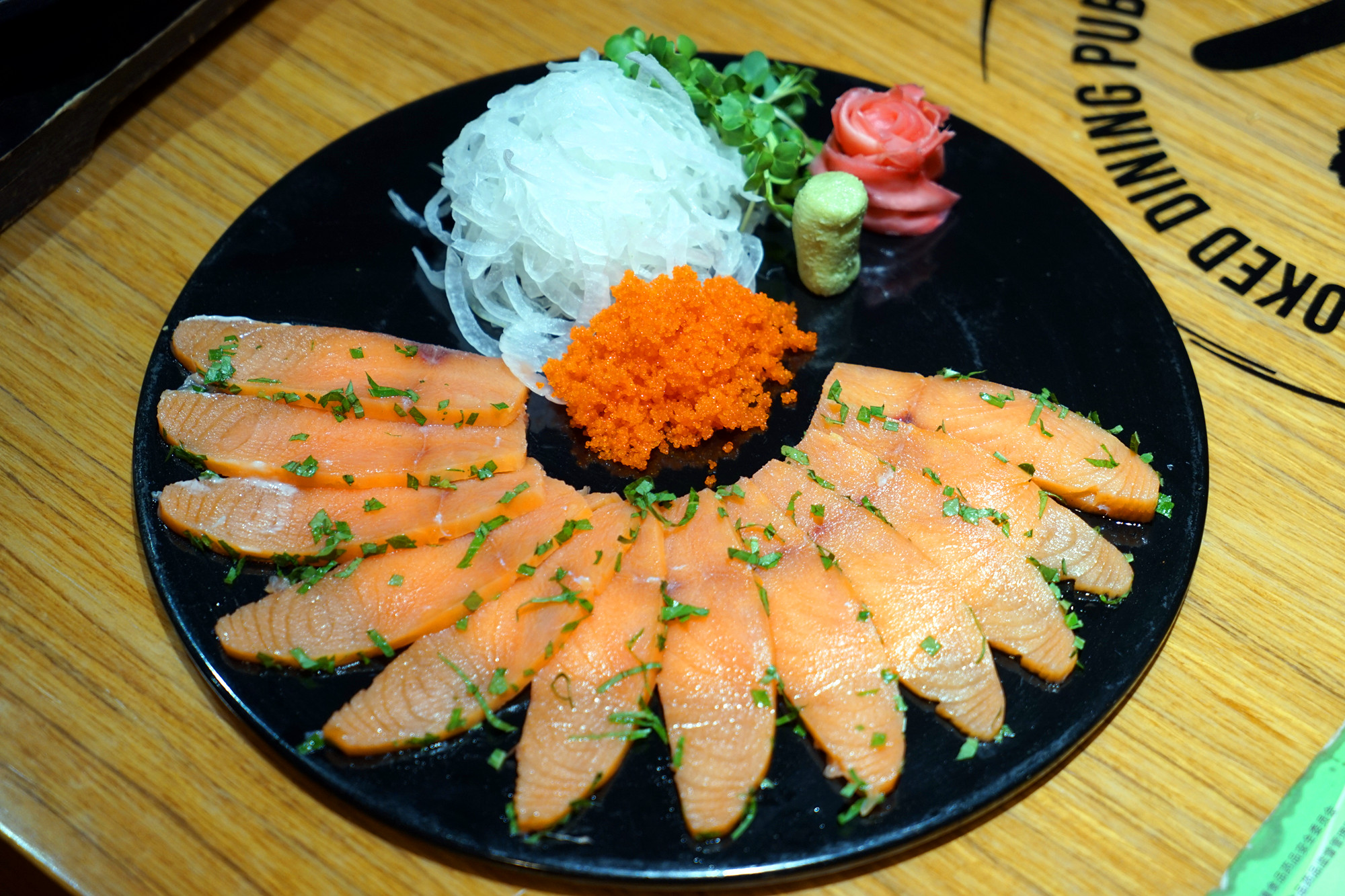 三文鱼花,一道摆盘很别致的三文鱼,鱼肉鲜嫩的入口即化。三文鱼卷着泡姜片,鱼籽酱,洋葱丝,芥末酱,味道简直太美妙了。