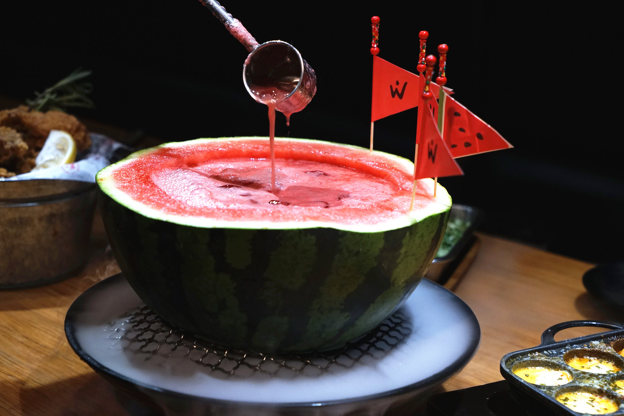 说起酒,当仁不让的就是这应季的西瓜酒,准确的说应该是鸡尾酒。卖相特别诱人,半个大西瓜里面是满满的西瓜汁,这可是半个西瓜瓤榨汁,混合了WARA鸡尾酒、雪碧,冰块,喝起来不要太爽哦!,不喜欢酒的女士可以不让加酒。既可以当酒喝又可以当水果汁饮用,营养健康。