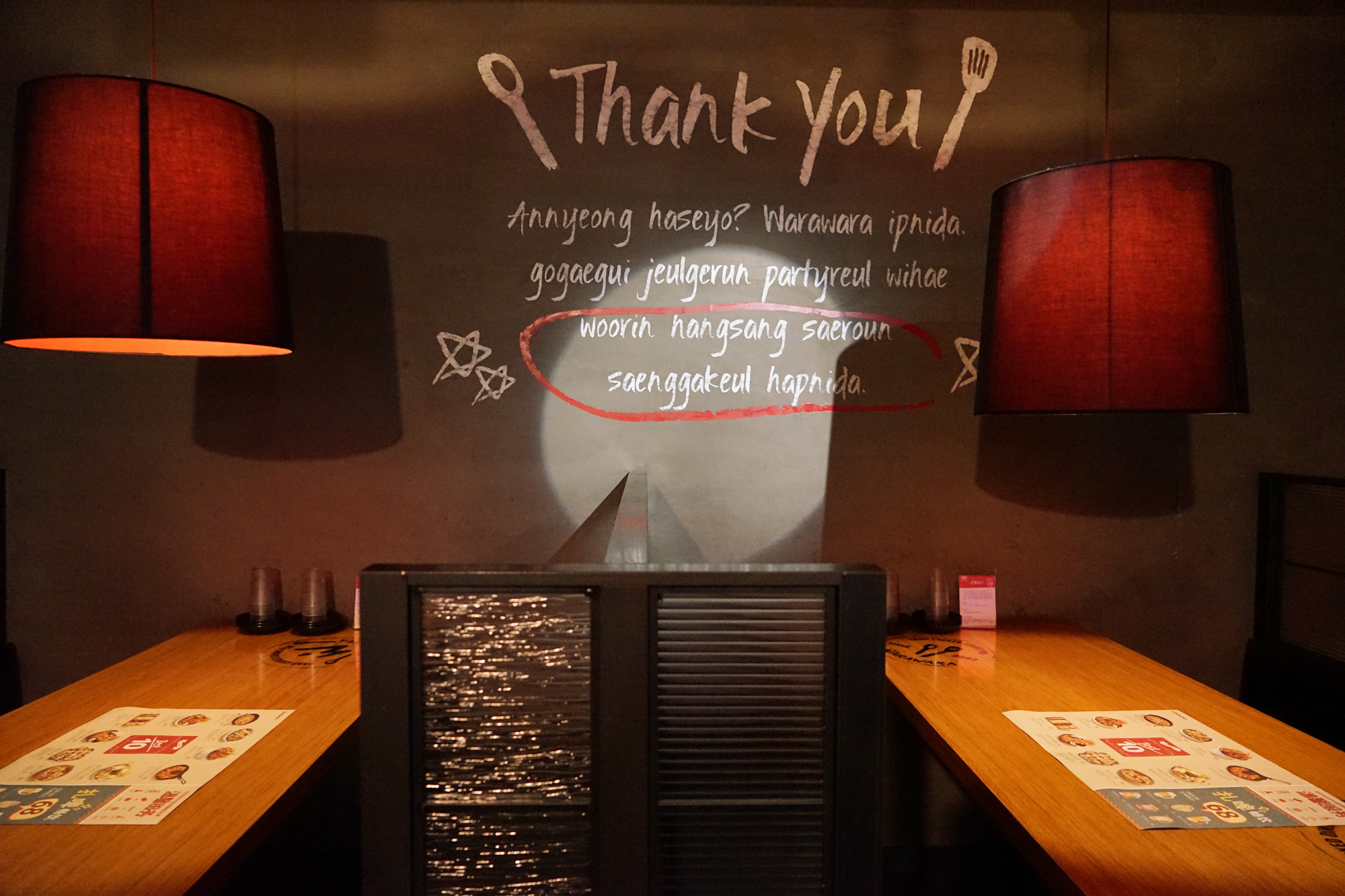 距离五道口只有两分钟脚程的东源大厦,站在地铁站里就能瞅见这大楼墙外琳琅满目的餐厅店铺名。有一家很惹眼的全是字母WARAWARA,比较个性,就是他家了,地铁A口出来直奔大厦二楼。二楼电梯口就是他家的店,果然是一家韩国料理。直观感觉还是很有私密性,每一个桌子之间都有围挡,这样的话,小情侣说个悄悄话也很方便哦。你还别说,放眼望去全是清一色的年轻人,如我这把年纪的不多,哈哈!在这寸土寸金的地方,席位够多,也够宽敞。两人四人桌,六人桌,店里唯一的包间,可容纳20人左右,是家庭聚会或是生日派对的最佳选择。