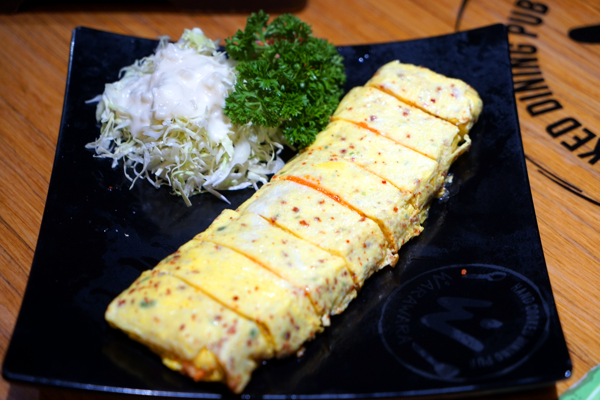 鱼籽鸡蛋卷,这个是要配蘸酱来吃,更有味道,鸡蛋卷做的很嫩,里面包裹的鱼籽酱,咬在嘴里就像我们小时候吃的跳跳糖,会弹牙跳跃,我很喜欢。