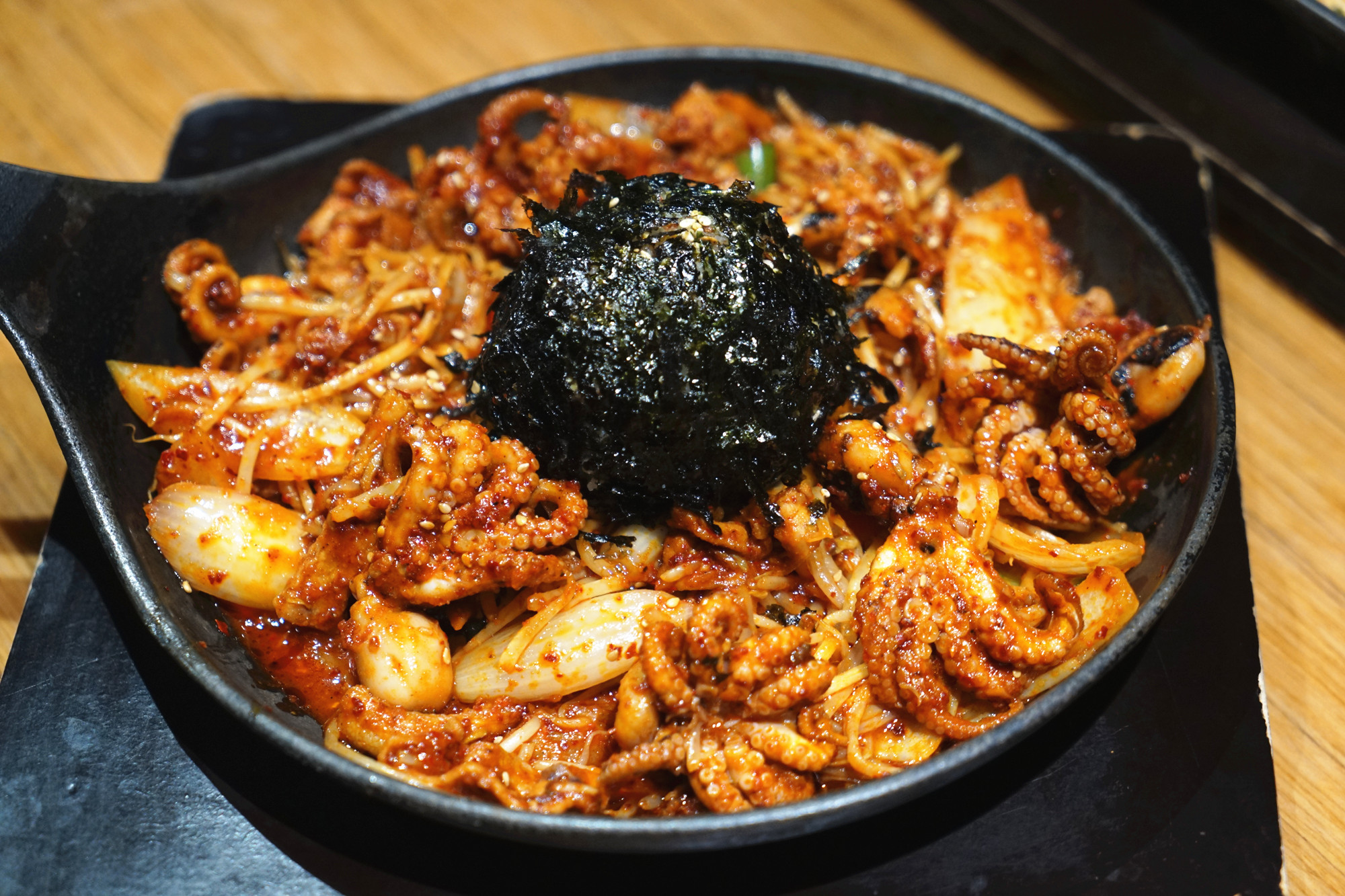 八爪鱼炒五花肉是韩国特色菜品,周边一圈八爪鱼,中间是紫菜米饭团。八爪鱼完全被韩国辣酱所包裹,吃到嘴里脆爽辣劲够足,没有一点腥味,由于有五花肉,所以很香,但是不油腻。韩国菜如果没有辣酱将会逊色许多,喜欢吃辣的人绝对爱。韩国人对于八爪鱼的热爱已经到可以生吞活吃的地步。前段时间去韩国就亲眼目睹,而且小心翼翼的吃了一小块,感觉很赞,由于是拌有海苔在里面确实很好吃。