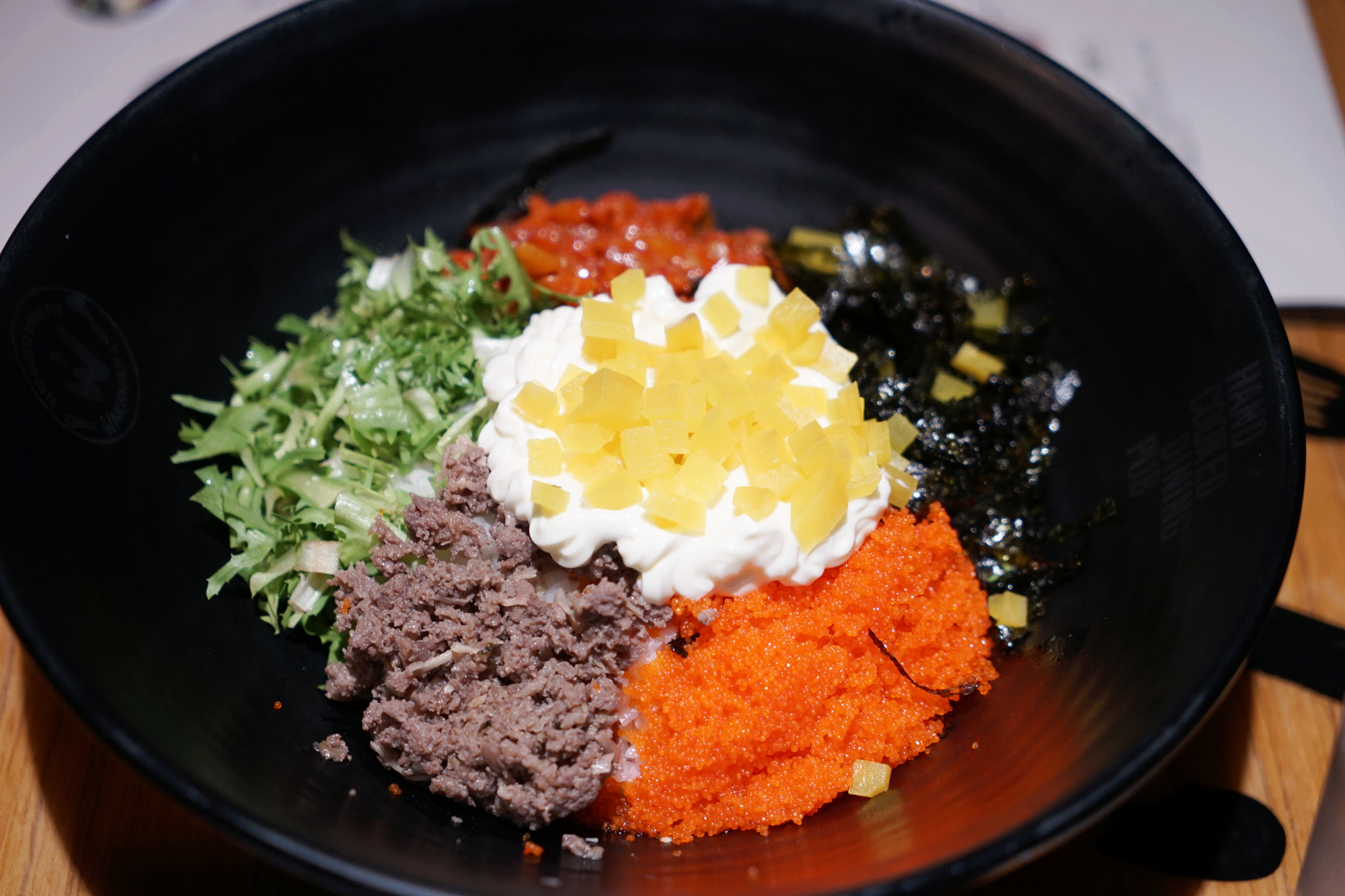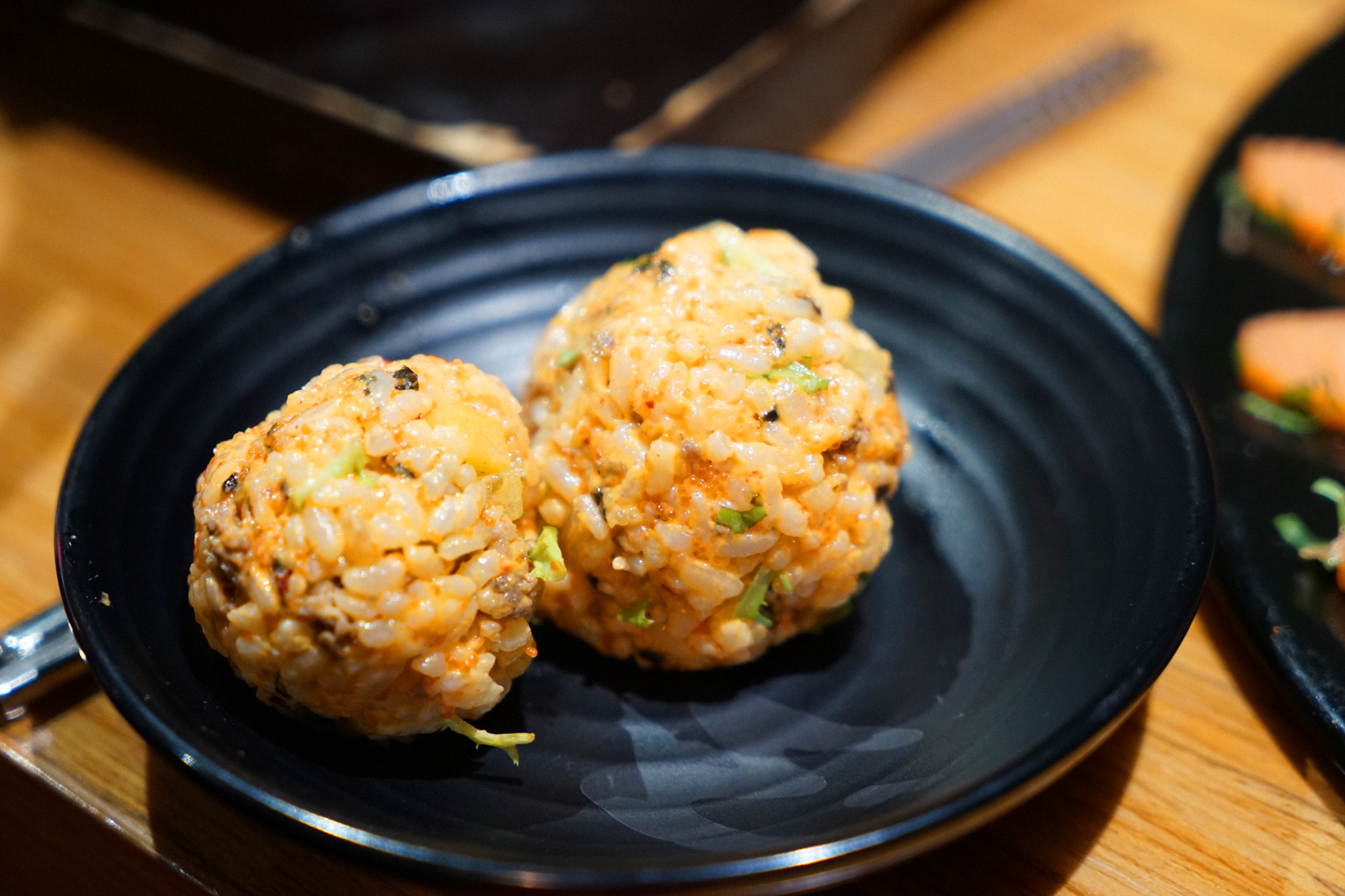 烤牛肉自制饭团,这个我最看好,因为它的料很足。奢侈的放了很多鱼籽酱,脆脆的紫菜,新鲜的蔬菜,蛋黄酱,泡菜碎,烤好的牛肉碎量够多。吃的时候自己带上手套一个个的来揉饭团,既好玩又增加很多乐趣。哈哈!,一看这老板就是一个爱玩的人,总想着让食客参与进来。