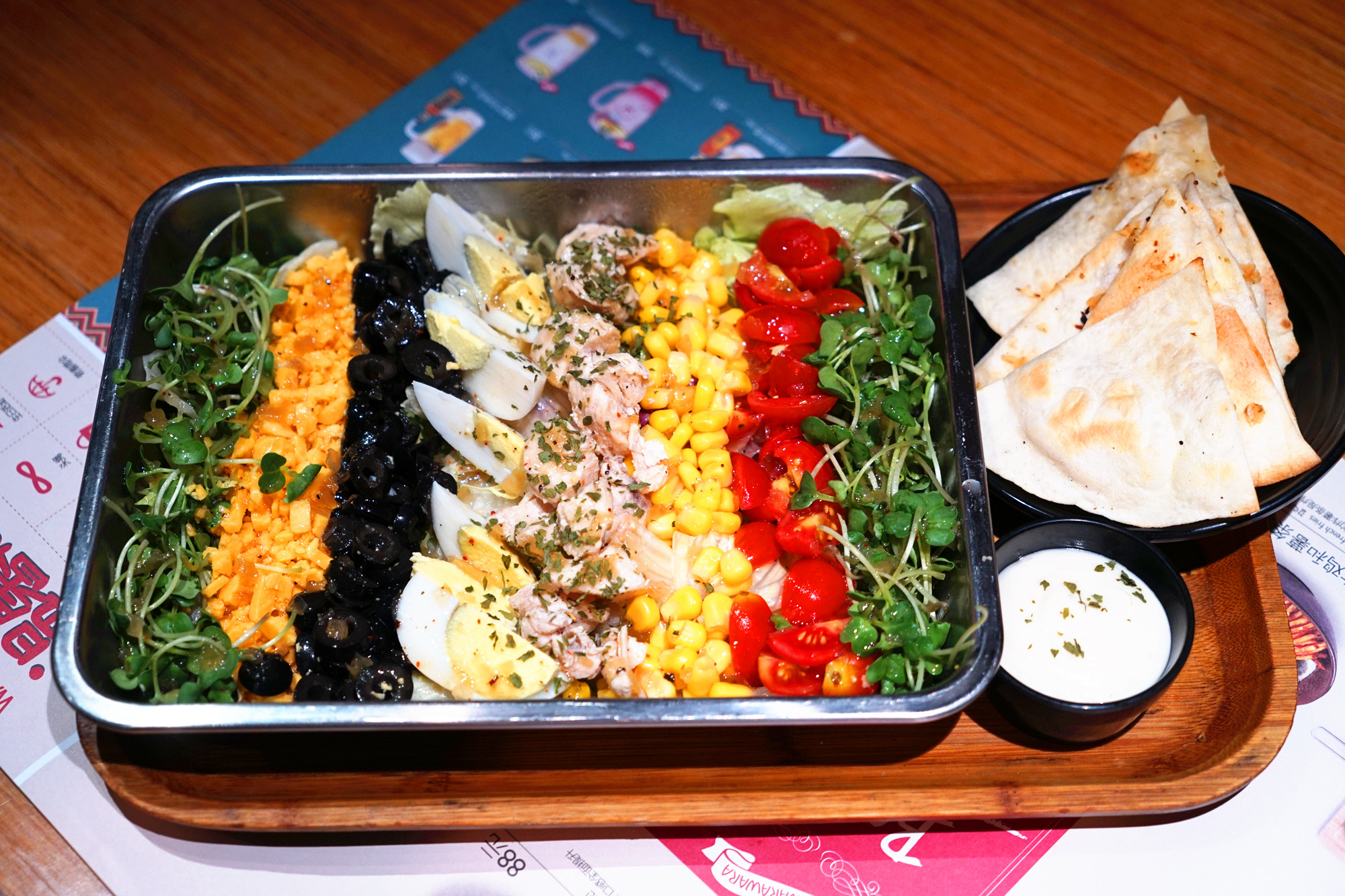 夏天吃韩国料理,考伯沙拉不能少,里面的料很丰富,有鸡蛋,鸡肉,圣女果,菜苗,玉米粒,生菜,水果等,还配有蘸酱和小脆饼。感觉这一盘沙拉就够营养,搭配的很赞。