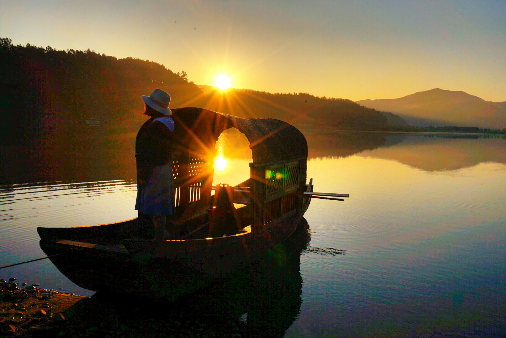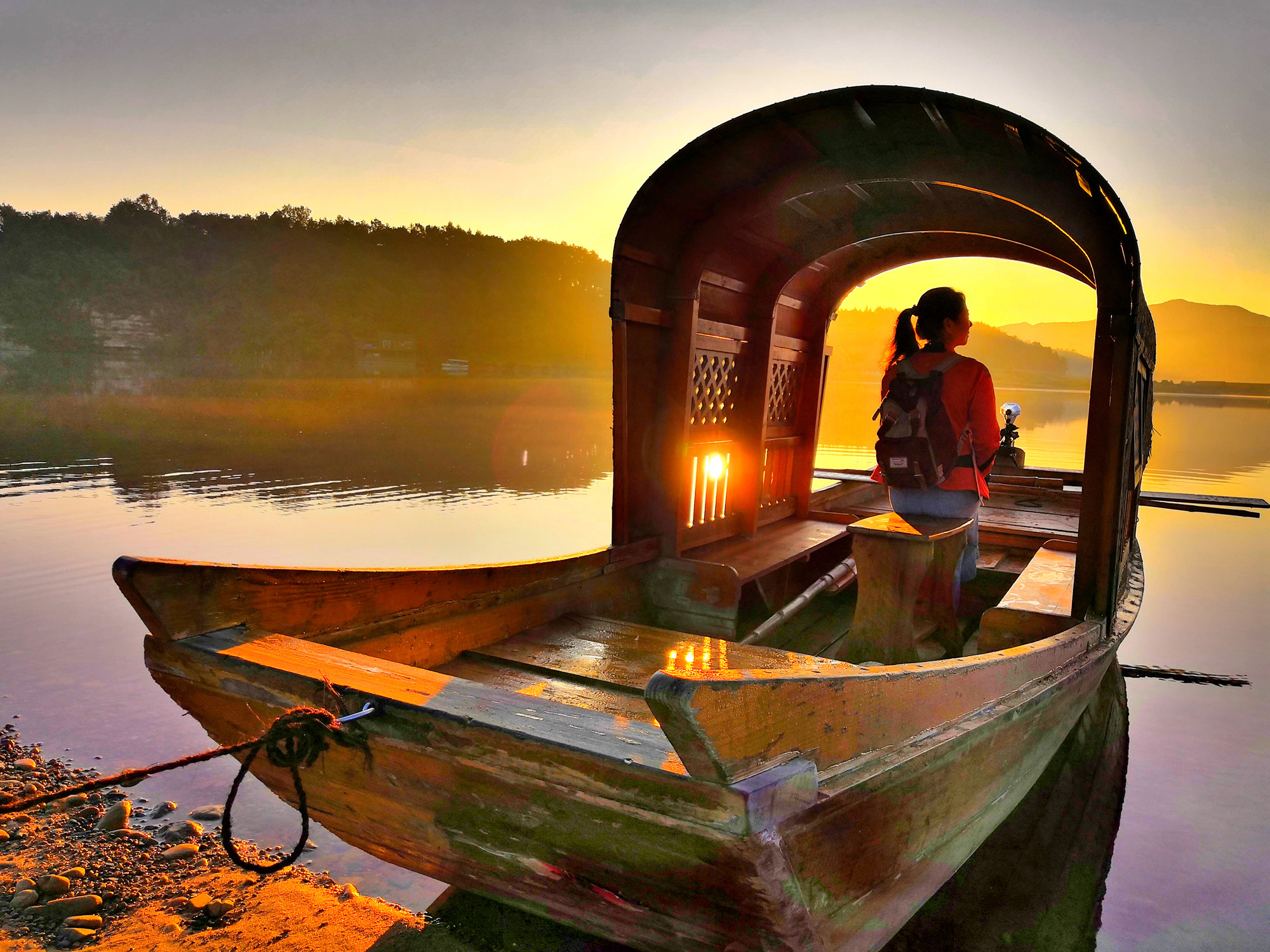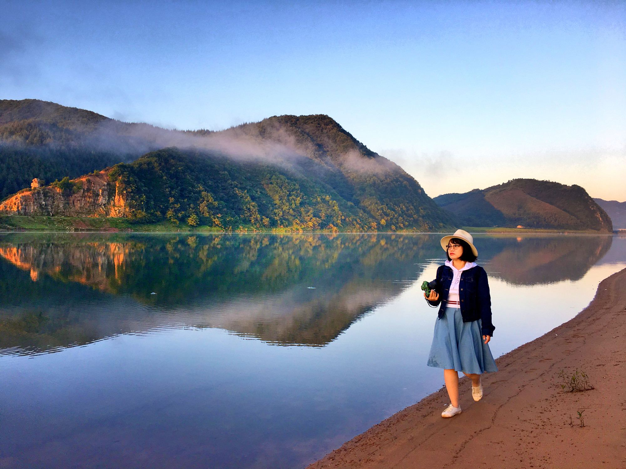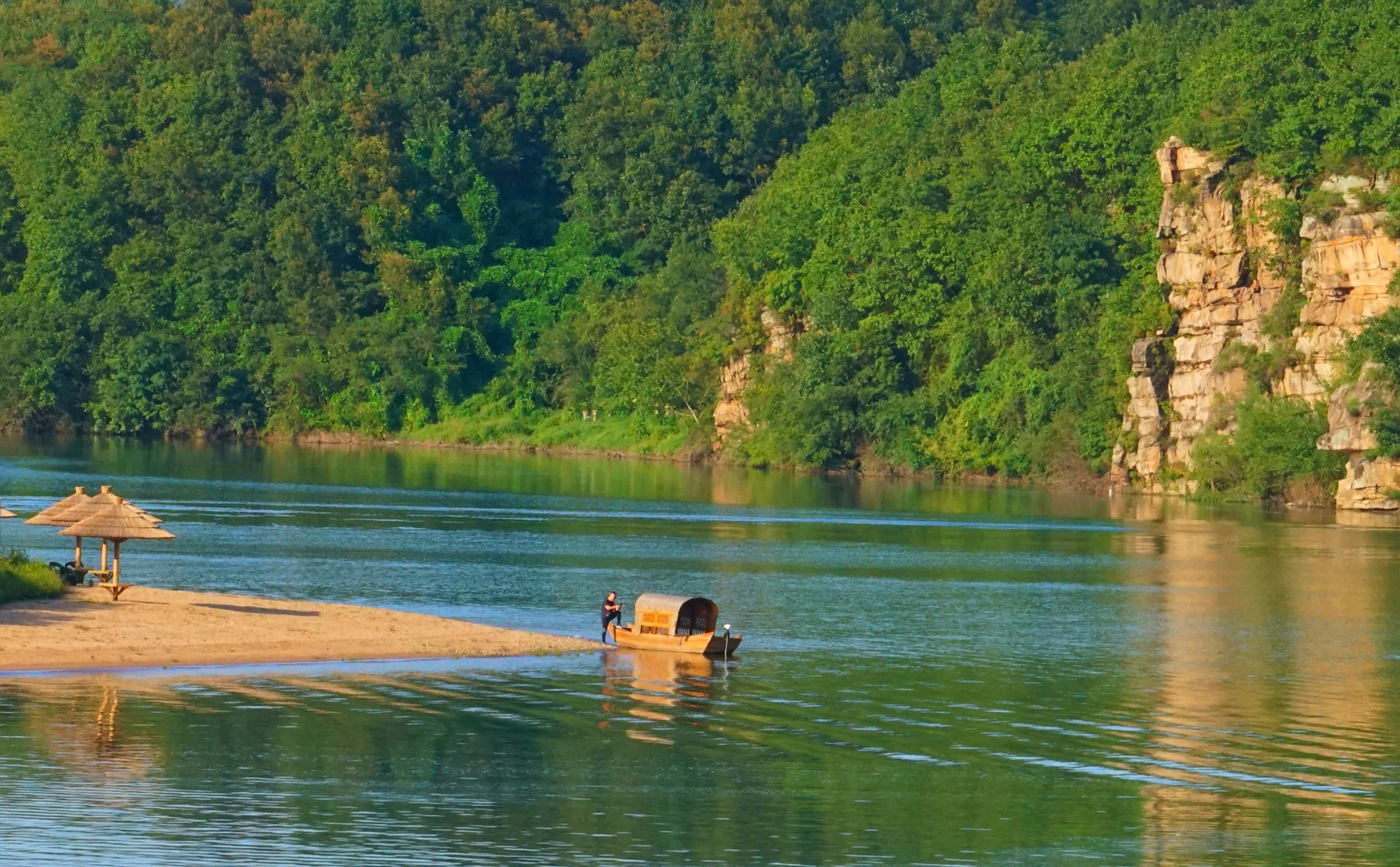 下船之后不行不远就是人工沙滩,这里有女人们最爱的乌篷船,更有那美不胜收的云雾缭绕。清晨的靉河,远山,在这雾气中如仙境般惹人怜爱。暮霭晨曦中坐上乌篷船,被金色的阳光普照,要多美有多美。