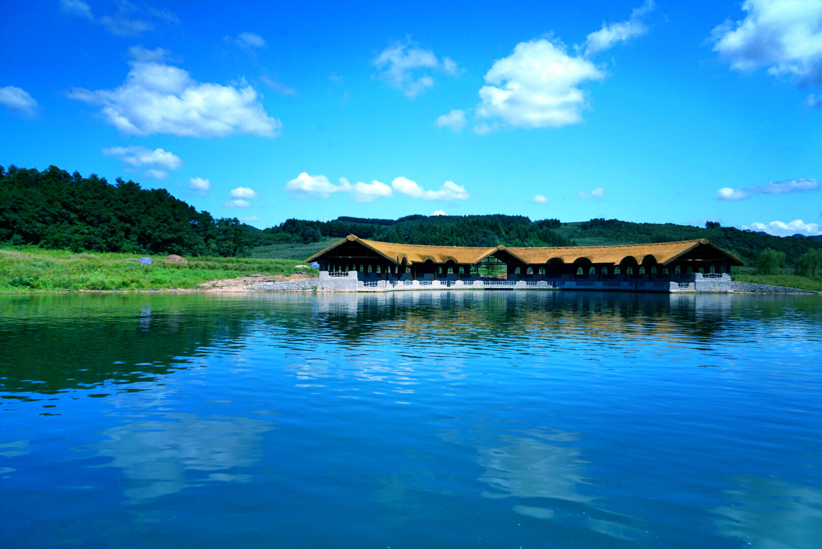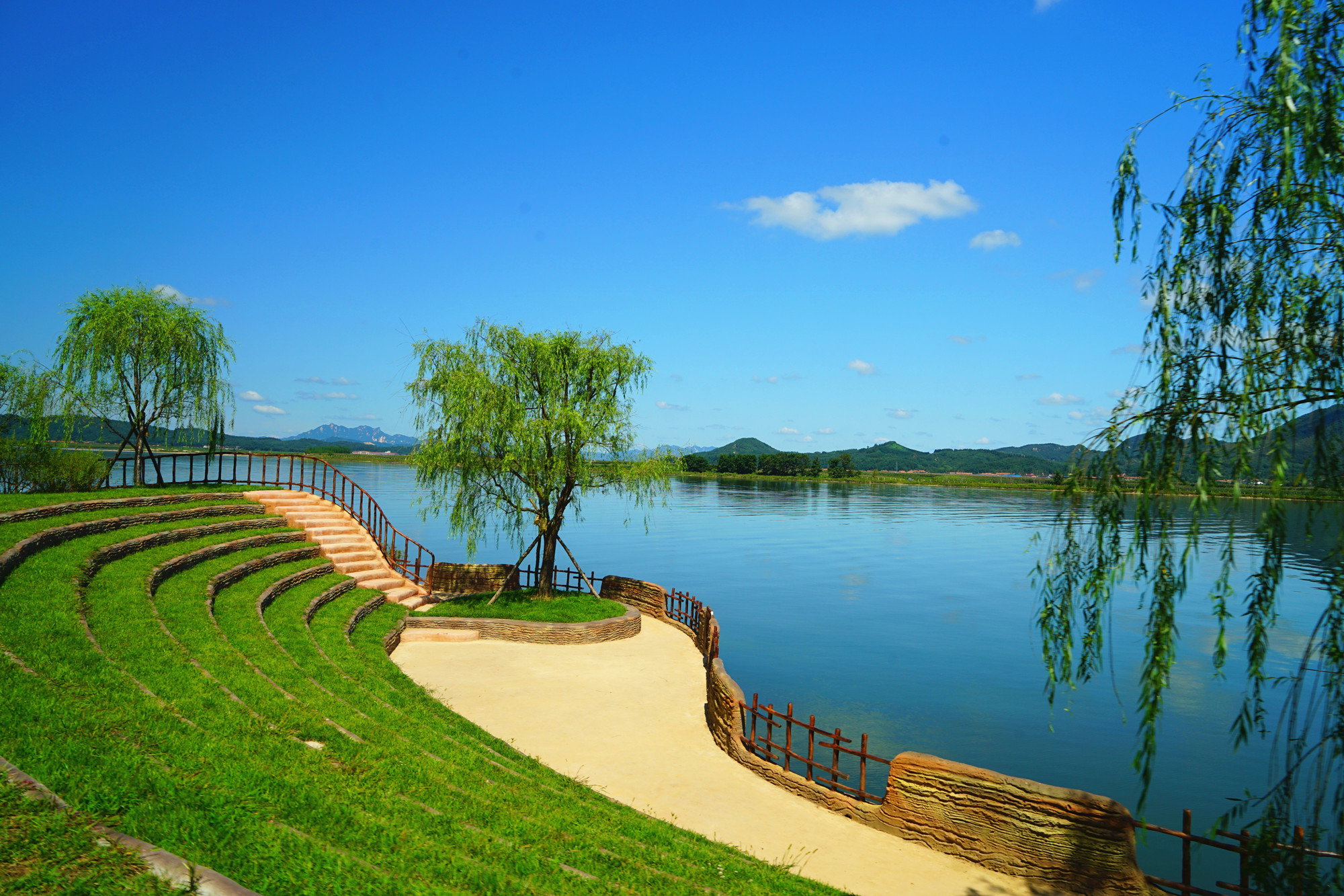 凤城市内走,刚过草河大桥右拐,沿坝上景观路即可到丹东凤城爱河旅游风景区。