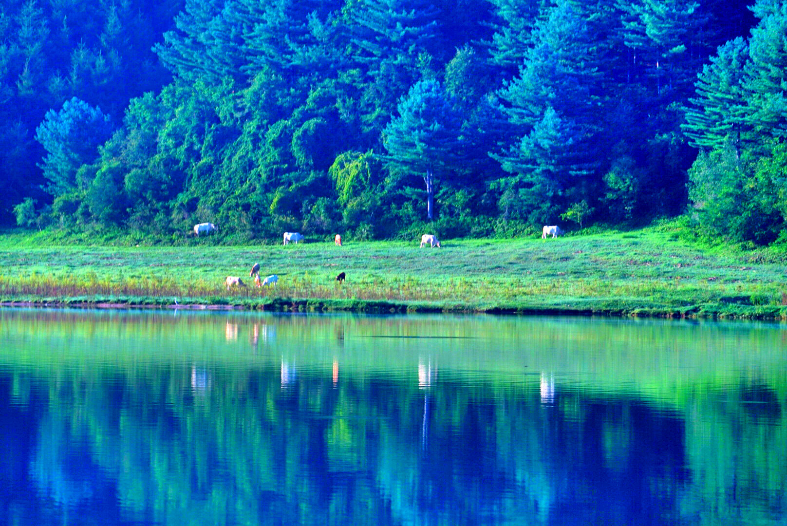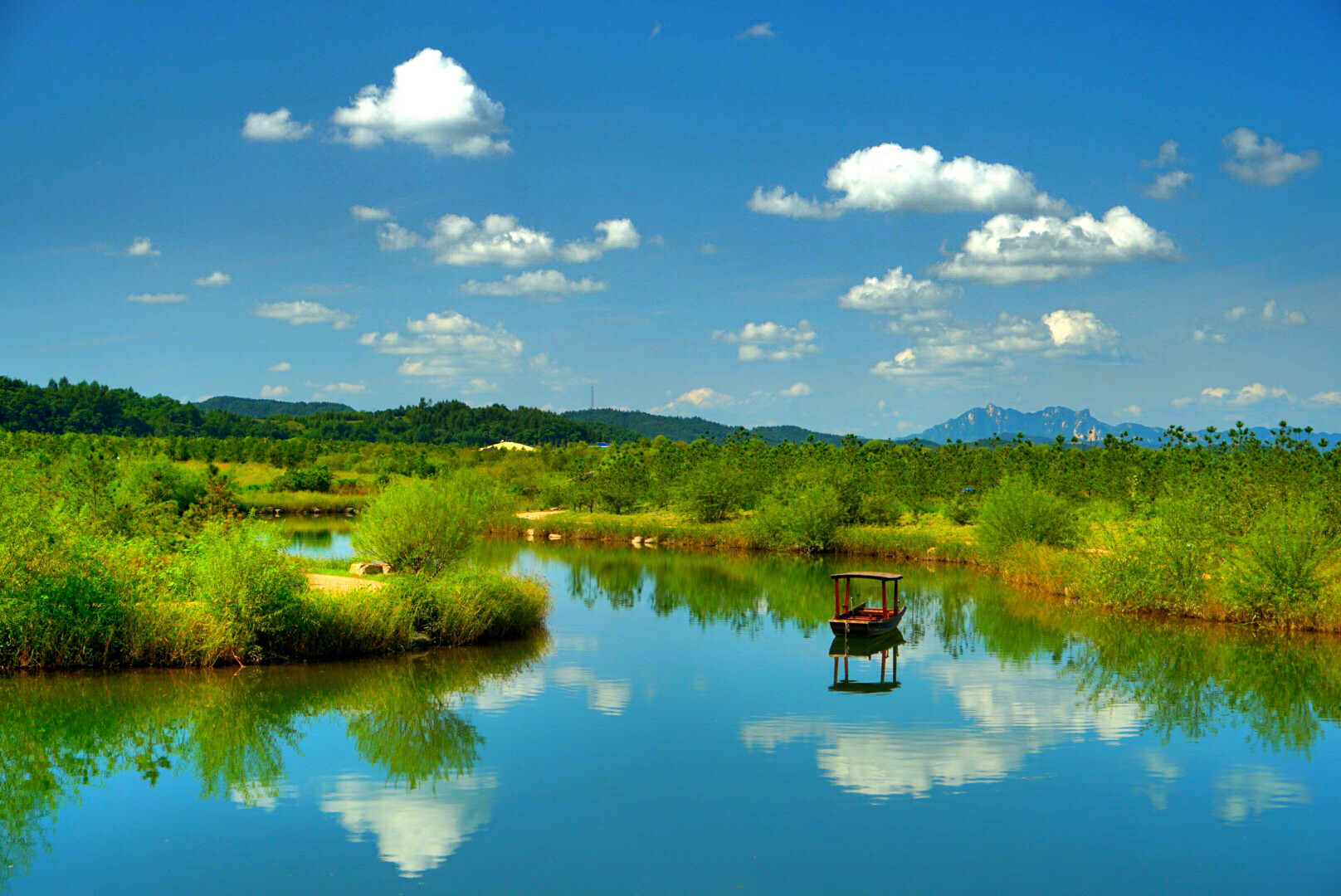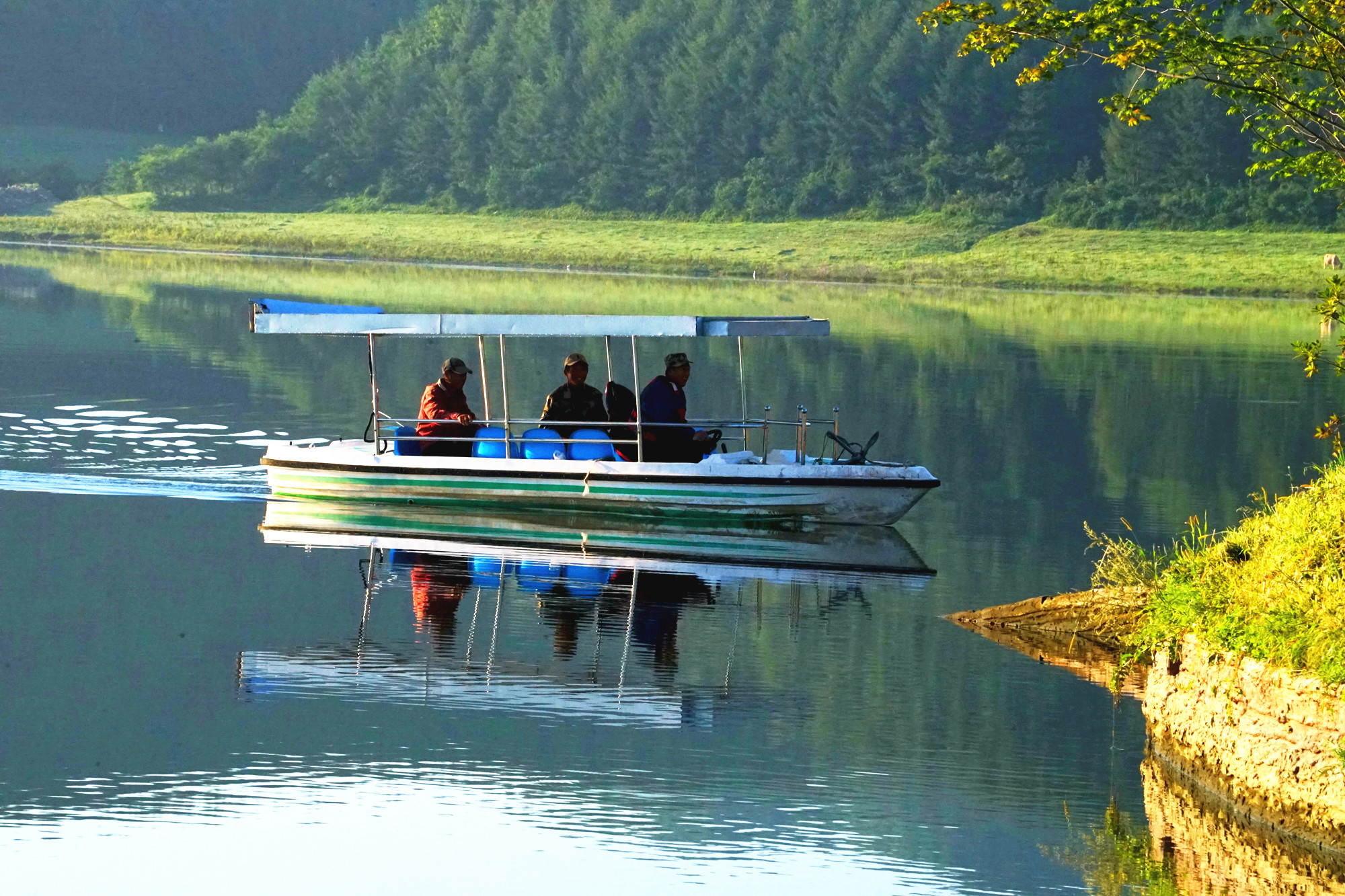 岸边悠闲吃草的牛儿,水面盘旋的苍鹭,为这游玩的人们带来最美的风景。