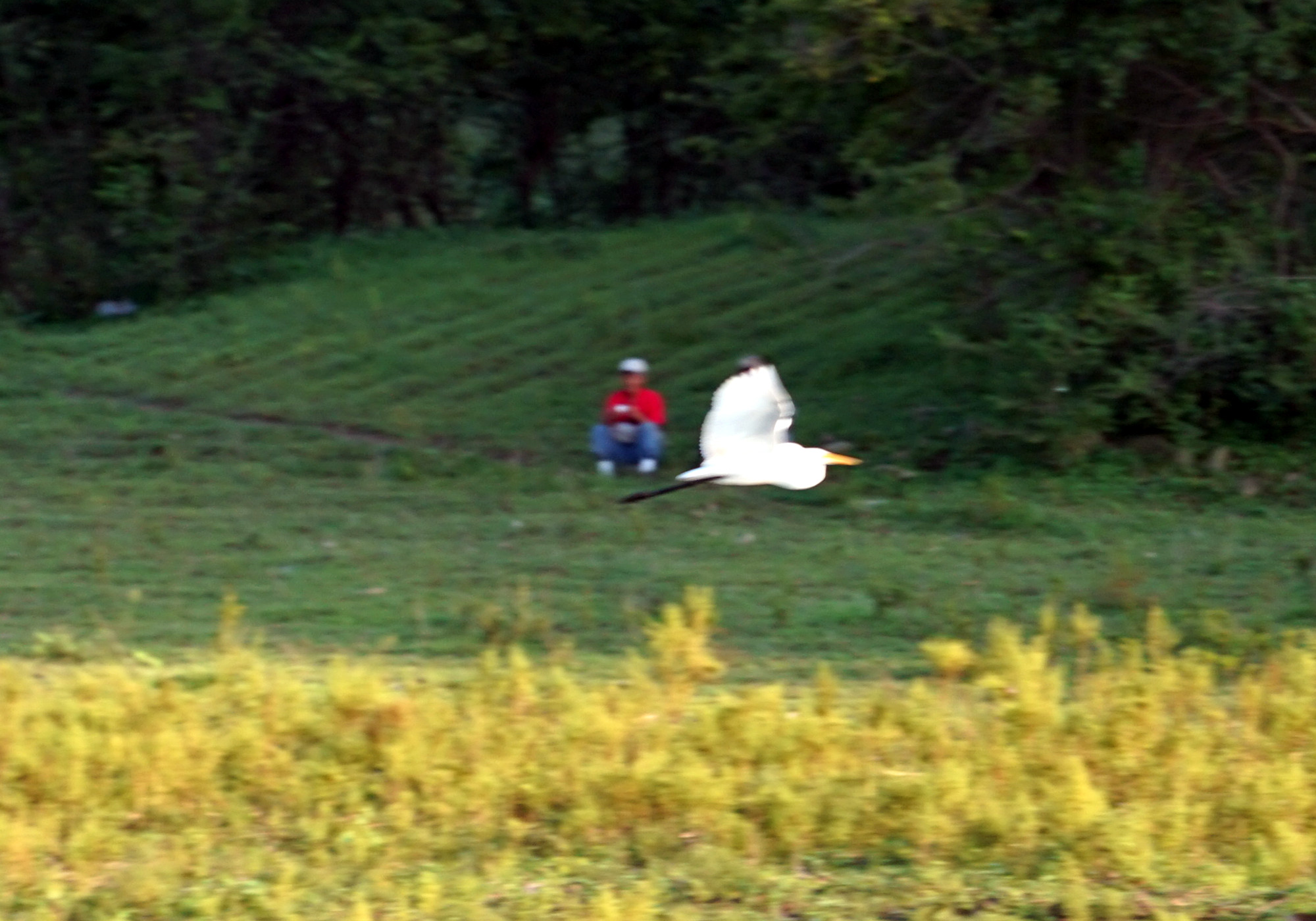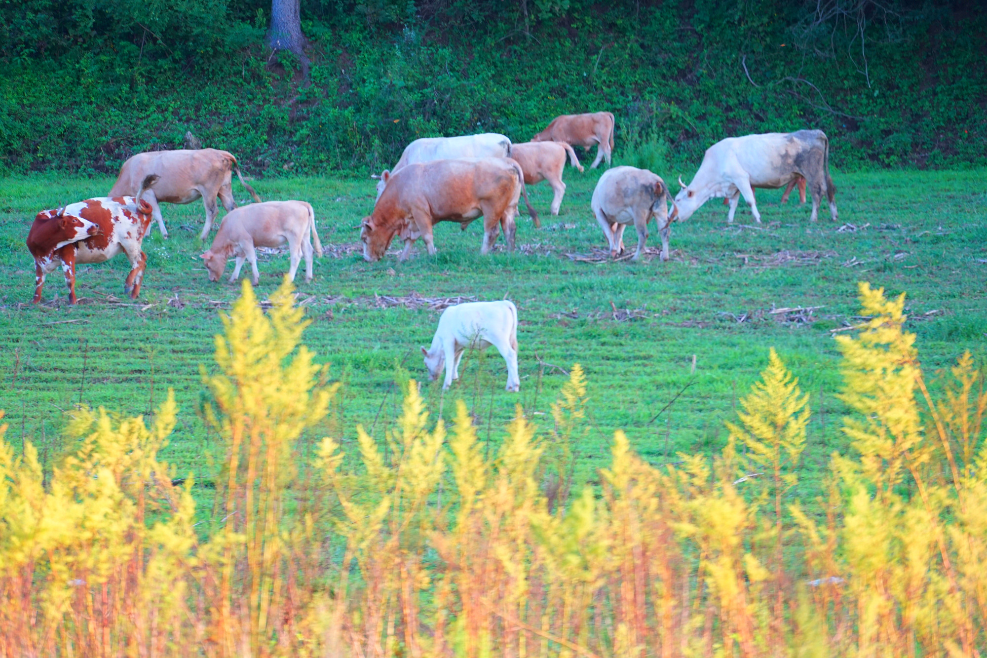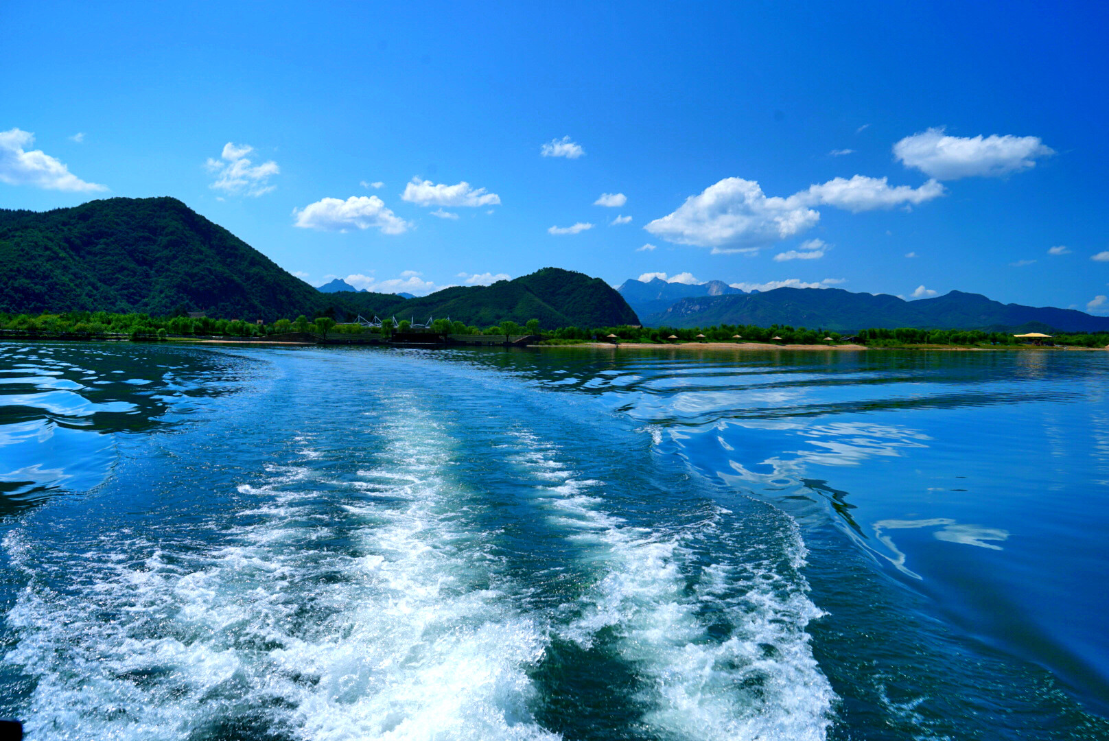 岸边悠闲吃草的牛儿,水面盘旋的苍鹭,为这游玩的人们带来最美的风景。