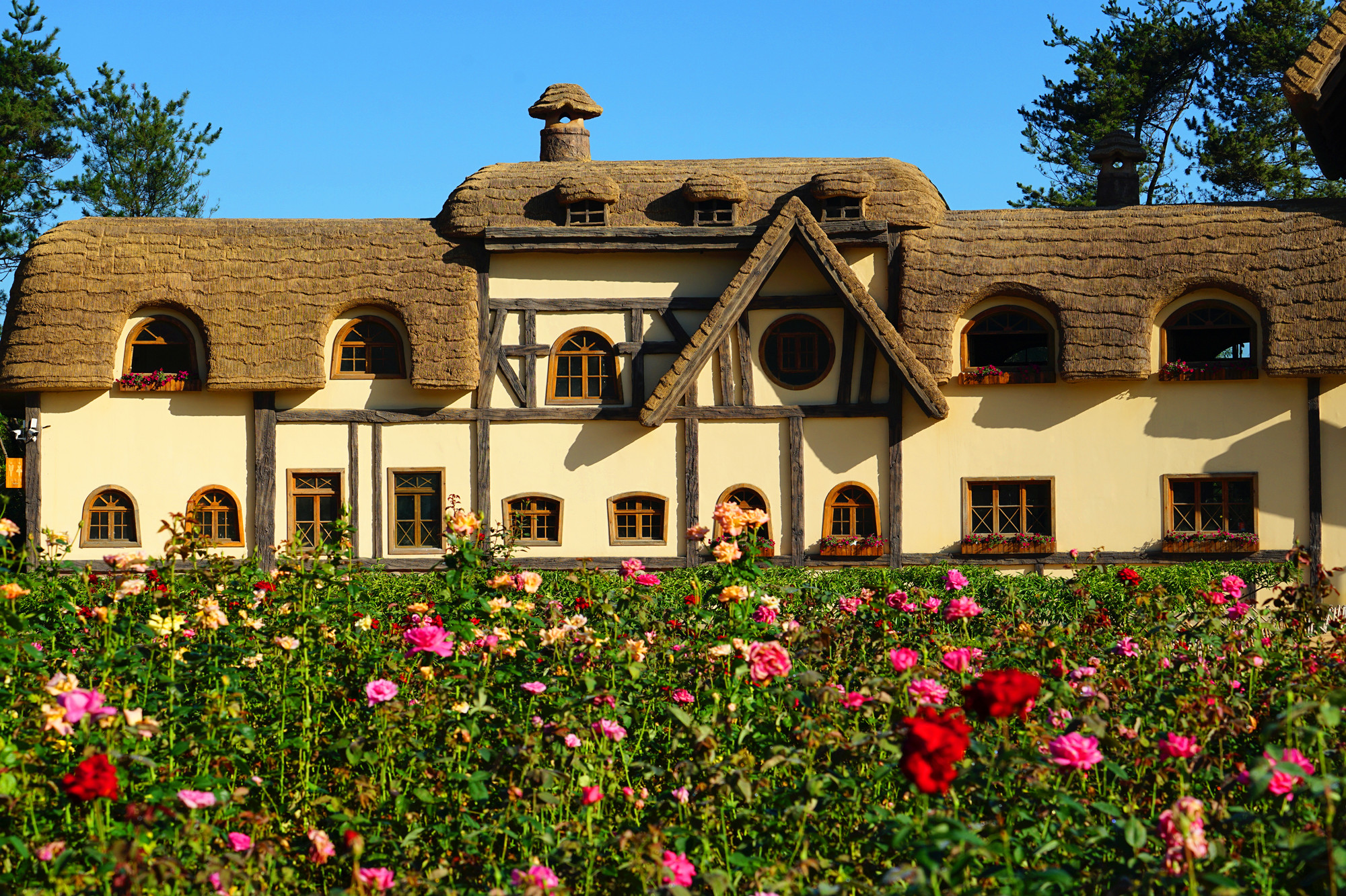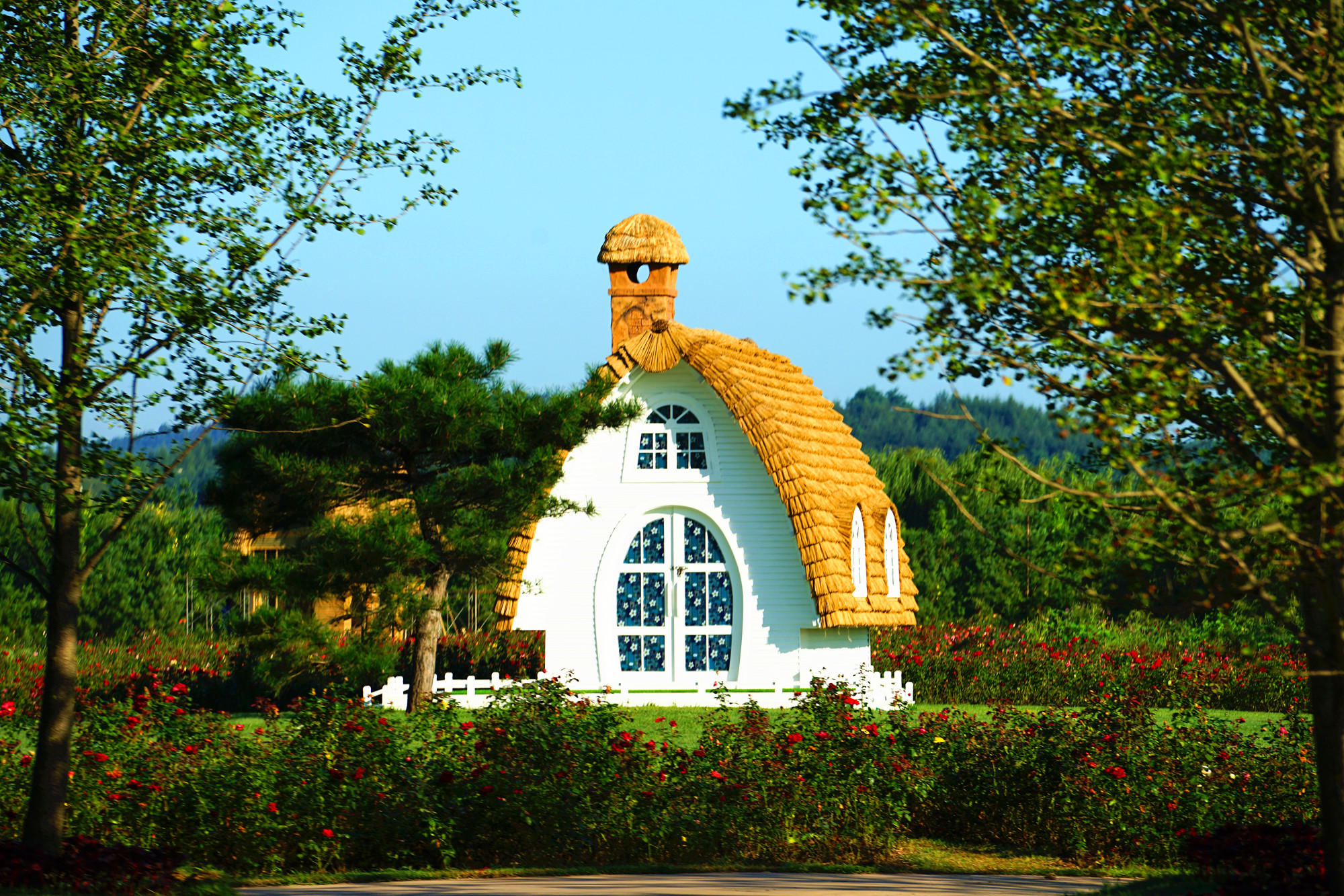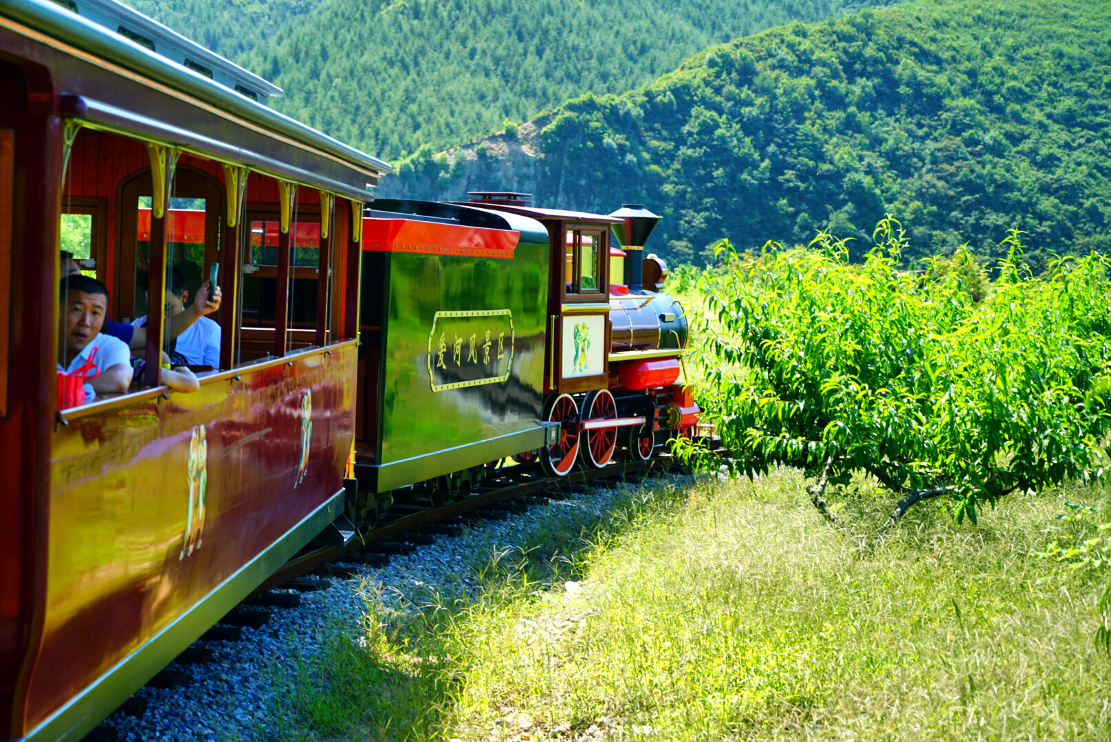 水边玩够了,再坐上开往森林中的复古小火车,动次动次中欣赏着窗外的美景,蜿蜒曲折的靉河悠悠流淌,郁郁葱葱的庄稼地,花园中的月季飘来阵阵香气,挂满果子的梨树,苹果树诱人无数。
