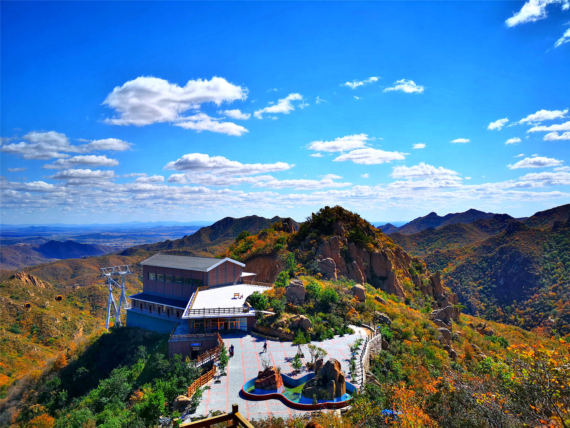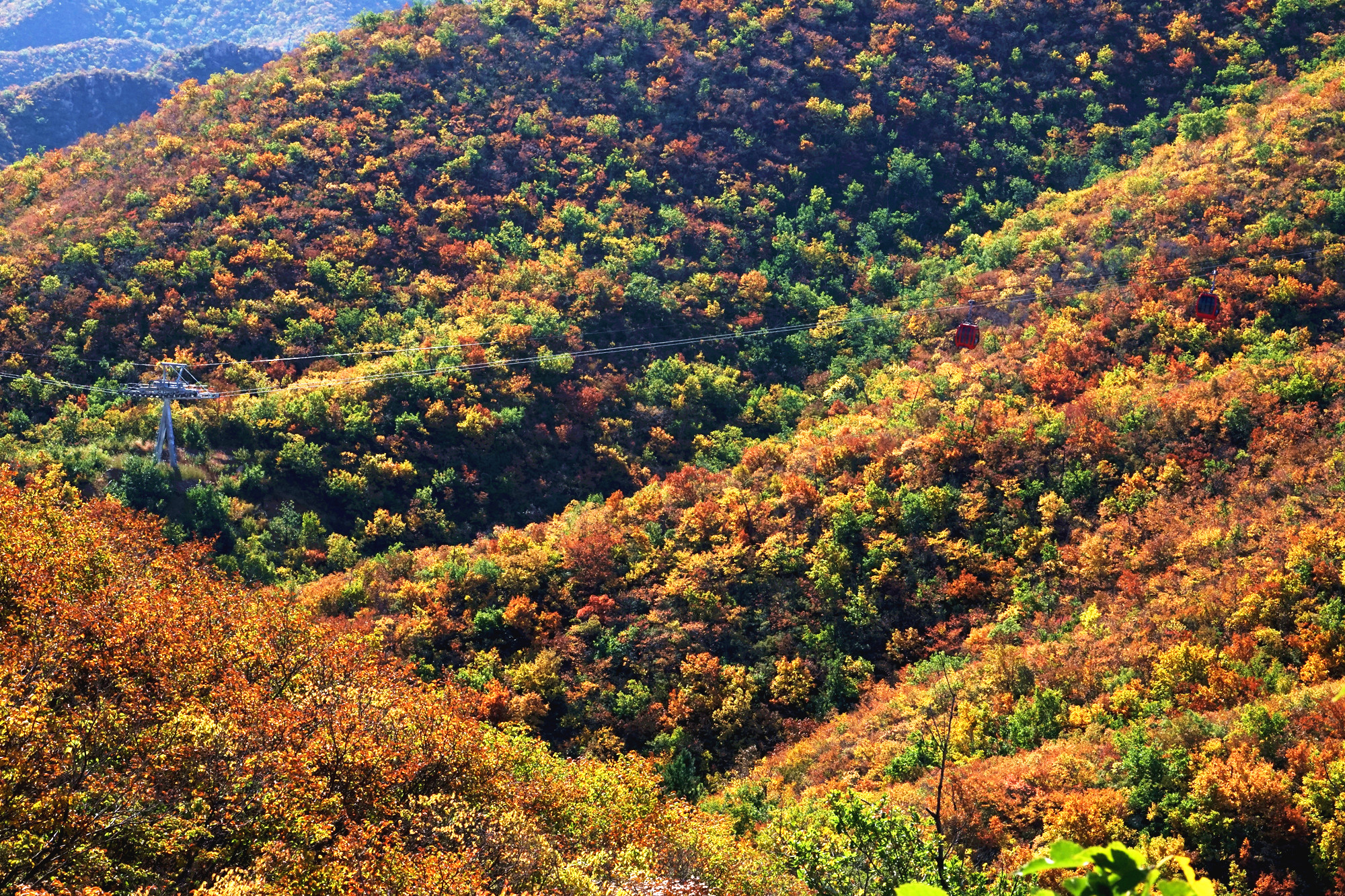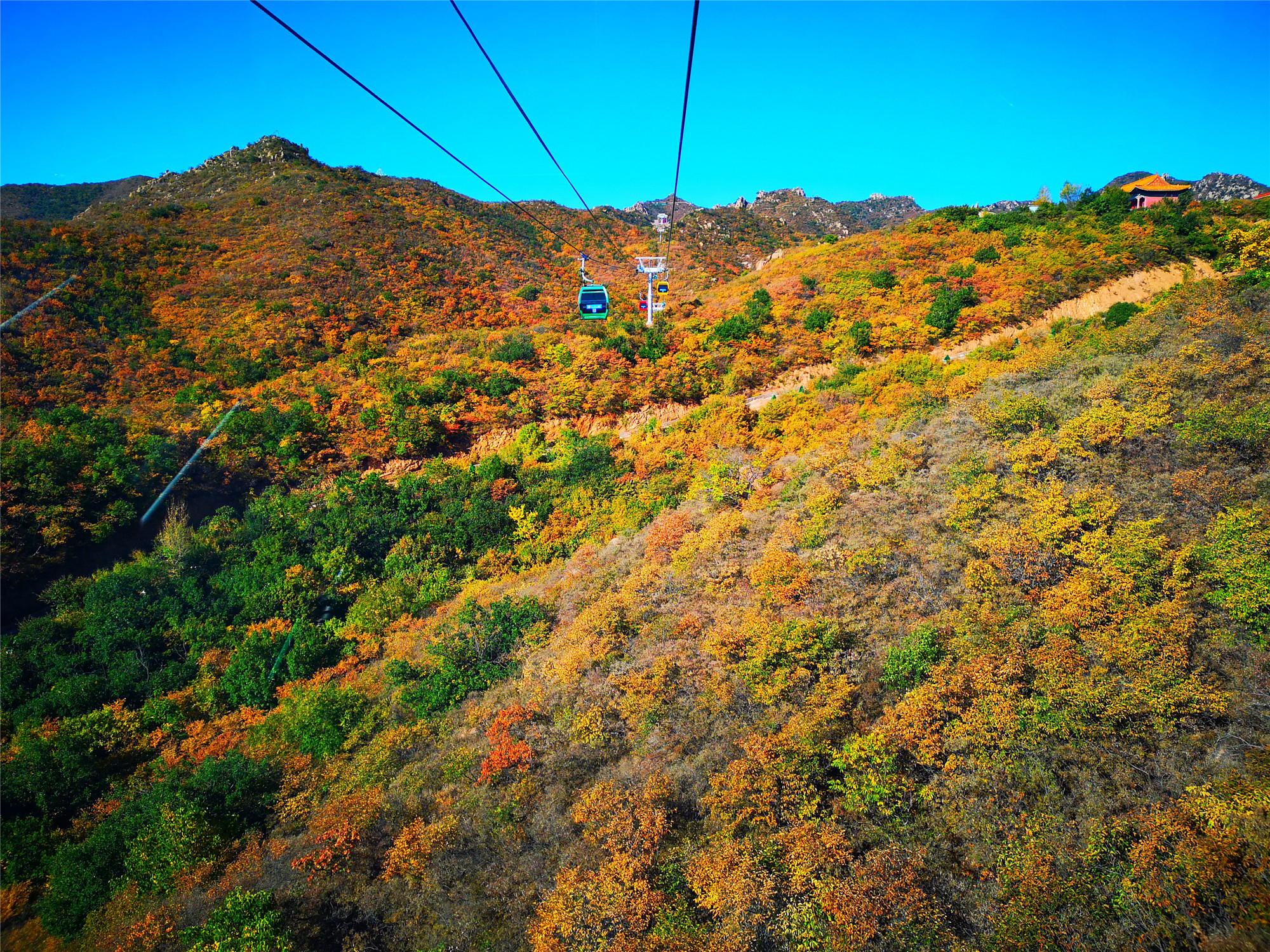 大黑山的索道称得上是最昂贵的,每一个吊厢就是一辆奥迪!奢华,安全舒适。当索道缓缓上行中便可一览大黑山全景,山上的怪石也在此时看得格外清晰。索道随着山势而上,引人入境,让你陷入一场奇幻之旅。秋意正浓,山间五彩斑斓,绿色还没完全离场,秋意已经掩盖不住。大黑山的美在这个秋季淋漓尽致的展现在眼前。