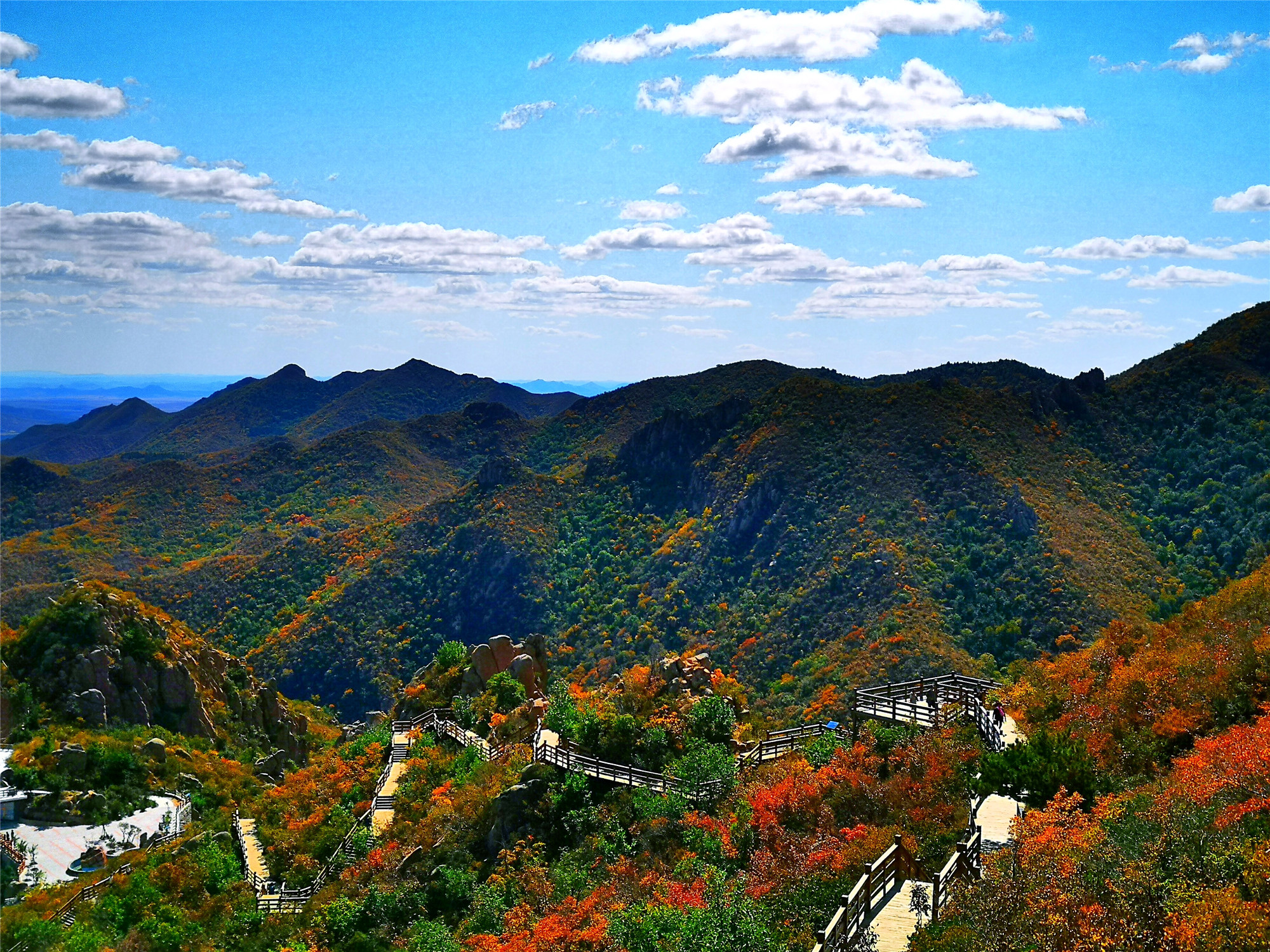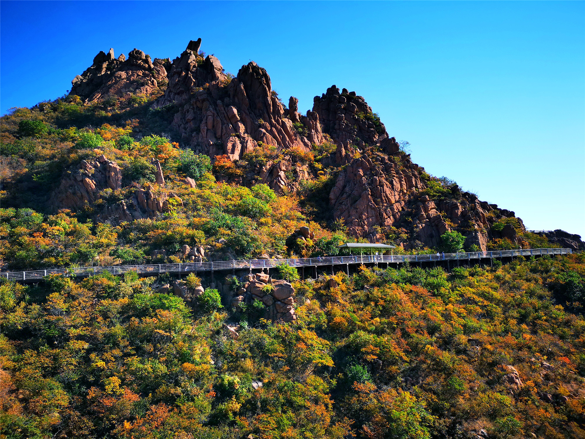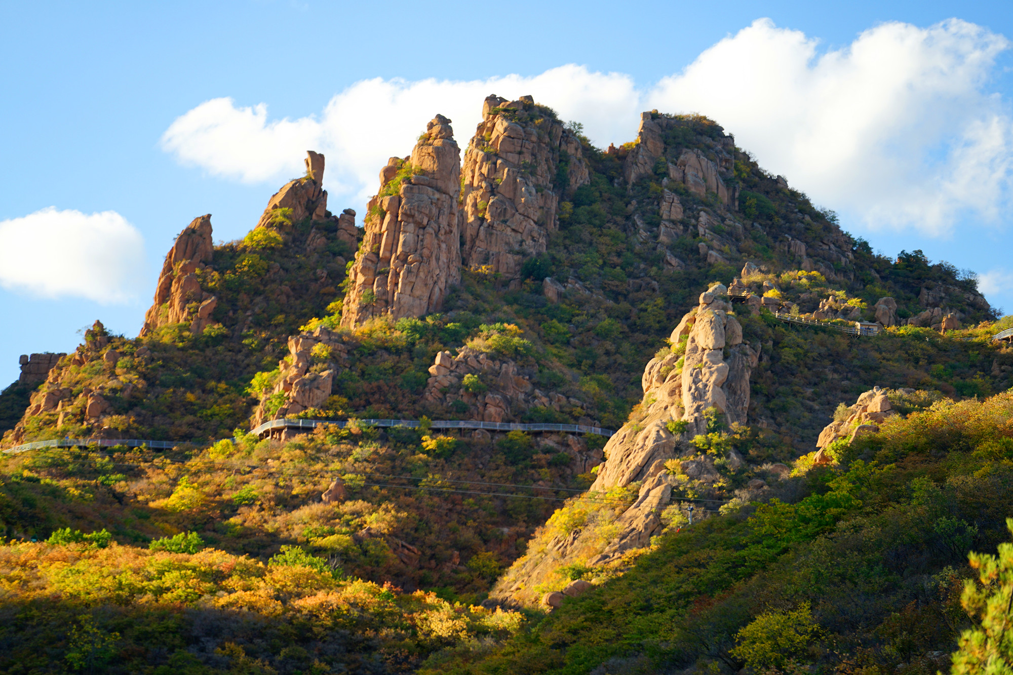 大黑山的索道称得上是最昂贵的,每一个吊厢就是一辆奥迪!奢华,安全舒适。当索道缓缓上行中便可一览大黑山全景,山上的怪石也在此时看得格外清晰。索道随着山势而上,引人入境,让你陷入一场奇幻之旅。秋意正浓,山间五彩斑斓,绿色还没完全离场,秋意已经掩盖不住。大黑山的美在这个秋季淋漓尽致的展现在眼前。