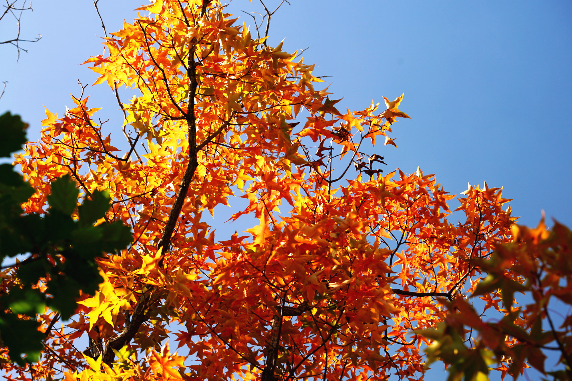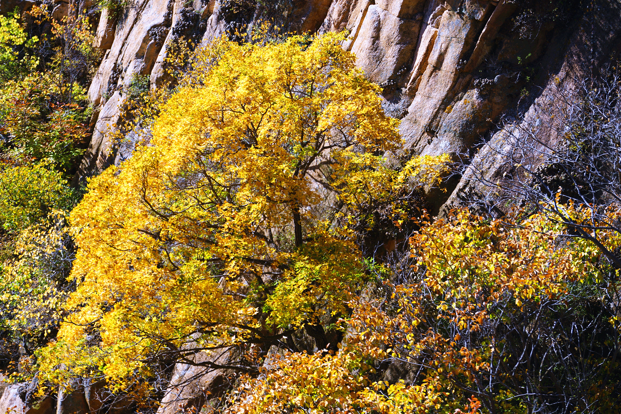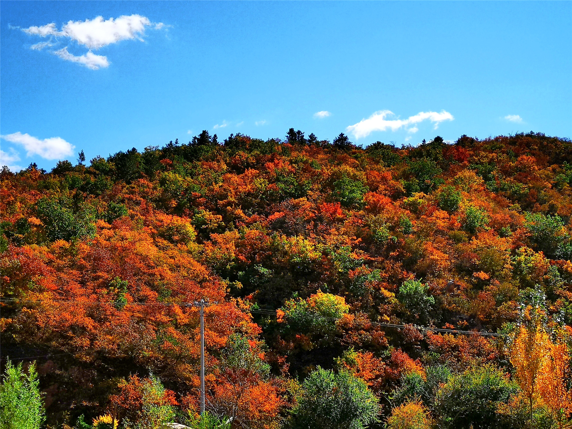 清晨的光洒遍整个山峦,将山的层次分的那么清晰明朗,山上的红叶在此刻格外漂亮。红的透亮,黄的诱人,绿的自然。秋季的大黑山正因为有了这不同的色彩,才会如此的让人迷恋。