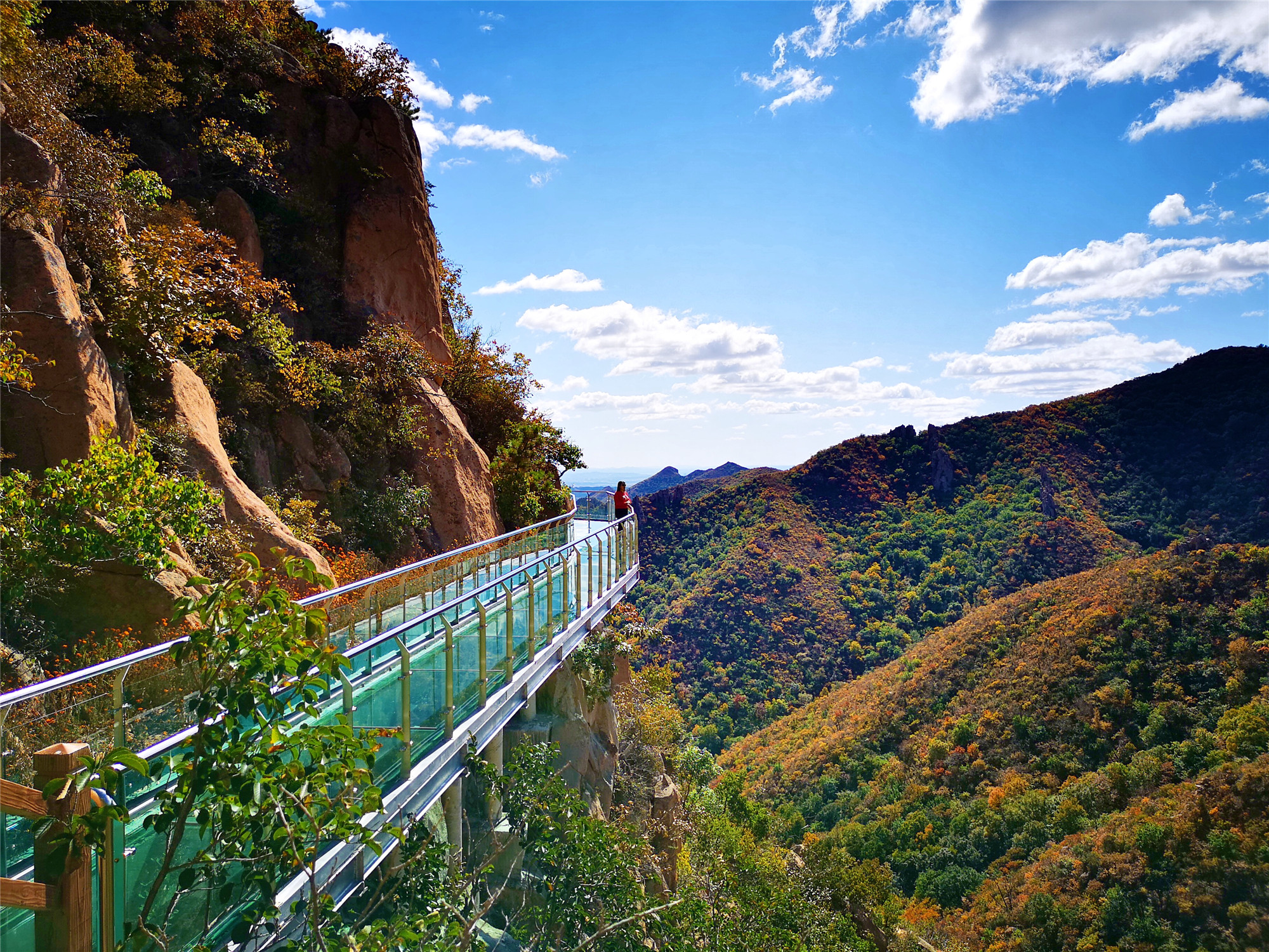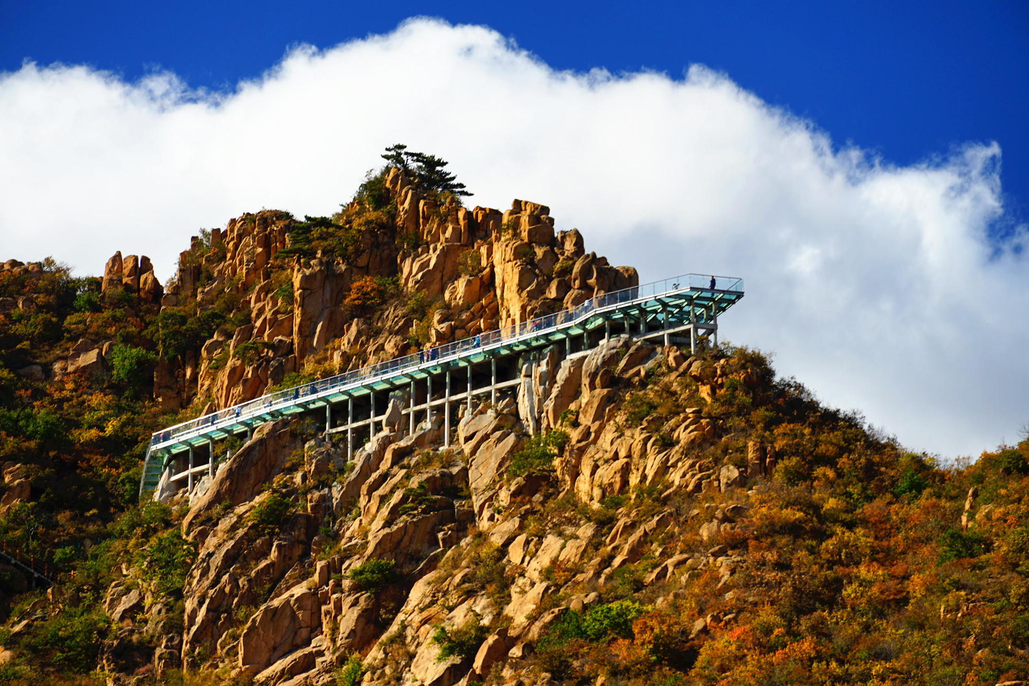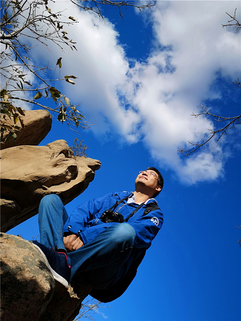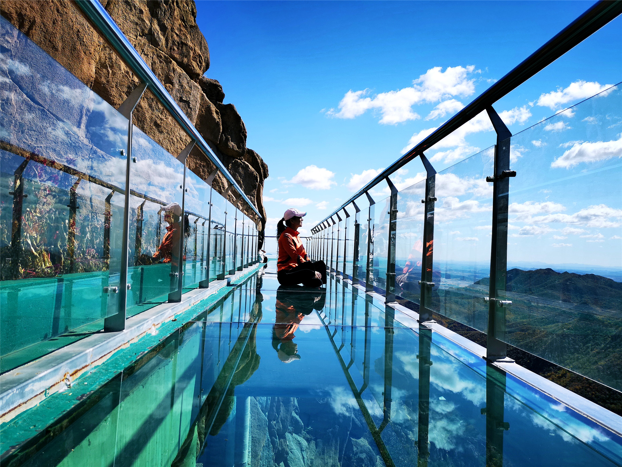 看完怪石就来一场心跳之旅,在大黑山有一条玻璃栈道,全长99米,安全性很好,是围着山体而建的。在这里坐下拍张照片也是很有意境的,蓝天白云全部映射在玻璃上,如天空之境,坐于云端。听这里的人讲,大黑山的秋季几乎每天都会蓝天白云,我们来的这两天,确实也是这样。云彩一般都会在上午十点左右就从山后一点点的飘来,刚开始会是一朵,两朵,慢慢的就会聚集成满天的云朵。天空蓝的纯净,云儿就在头顶盘旋,似乎触手可及。