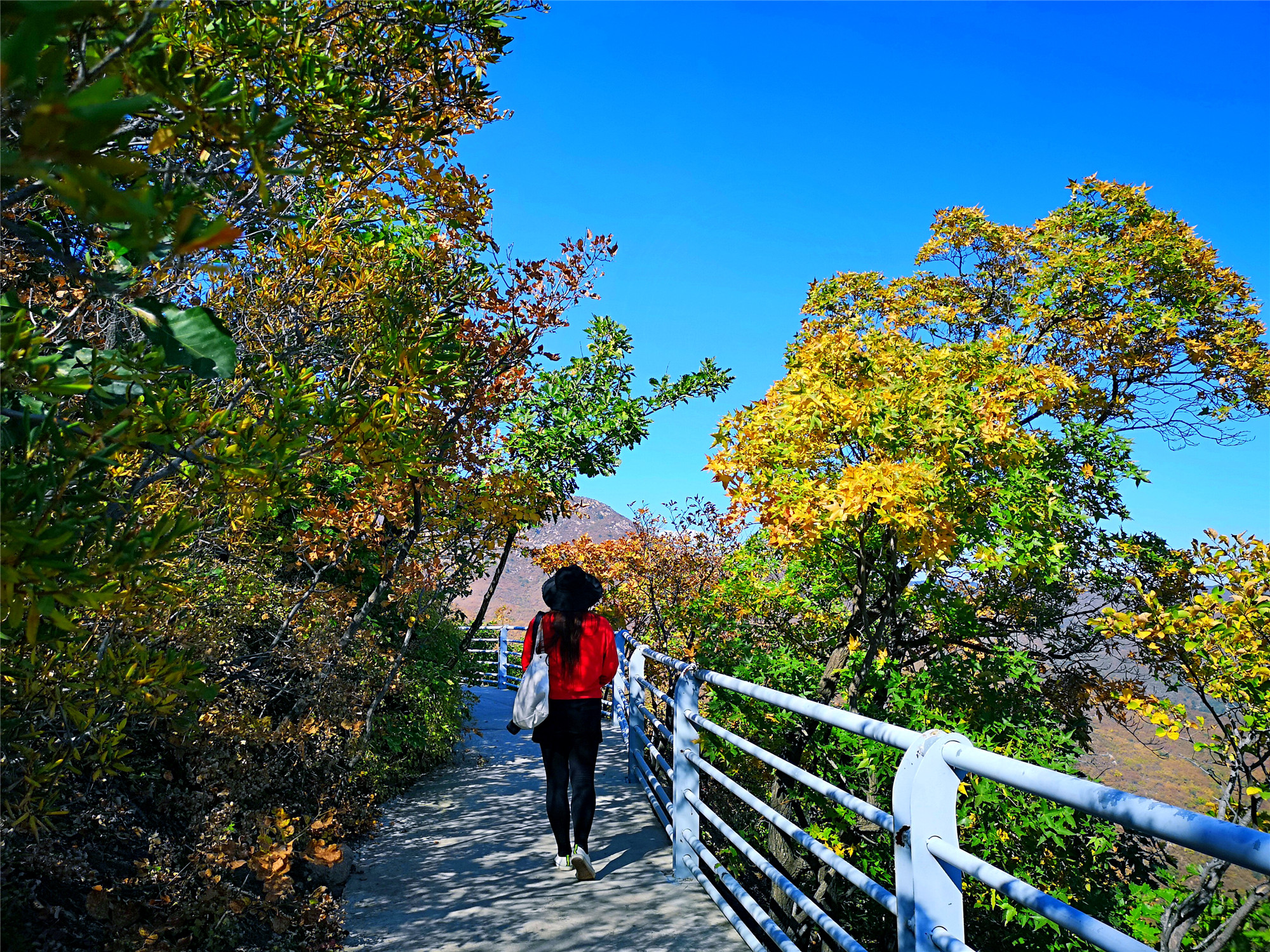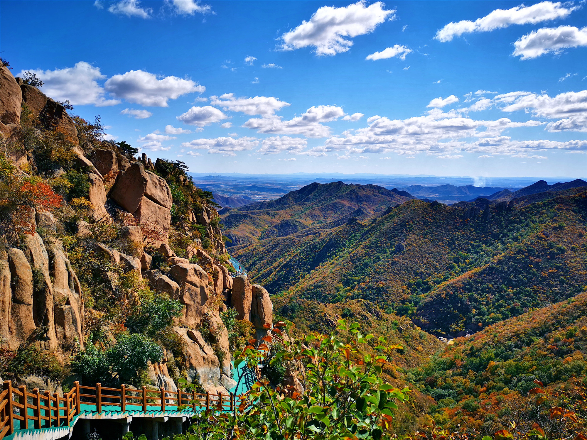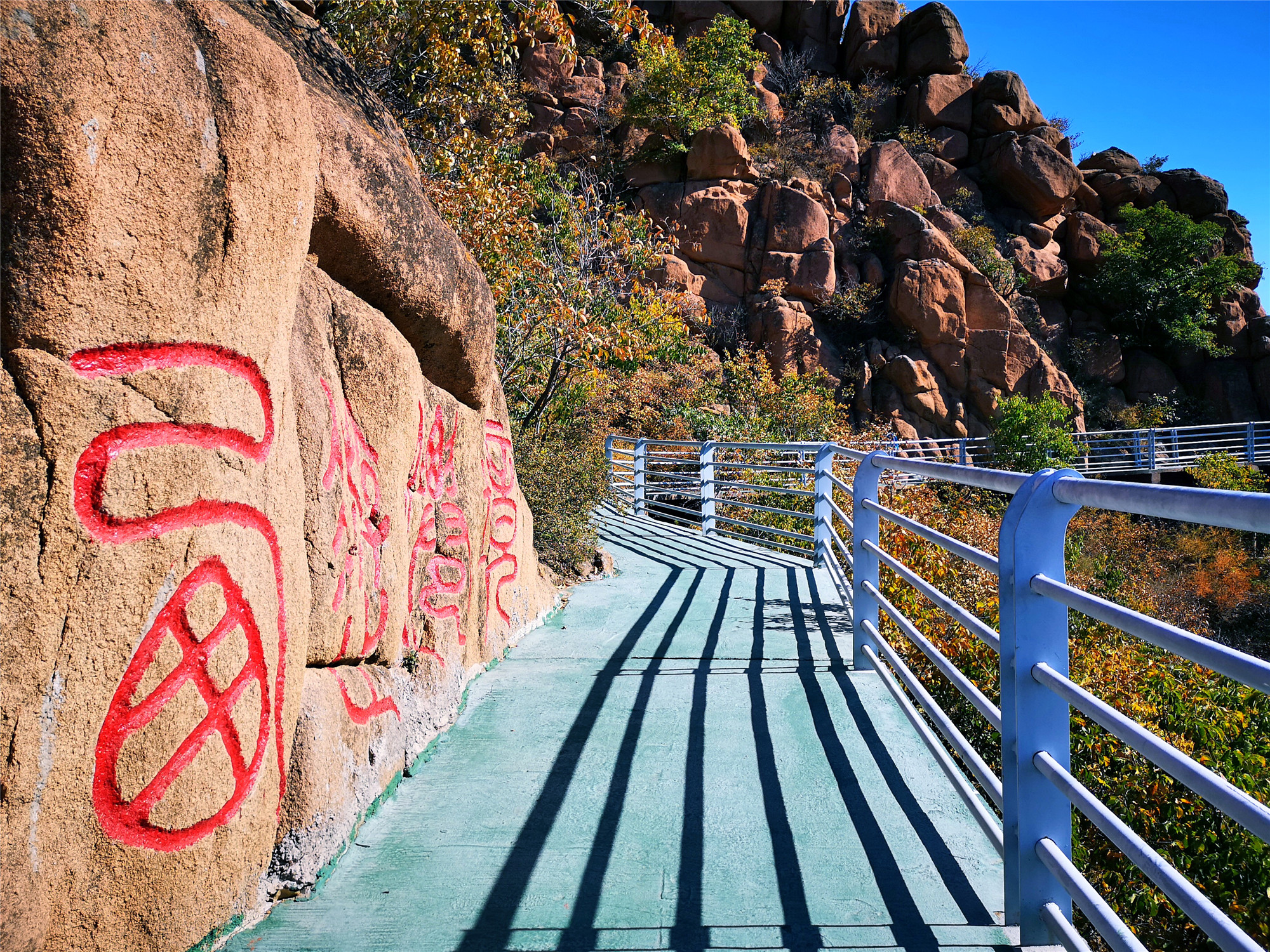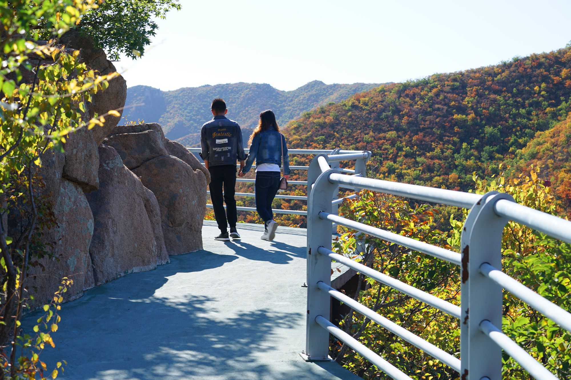 看完怪石就来一场心跳之旅,在大黑山有一条玻璃栈道,全长99米,安全性很好,是围着山体而建的。在这里坐下拍张照片也是很有意境的,蓝天白云全部映射在玻璃上,如天空之境,坐于云端。听这里的人讲,大黑山的秋季几乎每天都会蓝天白云,我们来的这两天,确实也是这样。云彩一般都会在上午十点左右就从山后一点点的飘来,刚开始会是一朵,两朵,慢慢的就会聚集成满天的云朵。天空蓝的纯净,云儿就在头顶盘旋,似乎触手可及。