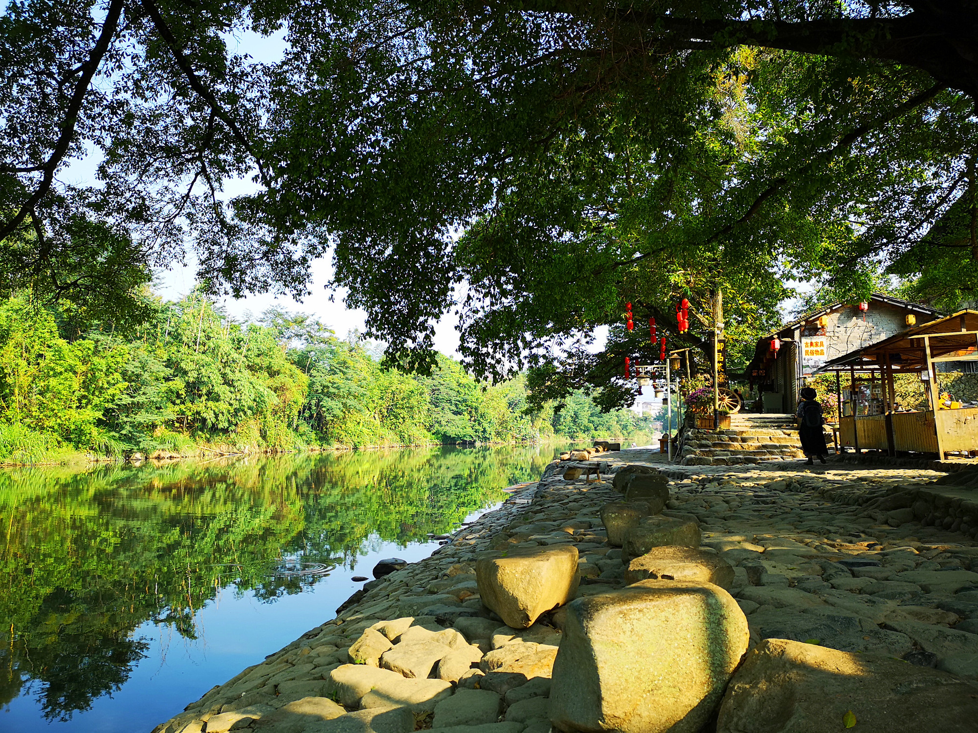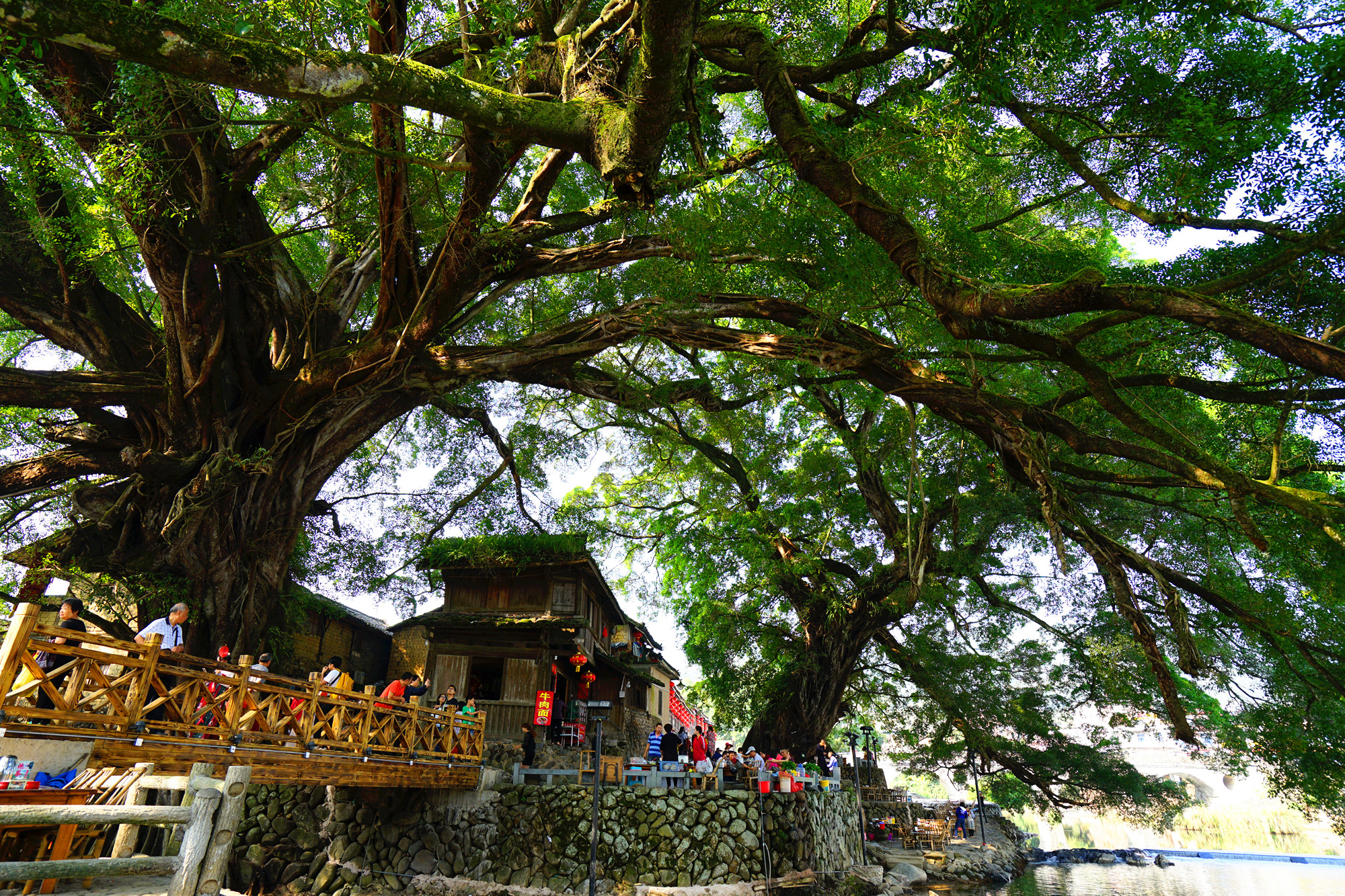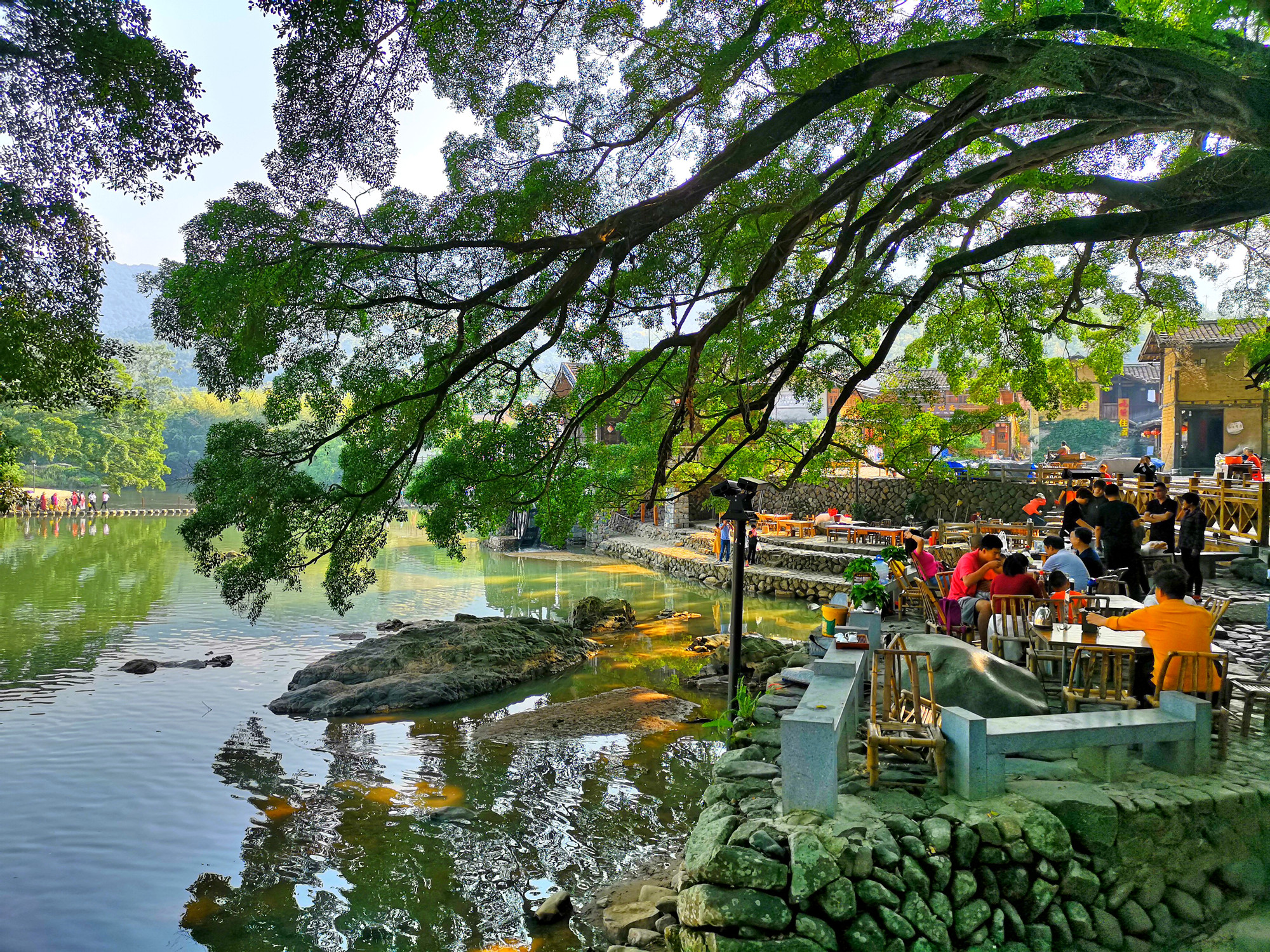 这些大榕树守望着云水谣的过去,今天与未来。今天的云水谣因为有了如此庞大的榕树才有了灵性,也正因为这些古树的存在,才会成为众多的电影的取景地。沿着河边一直走,一路上有很多的大榕树,有在树下喝茶的,有吃饭的,都是托了榕树的福,云水谣才会如此的吸引人。可是树下的摊位有点煞风景,还是要好好的规划整齐一点。而且这里的茶就更不用说了,带我们的司机师傅都提醒我不要买这里的茶叶,更别说喝茶了,茶叶质量差,价格还贵。