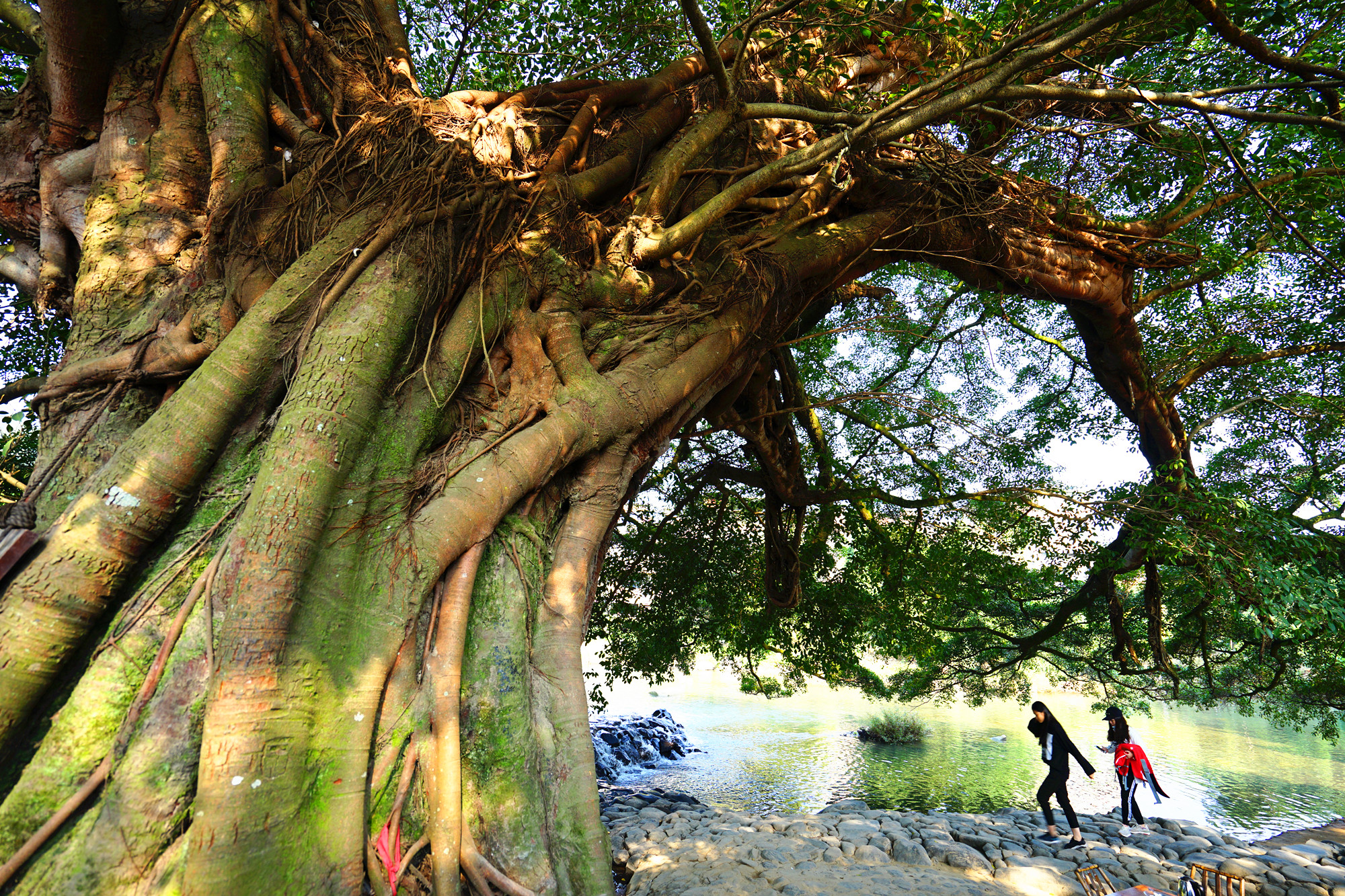 云水谣值得看的恐怕就是这水边的大榕树了,其他的我不敢说有多美。就在我们住的河边有一棵365年的古榕树,树形非常的美,在清晨的阳光下,确实有意境。尤其是河边再有几个人走动,画面会很震撼。裸露在外的树根弯曲盘旋,向过往的路人诉说着它的古老。