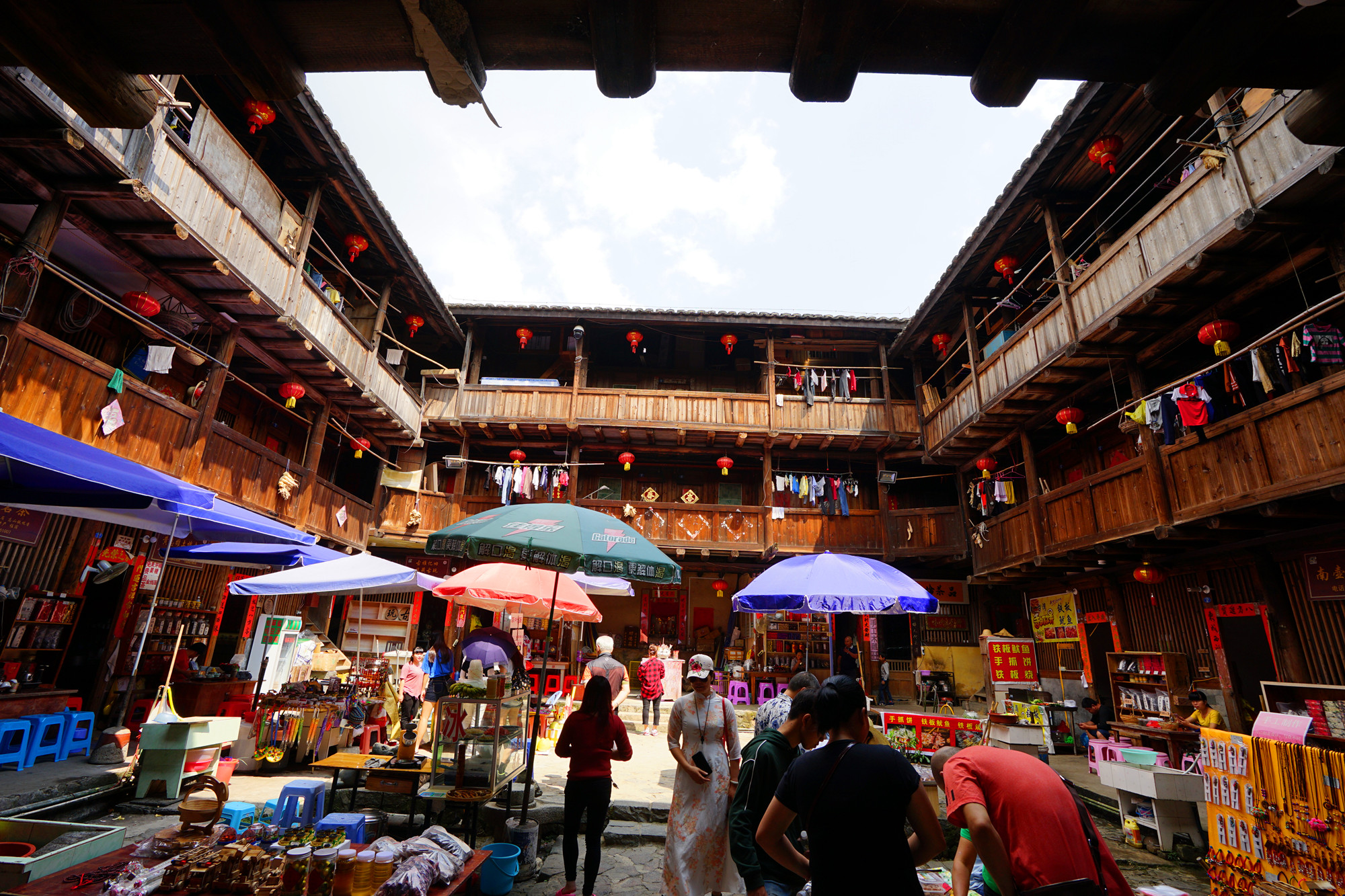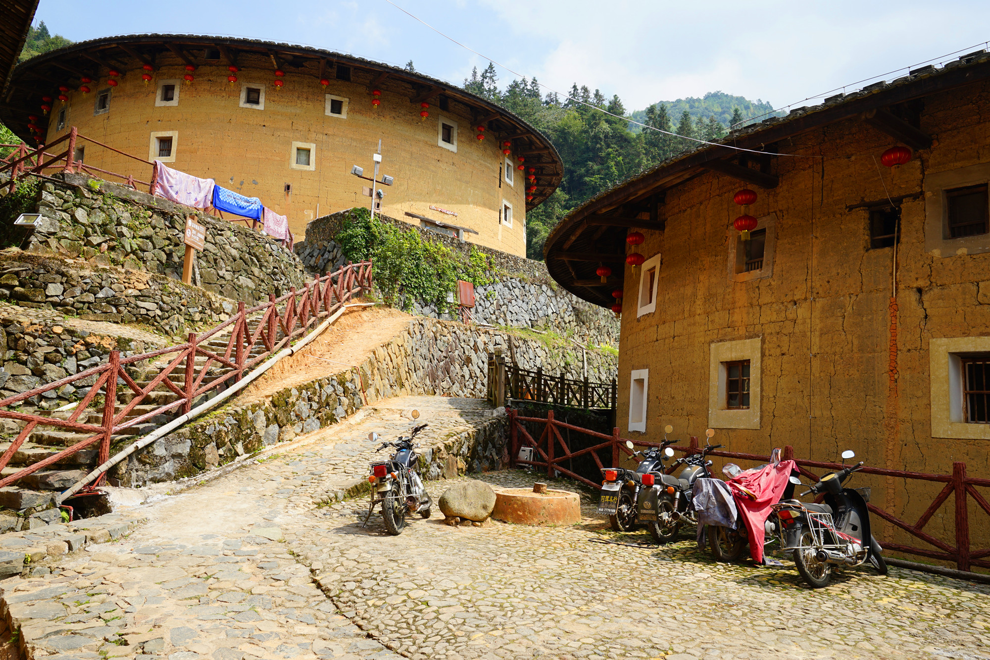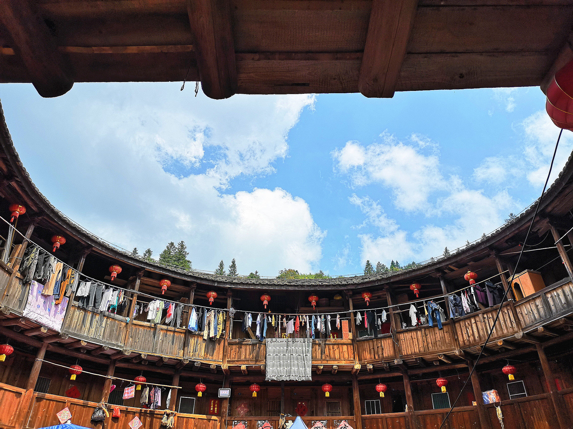 田螺坑土楼群最好的地方就是它的外观,尤其是站在观景台看到它的全景。由于是四个圆楼和一个方形土楼,被当地人称为“四菜一汤 ”。里面因为住了很多户人家,显得有些杂乱,小商品摆满了整个楼里面,有些嘈杂,楼上挂满了衣服,体验感不是很好。只进去了一个就不想再进去第二个。只好在外面看看,外面也是到处摆满了杂物,晾晒的被子随处可见。俨然一个村庄,不像是世界文化遗产所在地。总是说要有生活气息,个人认为还是要收拾的干净整洁才像个景区的样子,既要保留传统的东西又要有好的自然环境。