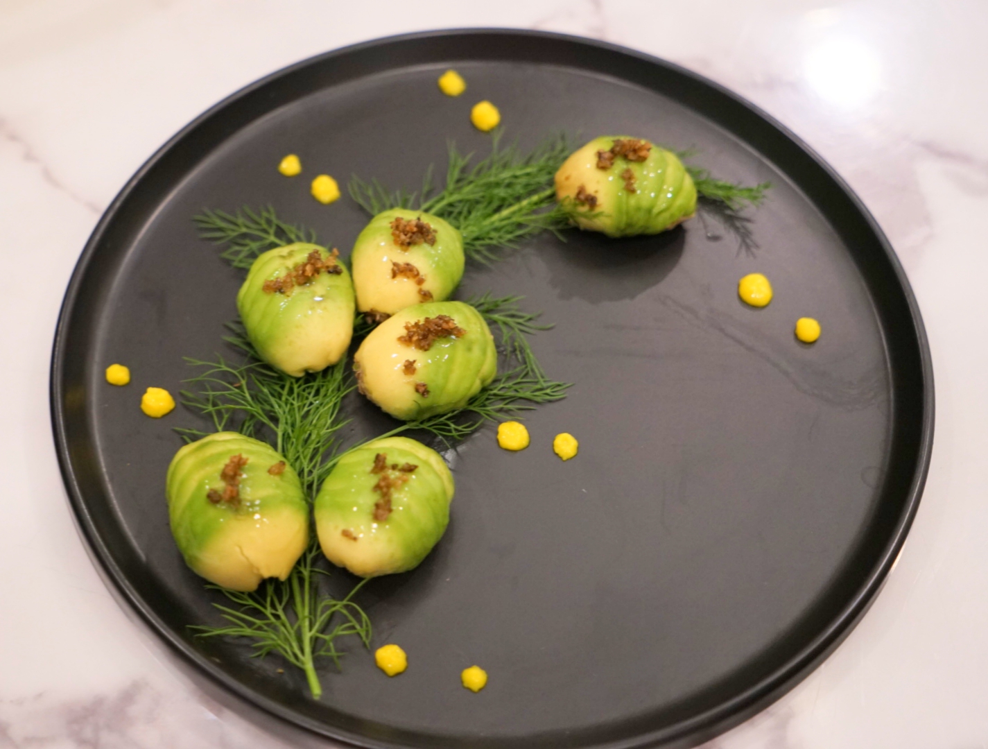 这是黑松露甲壳虫,真的很像虫,这是用牛油果片裹着黑松露,吃到嘴里清香鲜美,这道菜无论是造型还是口感都很棒!