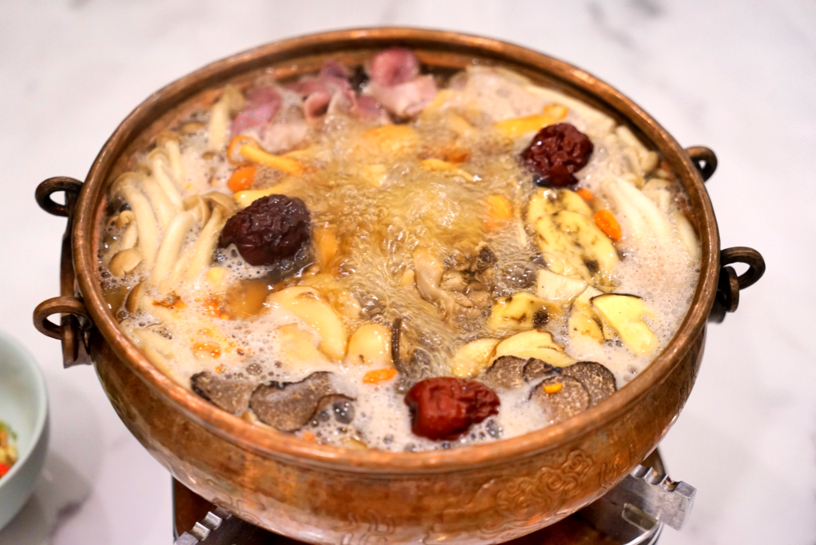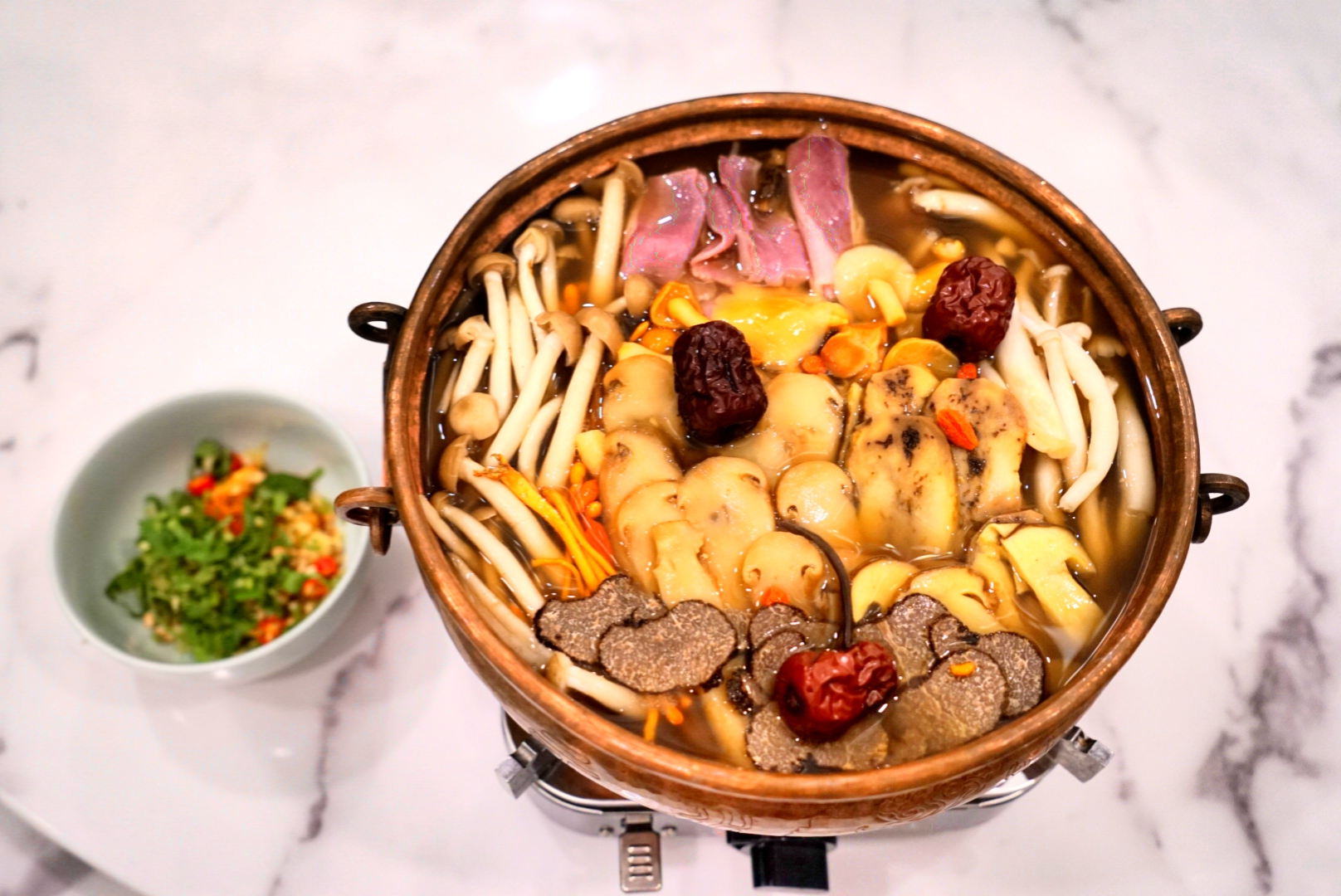 云南养生菌香土鸡锅,云南老土鸡和野生菌(牛肝菌,香格里拉松茸,黑松露,杂菌)熬制而成.养生滋补,而且吃了不上火。主要配料无量山老火腿、无量山古茶、云南走地乌骨鸡、云南野生菌。用了这么多的好食材,怪不得这汤喝着如此的鲜美,清淡不油腻。