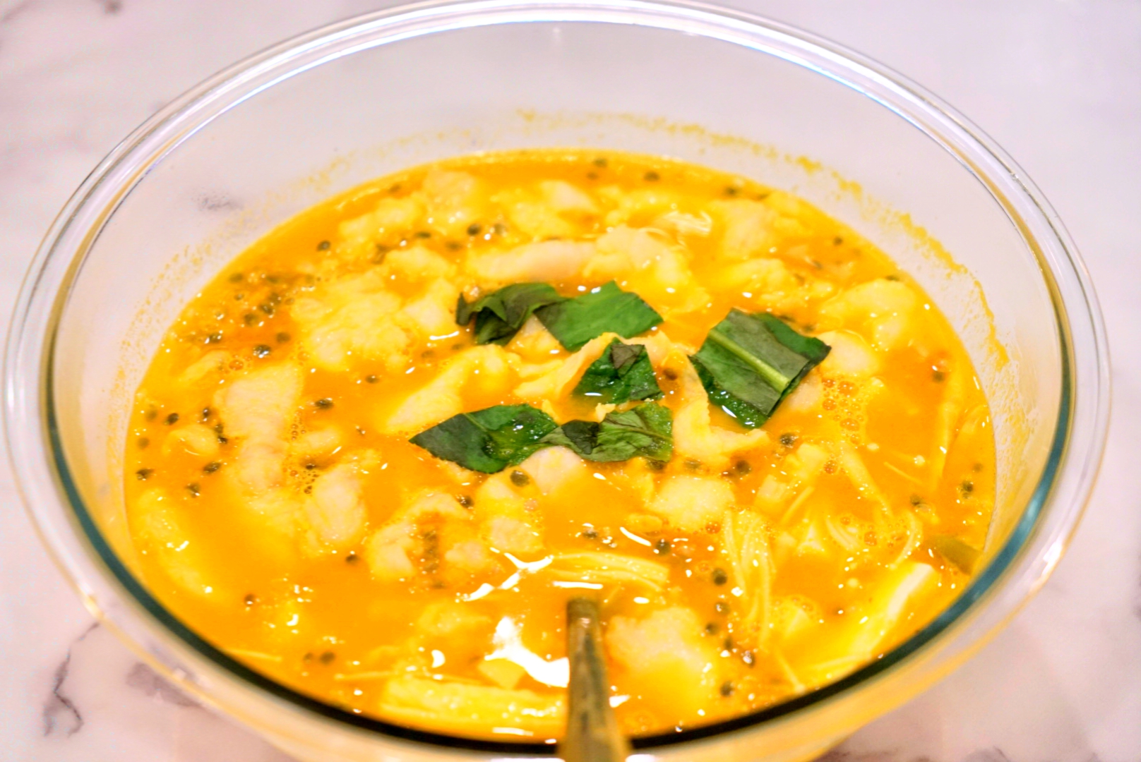 这个金黄的浓汤是爱情果煮鱼,我最喜欢,用了百香果汁,龙利鱼片,所以汤汁酸酸辣辣,鲜而不腻,很开胃!