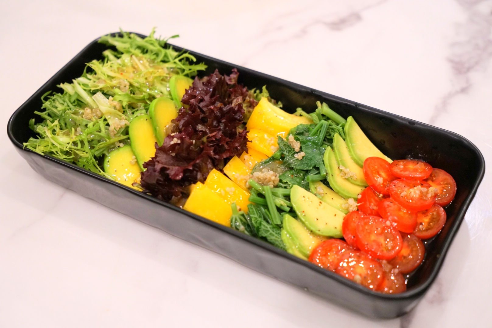 油菜汁彩云沙拉,看这摆盘造型就很诱人爽口,尤其是里面有足够多的牛油果片,感觉好高大上哦!主要是很好吃。
