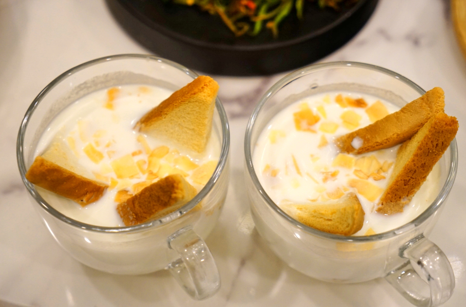 一杯椰香味十足的泡鲁达,冰凉爽口的就着热乎乎的火锅,简直就是绝配。奶油面包干,泡在奶香浓郁的冰水中,入口即软,酥脆香甜,滑口Q弹的西米粒料很足。
