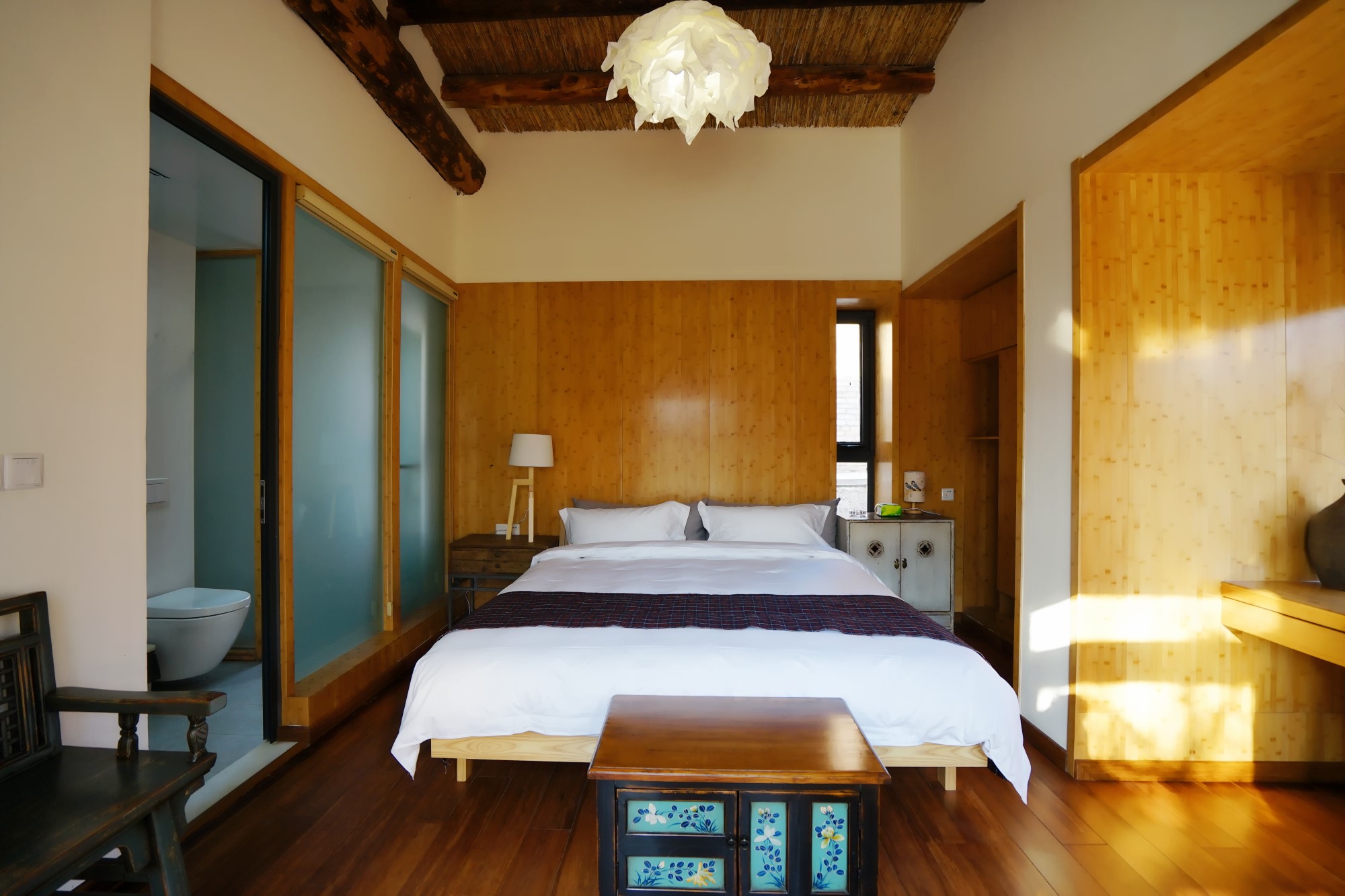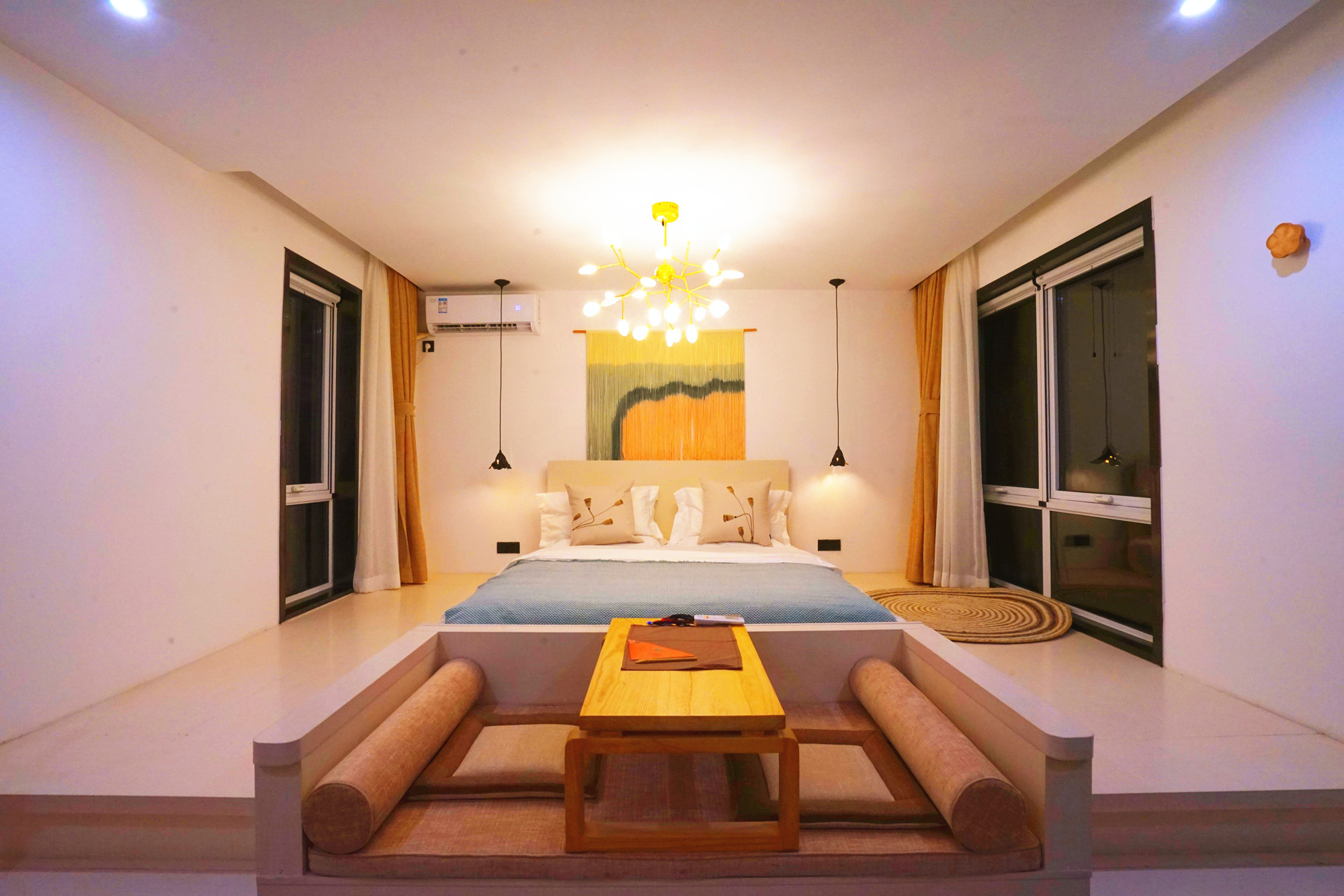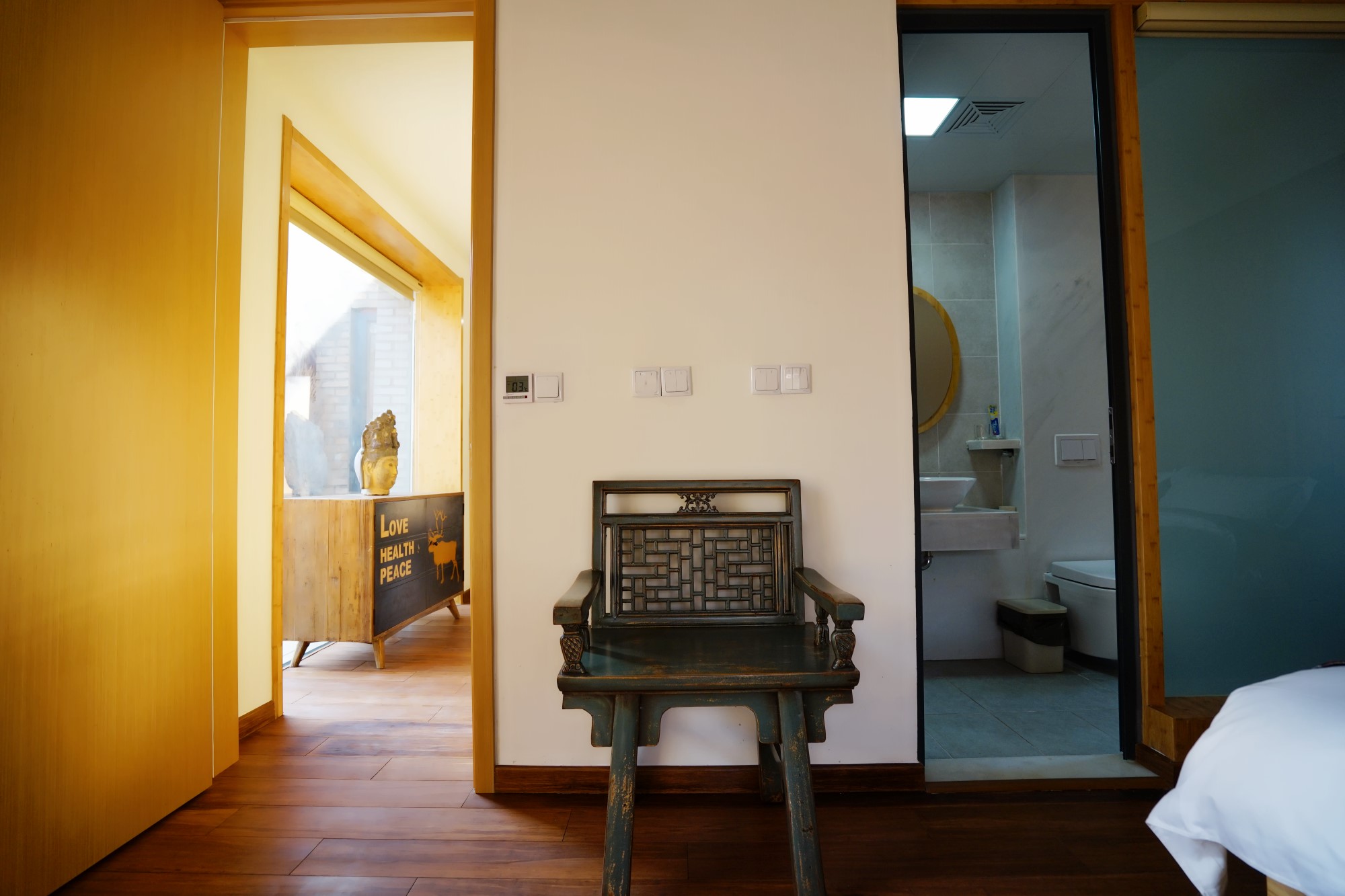 我们住的村宿都是独立的院落,每一个院子的大小都不一样。我住的是有两个房间,带一个大客厅,有庭院的小院。房间的格局非常棒,大床房。房间内的小摆件都与荷花息息相关,残荷的灯饰,绣着荷花的靠枕,墙壁上的挂件都是荷叶的形状。