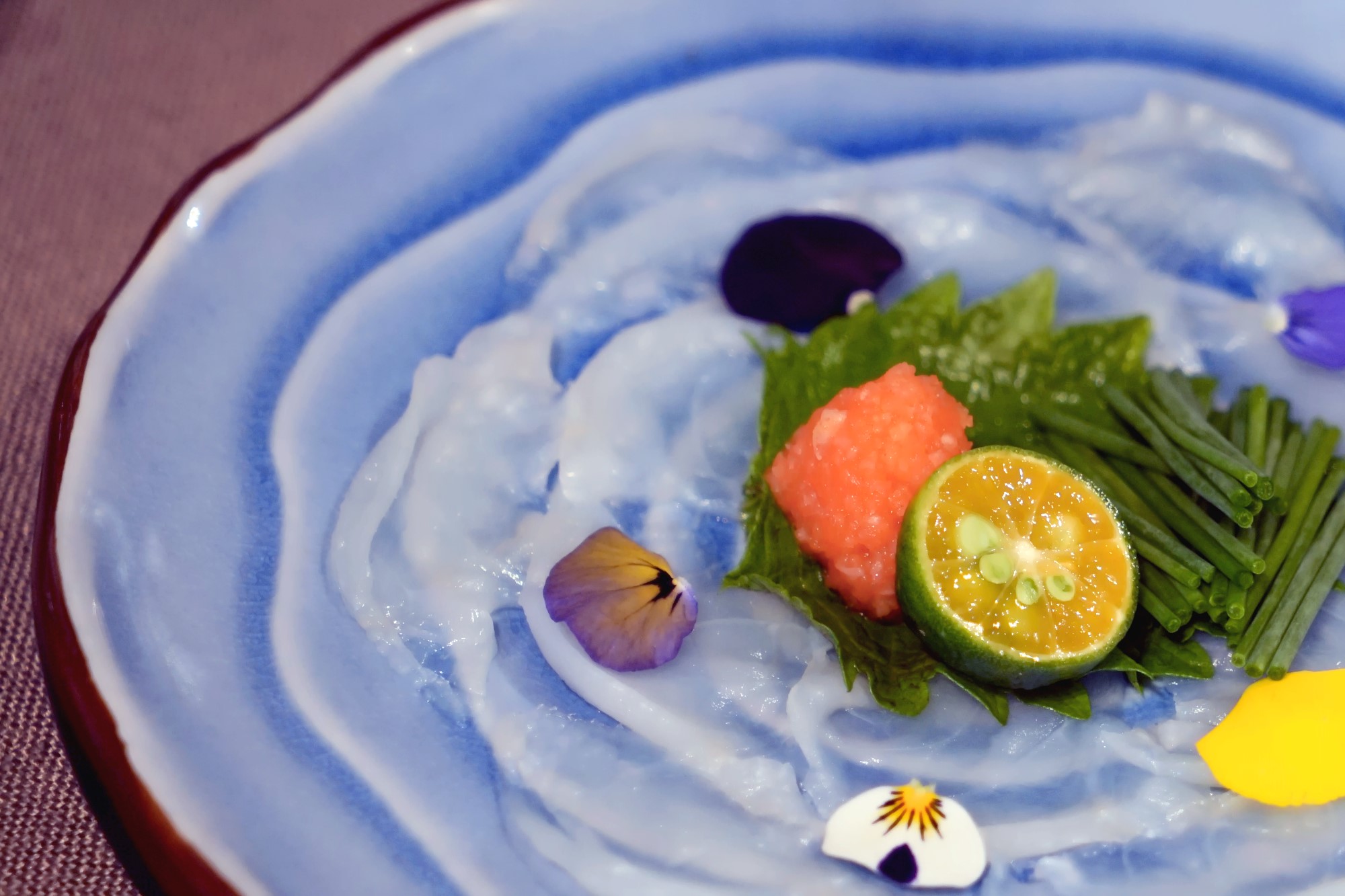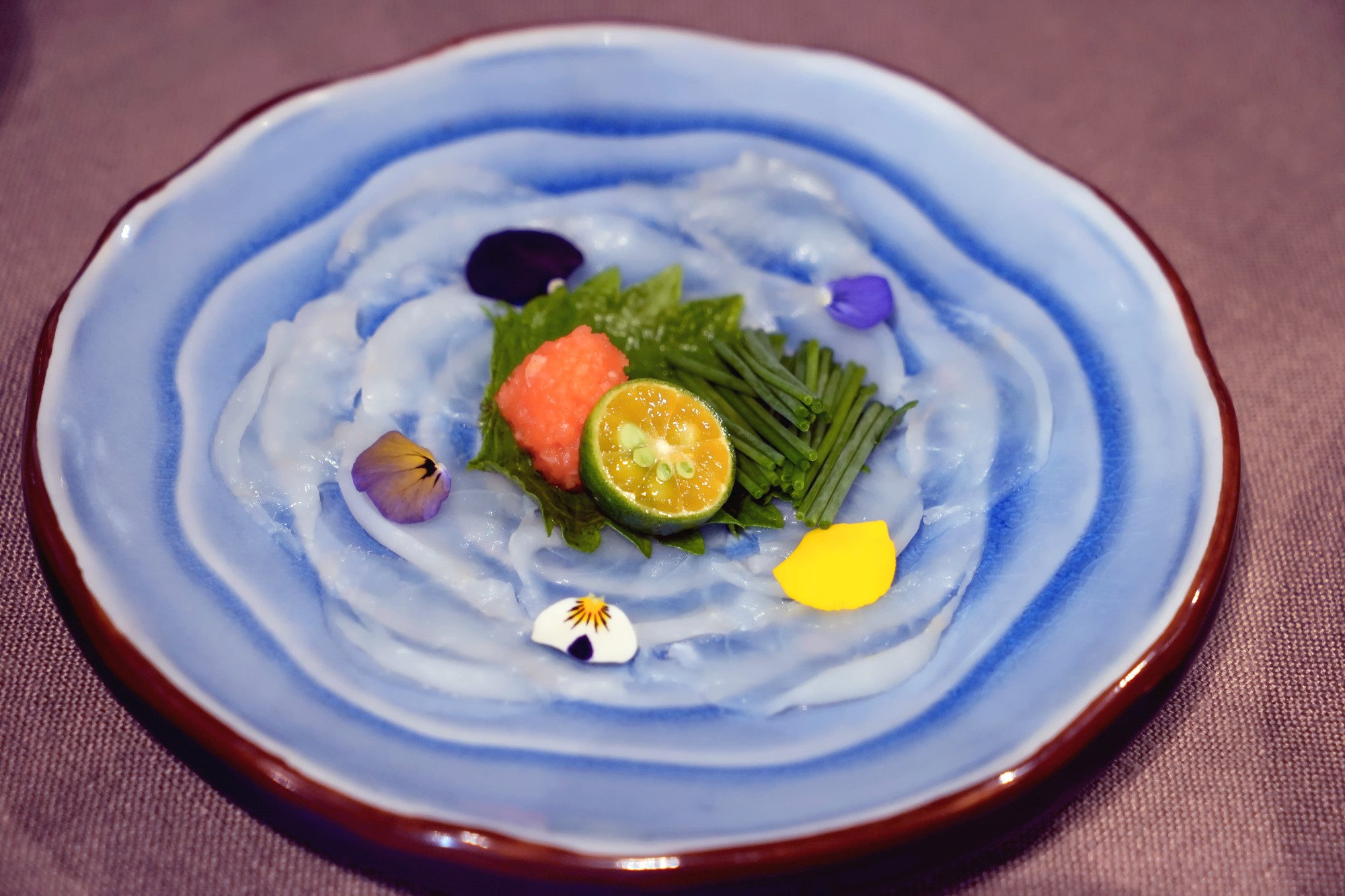 【河豚刺身】精选产自海洋的三年龄成熟红鳍东方豚,体重约1000-1200g,红旗东方鲀因捕捞上岸后鱼鳍充血呈红色而得名,俗称虎豚,又称海虎,在海中以虾夷扇贝为食,异常凶猛。红鳍东方鲀肉质鲜美,营养价值颇高,其背鳍至尾鳍部分的肉质因运动量最大变得劲道有弹性,河豚刺身正是选用这一段肉质薄切而成。顶级河豚厨师出品的河豚刺身,薄如蝉翼、背可透光,配以红姜汁萝卜泥和日本小香葱卷成卷,蘸取肆月河豚自己研发鲜花料汁,配以秋田小町大米调制的鲜花柠檬醋,入口弹韧有嚼劲,口感层次丰富,前味微酸,后味芳香甘恬。造型以桃盛、鹤盛、菊盛等为主,寓意感情和美、健康长寿、富贵吉祥等含义。是味觉盛宴,也是视觉狂欢。