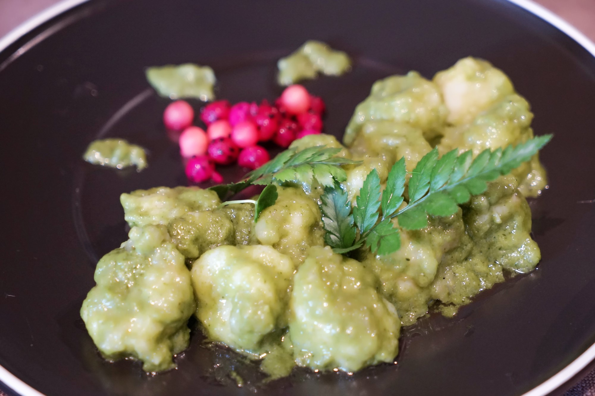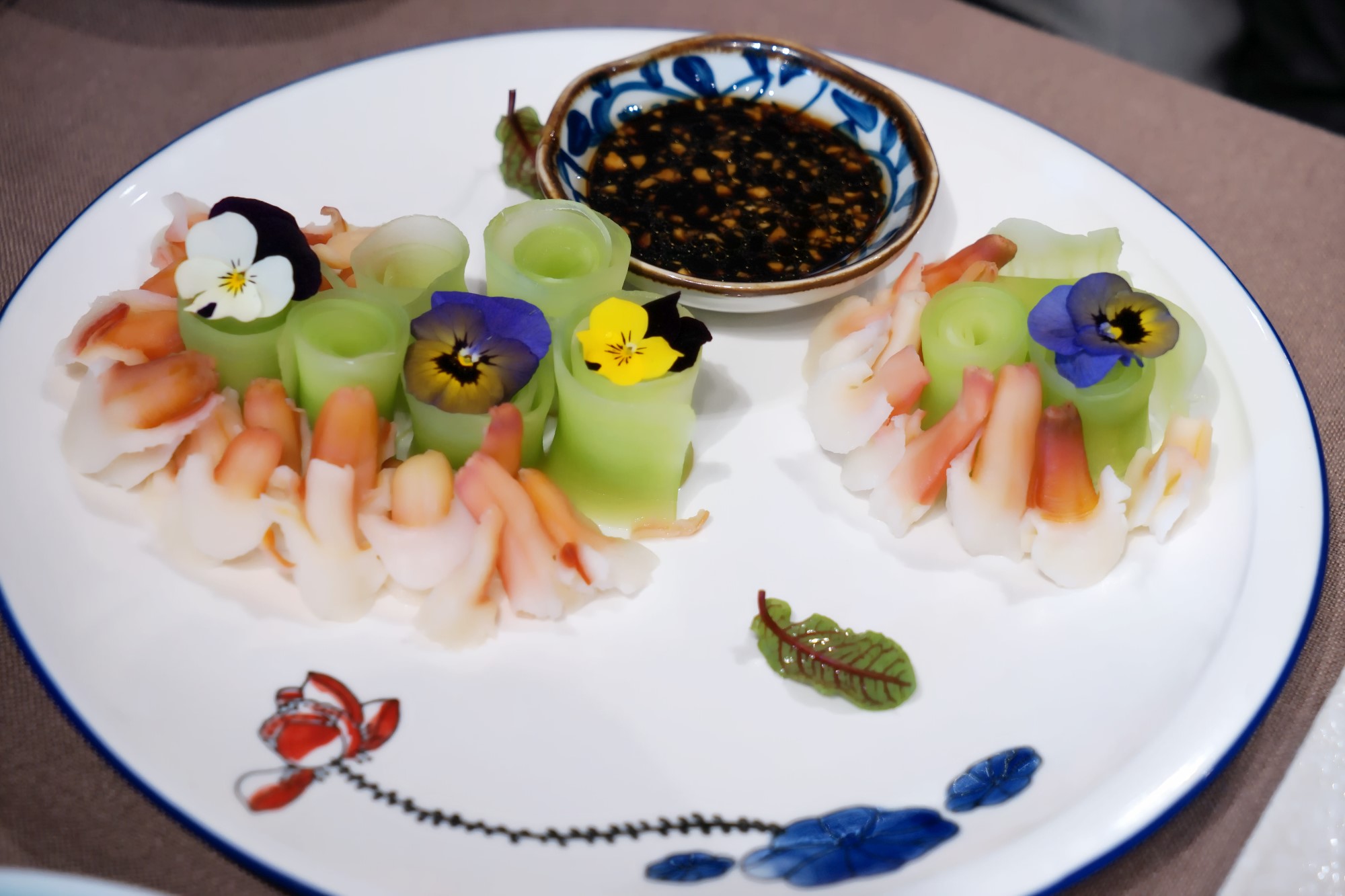 【翡翠兰花蚌】只取整根莴笋中段最脆嫩的1/3部位,片成薄厚均匀的2.5厘米宽长条,盘卷定型,细微之处见刀功。兰花蚌选自加拿大纽芬兰以北的冰冷海域,纯野生海鲜,入口即能感受到海洋的咸鲜,徜徉纽芬兰广阔的海域。配上清香微辣的蘸汁,共同组成了一道清爽、开胃的营养前菜。