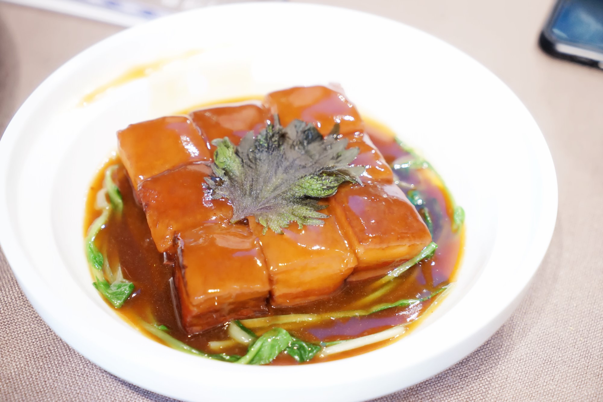 【紫苏红烧肉】以淮扬菜经典红烧肉做法为基础,取新鲜紫苏同烹,紫苏的香气渗入上等五花肉,解腻、增香,别具风味。