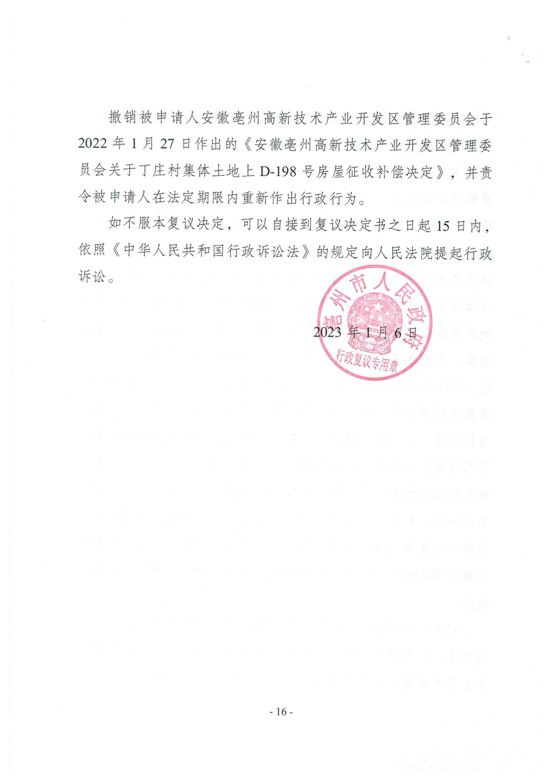 由本所张心升律师代理的安徽省亳州市谯城区丁先生等4人复议撤销安徽亳州高新技术产业开发区管理委员会作出的《D-198号房屋征收补偿决定》一案,经亳州市人民政府审理,于2023年1月6日作出《行政复议决定书》(亳复字[2022]140号),决定:撤销安徽亳州高新技术产业开发区管理委员会作出的《D-198号房屋征收补偿决定》,并责令其在法定期限内重新作出行政行为。申请人的复议请求全部得到支持,当事人的合法权益得到维护。