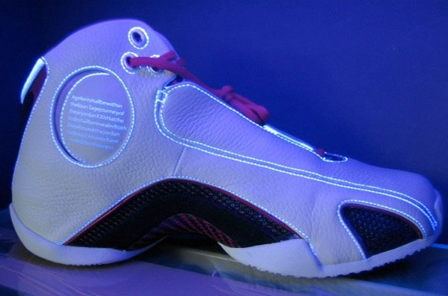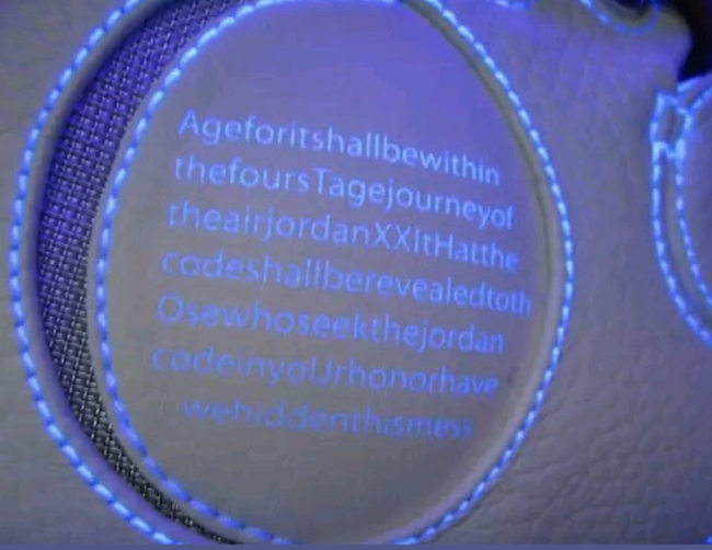 这个彩蛋设定就是使用紫外线照射鞋帮内侧用车线包裹的圆形内部,就会出现一段英文内容,拍下照片上传到当年 Jumpman23.com