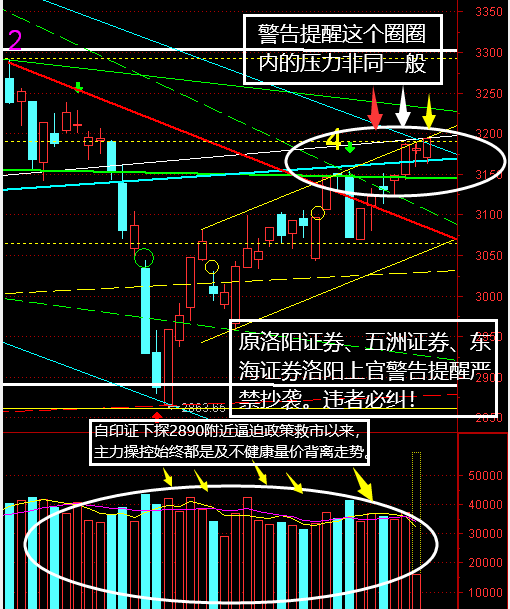 那大盘印证3月15日、16日(中午文章点评)主力配合政策维稳局部救市。大盘目前技术、盘面有哪些变化?不相信技术者肯定不会有这方面意识。建议投资者回头看看A股大盘K线技术图量价关系,是不是指数不断创新高,而成交量持续低迷不振畏缩不前?纯技术警告这是个明显风险信号。从时间窗口看2863所展开的政策维稳救市,其主力“量价背离”自拉自唱拉升大盘,已进入重要敏感时间窗口23个交易日威胁大盘回落可能极大。而我们从大盘长期、阶段性目前技术形态看?大盘的量价背离反弹,目前正在遭遇前期暴跌毁灭破坏的长期(2019年)特大上升通道下轨,以及3700点下跌切线和黄金分割(0.382)技术极大压力。当然还有很多技术在持续发出不祥警告信号我们不再一一解释了。