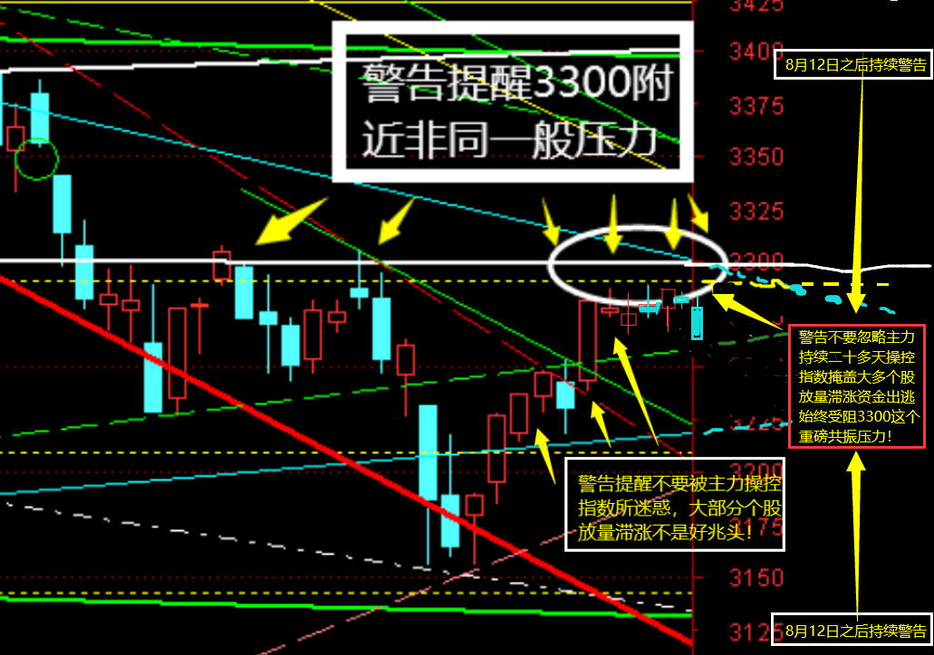 希望了解年前乃近期走势请重点关注上周四(8月11日)前瞻性、连续剧收盘点评:———主力维稳“权重股暴涨”谨防再冲3300再杀跌!为什么点评主力维稳疯控权重股群体暴涨,谨防大盘再冲击3300附近再杀跌?谈论这个话题我们必须稍安勿躁切合实际立足三个方面来讨论这个重要话题。首先我们投资者必须认真观察周四主力操控拉升指数过程中的“量价关系”能否满足大盘进一步上升动力,必须观察主力操控市场过程中绝大多个股的“量价关系”能否支持大盘继续上升?否则那些墙头草股评家大肆唱多只能自欺欺人。而周四盘面表现究竟如何?毫无疑问早盘集合竞价盘面凸显又……是主力装神弄鬼操控所有高价股、巨无霸,以及操控所有重量级板块配合维稳“虚张声势”闪电操控指数。而绝……大多个股全天自始至终都处于放量滞涨原地踏步走或冲高回落走势。主力全天操控拉升指数收盘上涨1.60%情况下。而主力操控拉升的金融指数、超大盘指数、券商、保险、航空……分别就暴涨5.03%、2.20%、5.51%、4.10%、3.00%。而且这些重量级板块个股的成交量明显不足。充分显示是主力主力重仓所造成指数虚张声势上升。试问这种及不健康盘面能持续大盘继续上升吗?