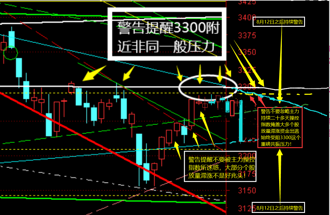 希望把握市场机会,回避市场风险朋友务必认真阅读下面粘贴8月11日长期、阶段性“登高望远”前瞻性连续剧点评:———主力维稳“权重股暴涨”谨防再冲3300再杀跌!为什么点评主力维稳疯控权重股群体暴涨,谨防大盘再冲击3300附近再杀跌?谈论这个话题我们必须稍安勿躁切合实际立足三个方面来讨论这个重要话题。其一:首先我们投资者必须认真观察周四主力操控拉升指数过程中的“量价关系”能否满足大盘进一步上升动力,必须观察主力操控市场过程中绝大多个股的“量价关系”能否支持大盘继续上升?否则那些墙头草股评家大肆唱多只能自欺欺人。而周四(8月11日)盘面表现究竟如何?毫无疑问早盘集合竞价盘面凸显又……是主力装神弄鬼操控所有高价股、巨无霸,以及操控所有重量级板块配合维稳“虚张声势”闪电操控指数。而绝……大多个股全天自始至终都处于放量滞涨原地踏步走或冲高回落走势。主力全天操控拉升指数收盘上涨1.60%情况下。而主力操控拉升的金融指数、超大盘指数、券商、保险、航空……分别就暴涨5.03%、2.20%、5.51%、4.10%、3.00%。而且这些重量级板块个股的成交量明显不足。充分显示是主力主力重仓所造成指数虚张声势上升。试问这种及不健康盘面能持续大盘继续上升吗?