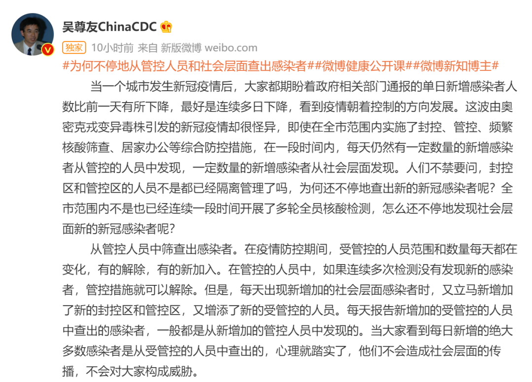 近日,中国疾控中心流行病学首席专家吴尊友在个人微博发布文章,解答为何不停从管控人员和社会面查出感染者等相关话题。全文如下: