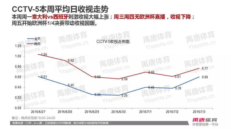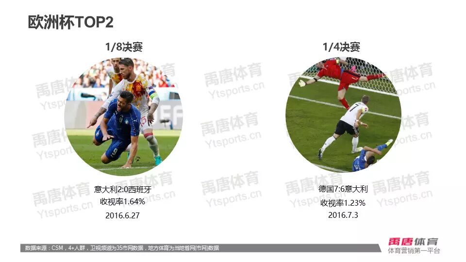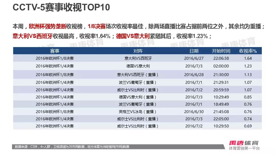 赛事方面,欧洲杯再度强势垄断收视榜,1/8决赛收视最佳,意大利VS西班牙收视最高,收视率1.64%。